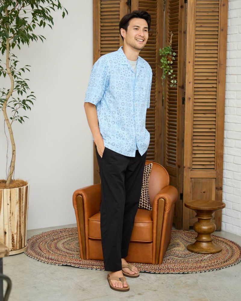 バンダナモチーフのプリントを施したオープンカラーシャツです。綿レーヨン混素材で柔らかな風合いに仕上げました。サイズ感はややゆったりとしたリラックスシルエットです。 モデル身長: 180 cm 着用サイズ: L サイズ Golden Bear Men's シャツ (Men's) 同デザイン大きい(3L,4Lサイズ)はこちら 【着用アイテム】314R4710 イージーパンツ 314R5701 スラックス 314R6530 国旗ベアTシャツ