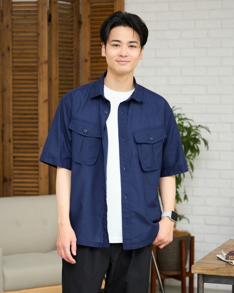 ワークテイストに仕上げたオーバーシャツです。表情のあるサッカー組織のマイクロチェック生地を使用しています。胸のダブルポケットが実用的で、軽い羽織りとしてリラックスしたスタイリングを演出します。 モデル身長: 176 cm 着用サイズ: L サイズ Golden Bear Men's シャツ (Men's) 【着用アイテム】314R7710 ワイドイージーパンツ