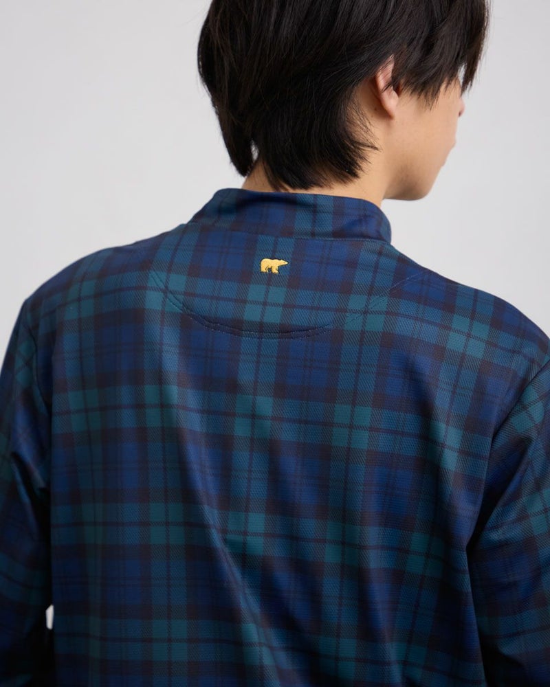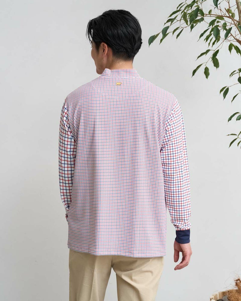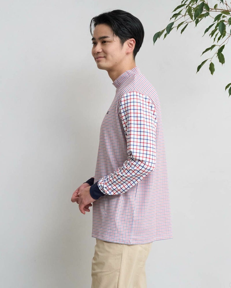 見た目はトラッド、中身はハイテクな人気の高機能モックネックです。クラシックなトラッド柄デザインながらも、吸水速乾性・UV加工に優れた機能素材。汗ばむ季節や日差しが強い日でも快適にゴルフを楽しめる、まさに今シーズンのイチオシアイテム。一枚で着て主役にするのはもちろん、ジャケットやブルゾンのインナーとして襟元をちらりと見せてもおしゃれ。あなたのおしゃれをワンランクアップさせる、頼れる一枚です。