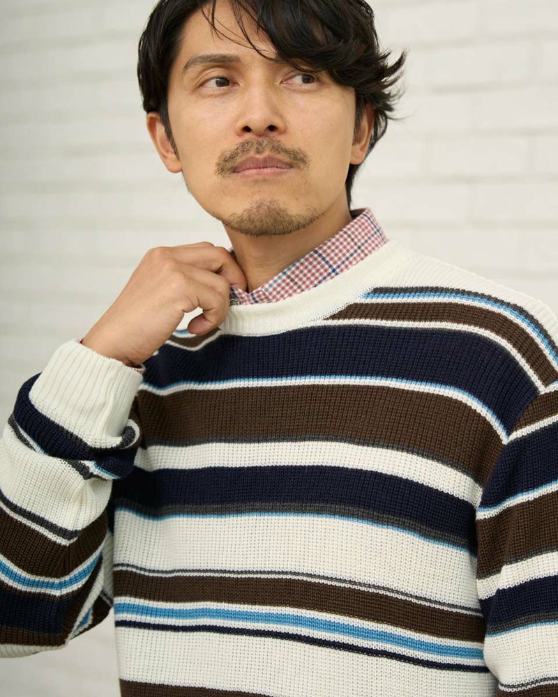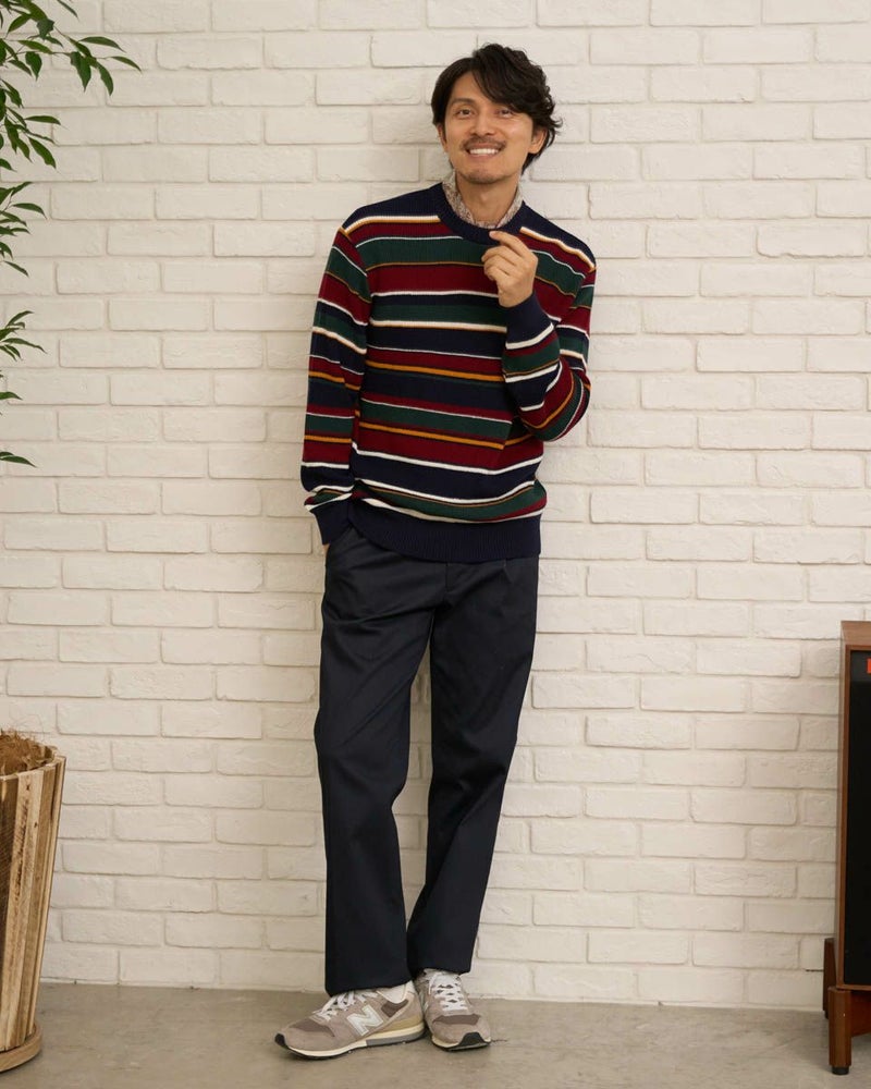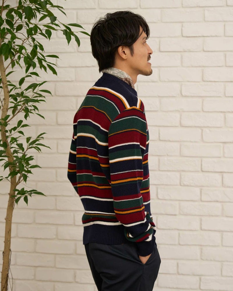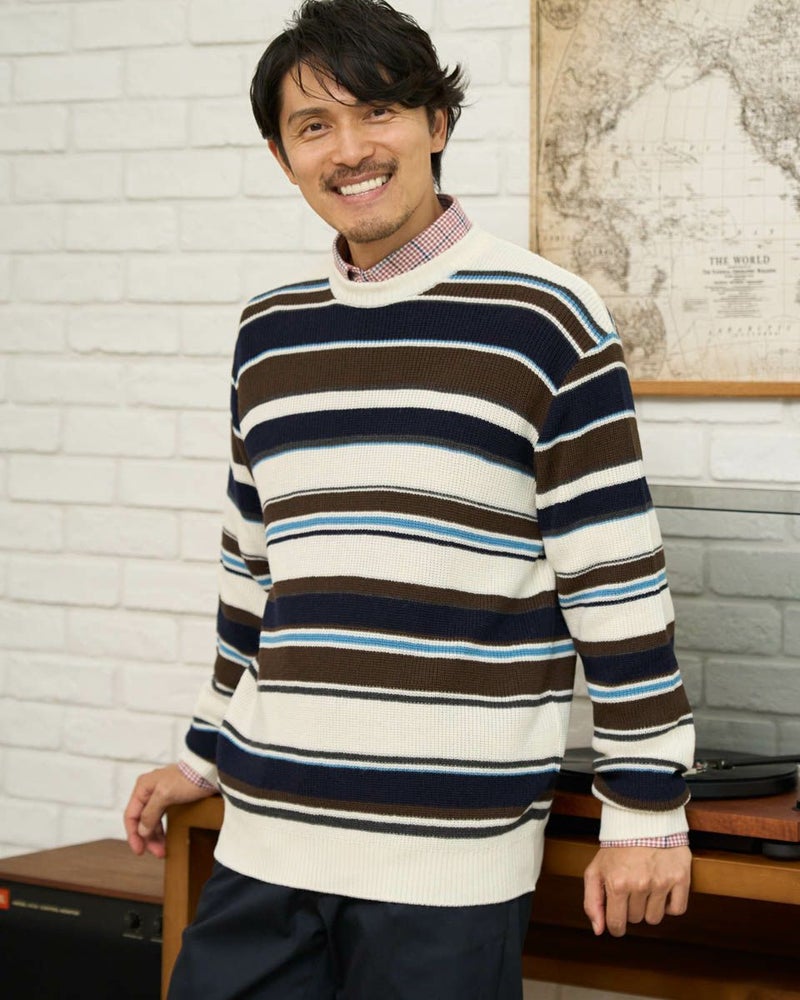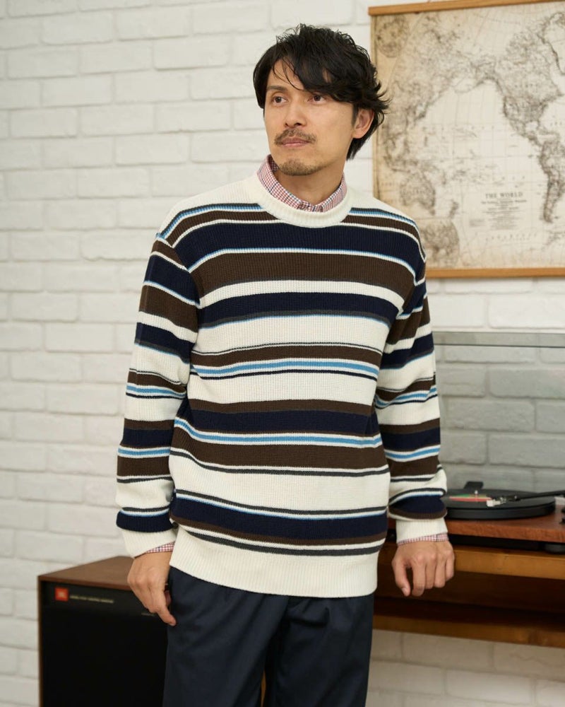 畦編みのボーダークルーネックニットです。ウール/アクリル混素材で編みたて、程よい肉感で柔らかな風合いに仕上げました。家庭洗濯(手洗い)が可能です。