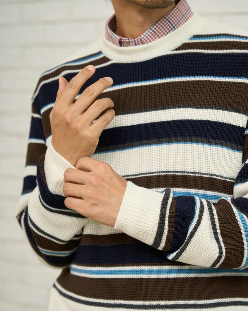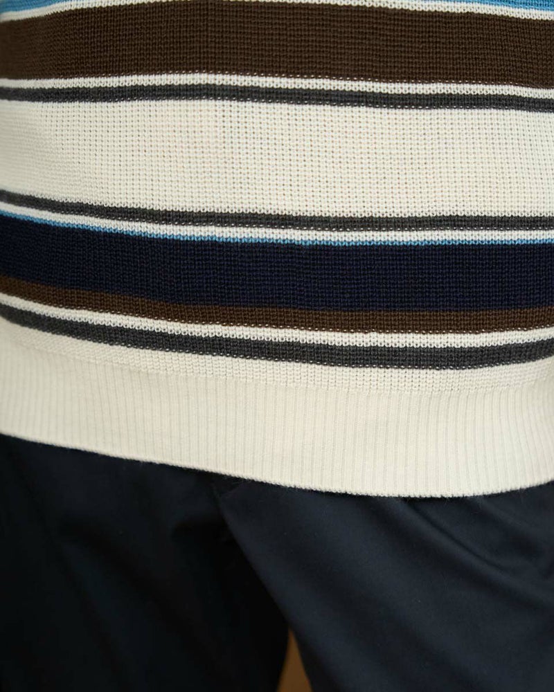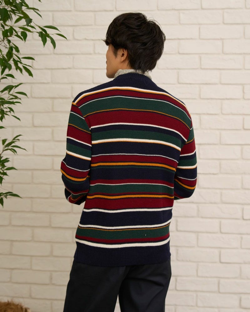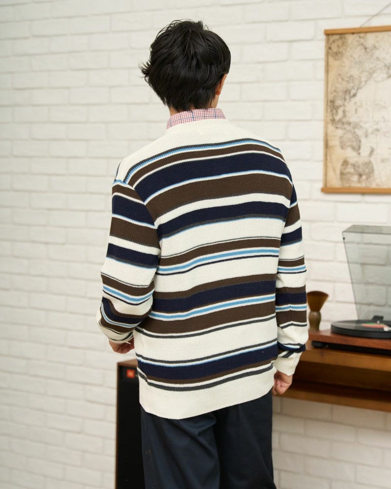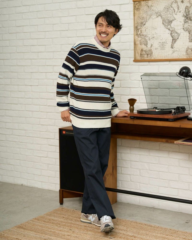 畦編みのボーダークルーネックニットです。ウール/アクリル混素材で編みたて、程よい肉感で柔らかな風合いに仕上げました。家庭洗濯(手洗い)が可能です。