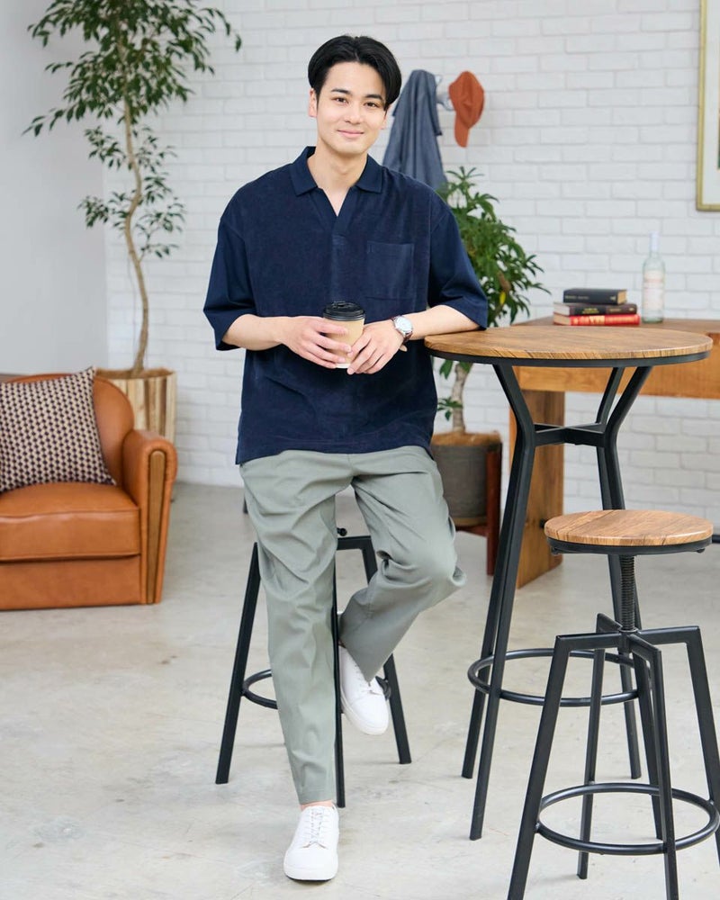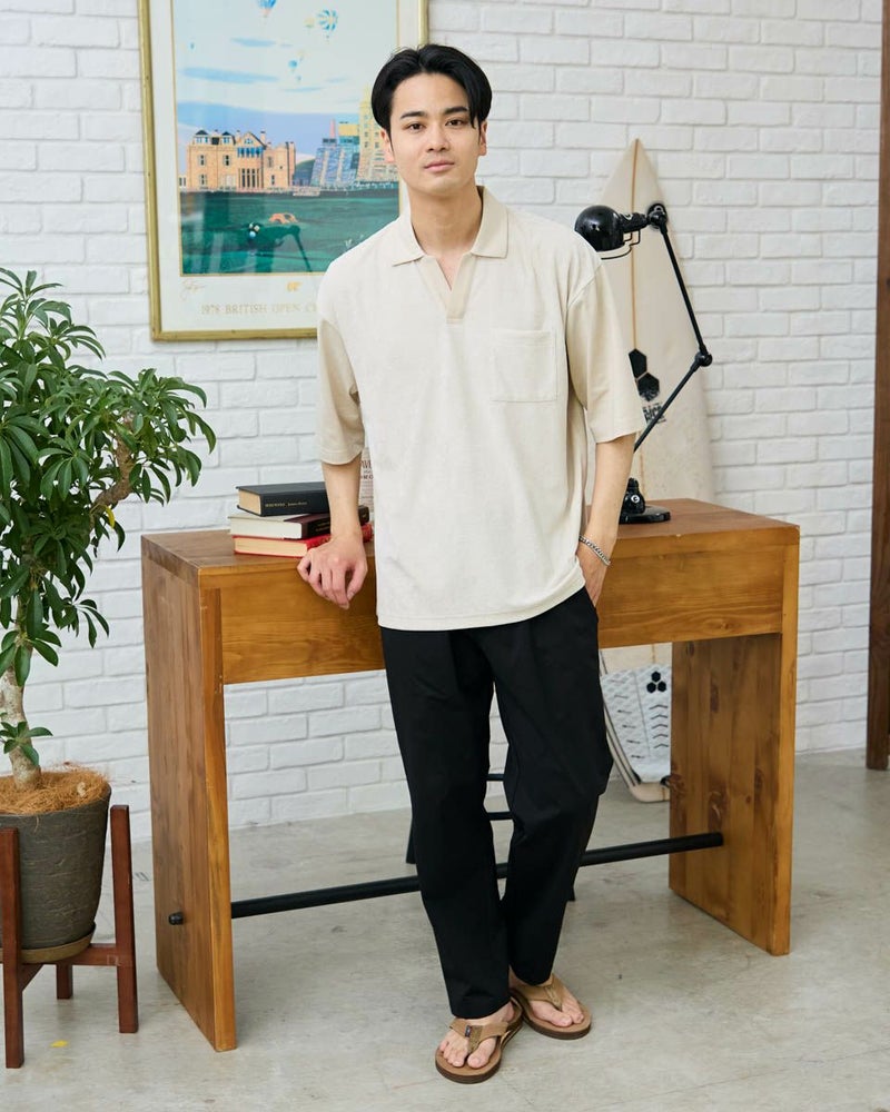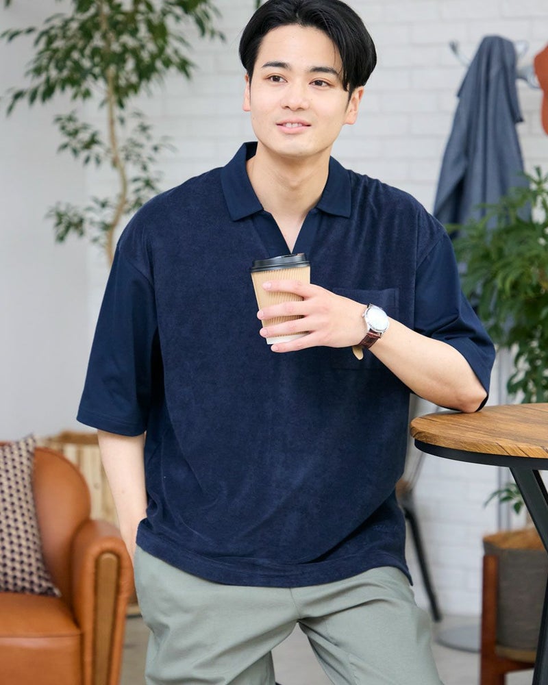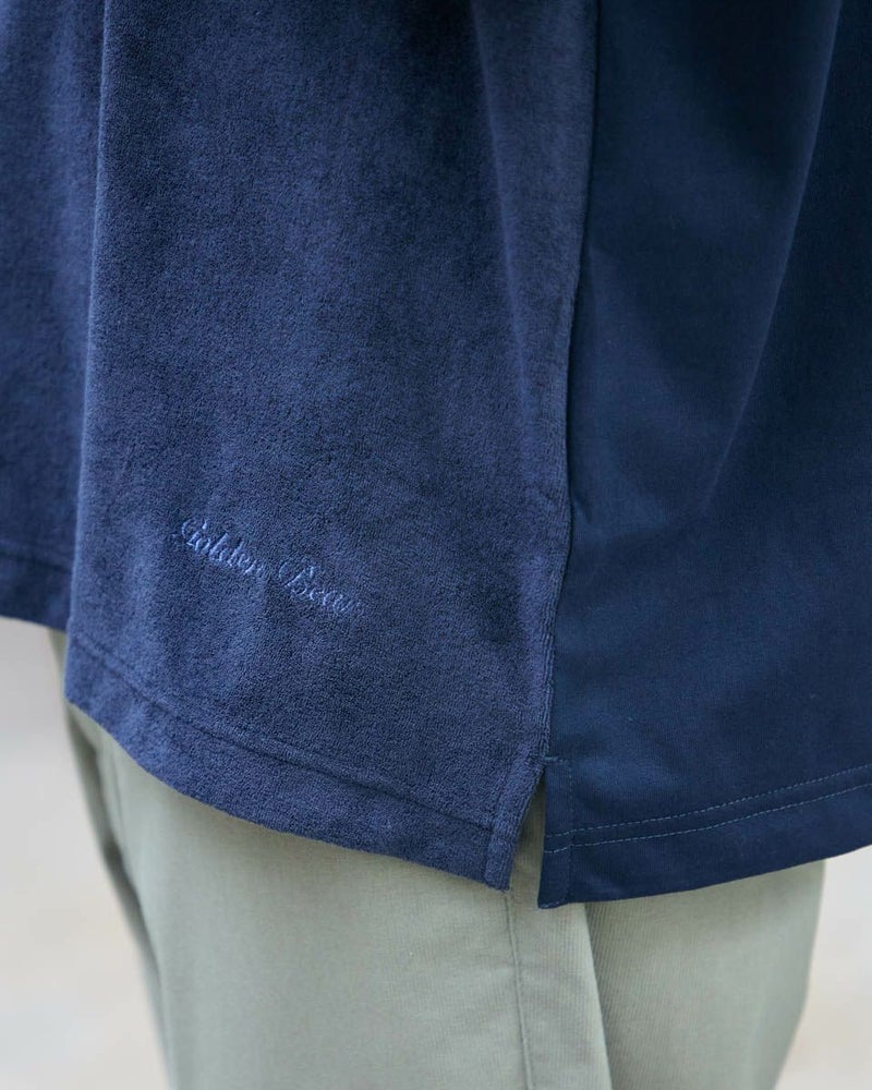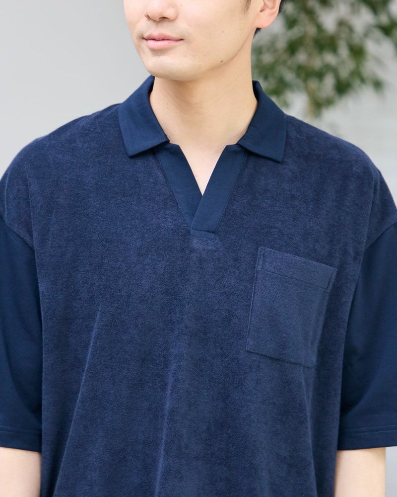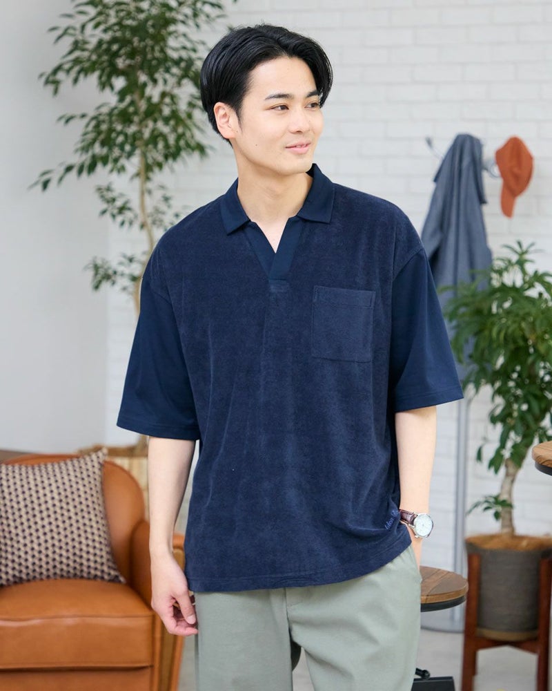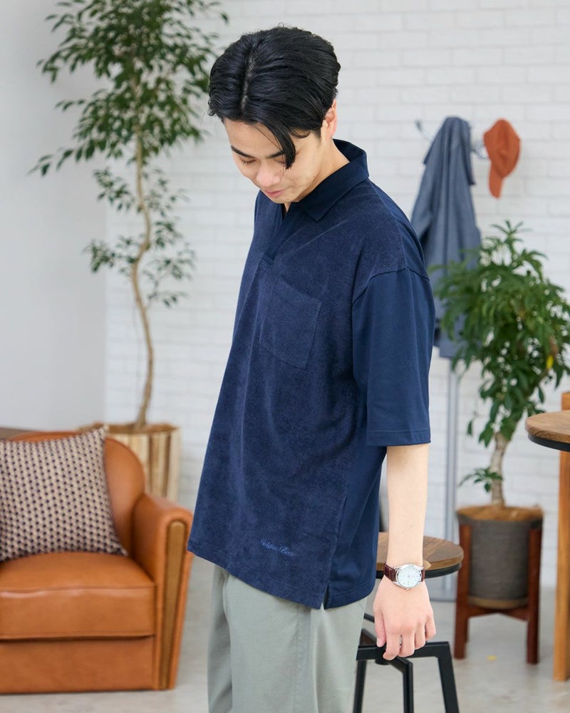 同色の異なる生地で切り替えたスキッパーポロシャツです。前身頃は表情のあるミニパイル地、袖・後身頃は天竺生地を使用しています。サイズ感はややゆったりとしたリラックスシルエットです。 モデル身長: 176 cm 着用サイズ: L サイズ Golden Bear MEN カットソー (MEN) 【着用アイテム】314R3704 超ストレッチパンツ 314R4710 イージーパンツ
