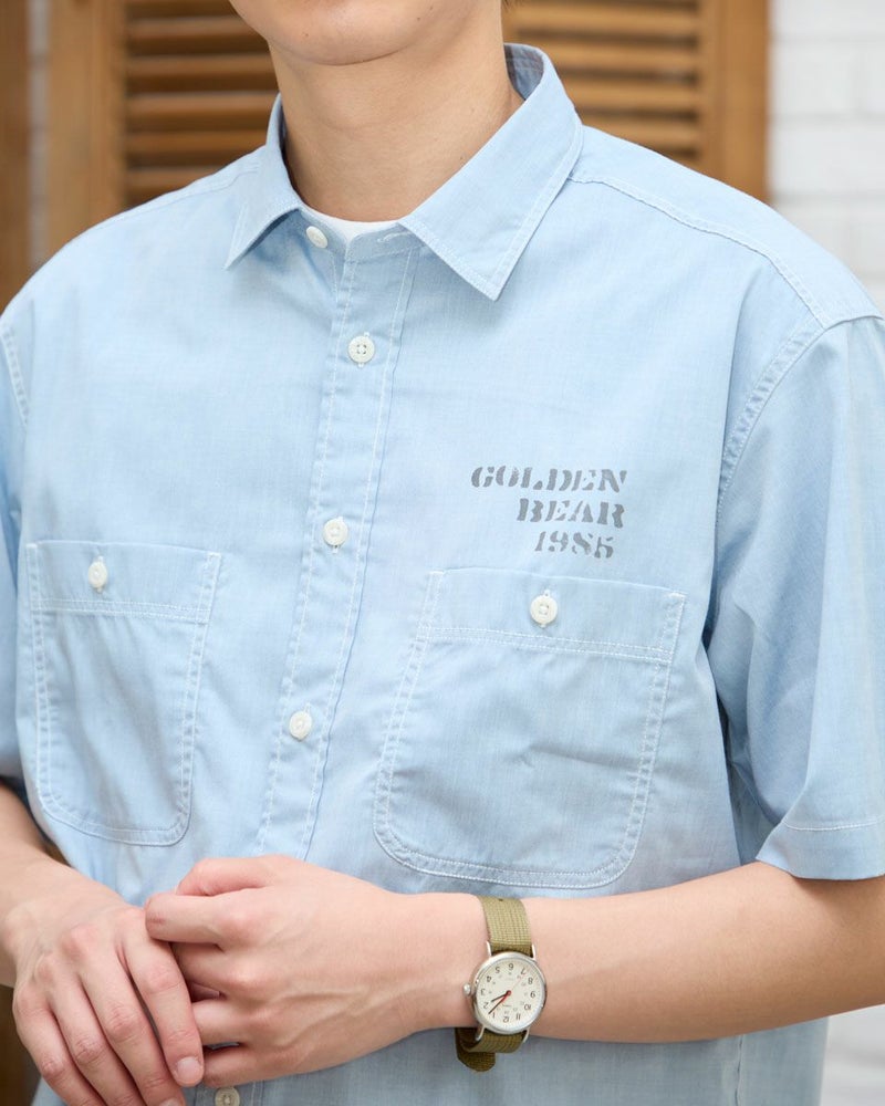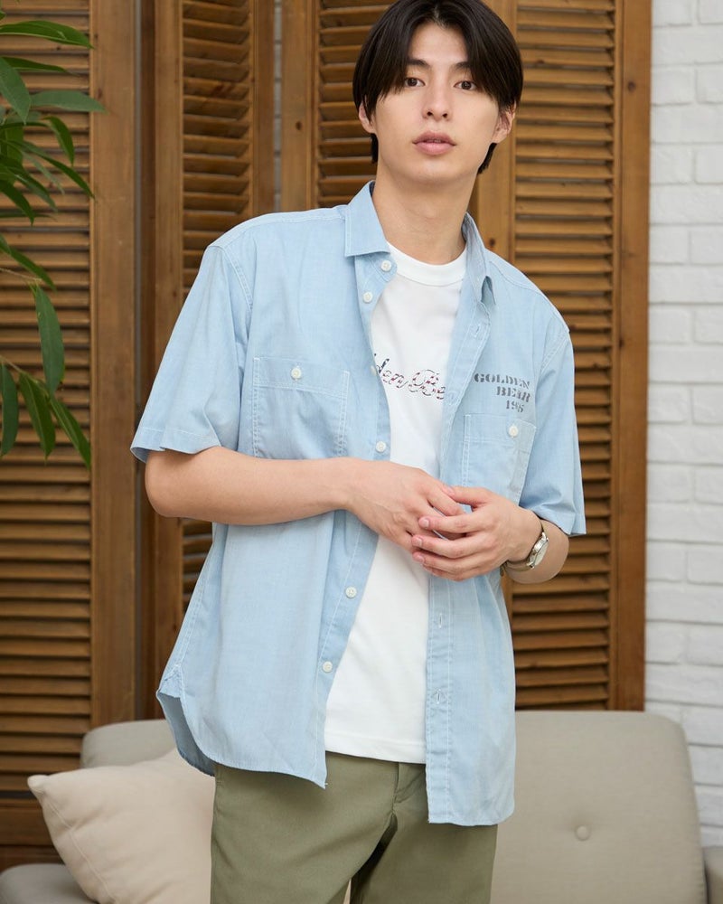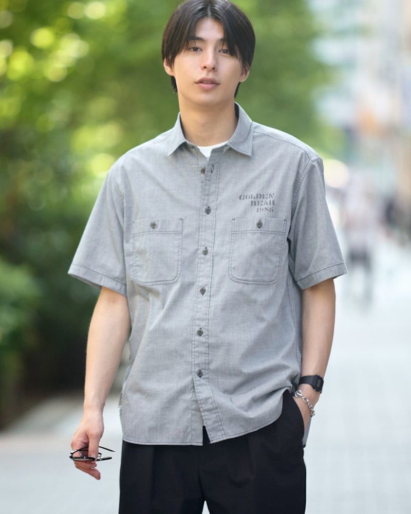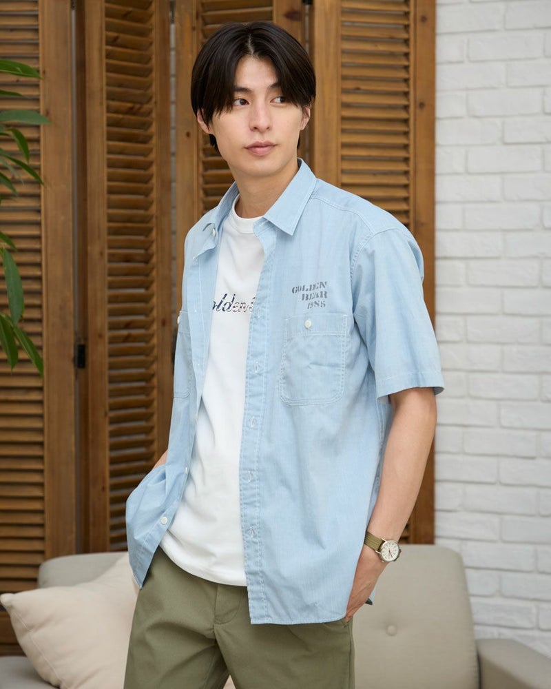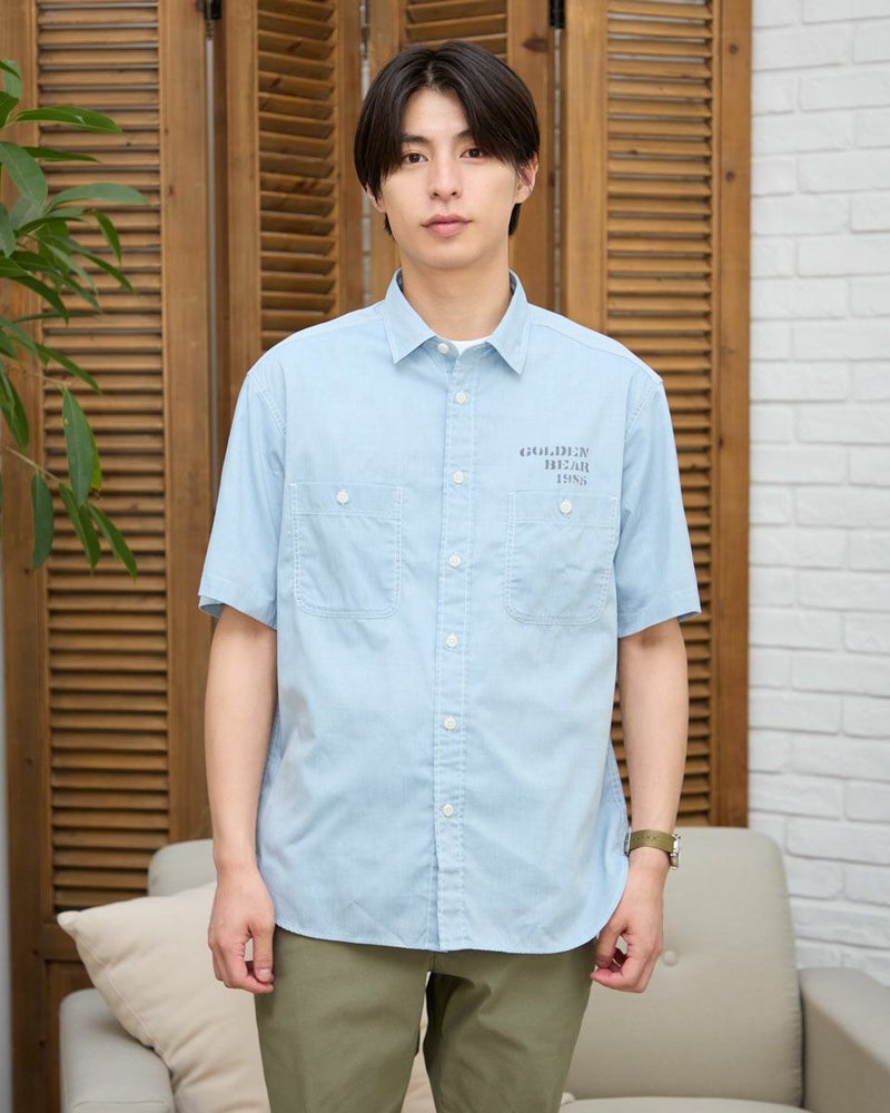 レギュラー襟のプリントシャツです。涼感のあるシャンブレー生地にロゴモチーフプリントを施しました。大きめな胸のダブルポケットの収納力も魅力です。 モデル身長: 180 cm 着用サイズ: L サイズ Golden Bear MEN シャツ (MEN) 同デザイン大きい(3L,4Lサイズ)はこちら 【着用アイテム】314R7511 ロゴTシャツ 314R7710 ワイドイージーパンツ
