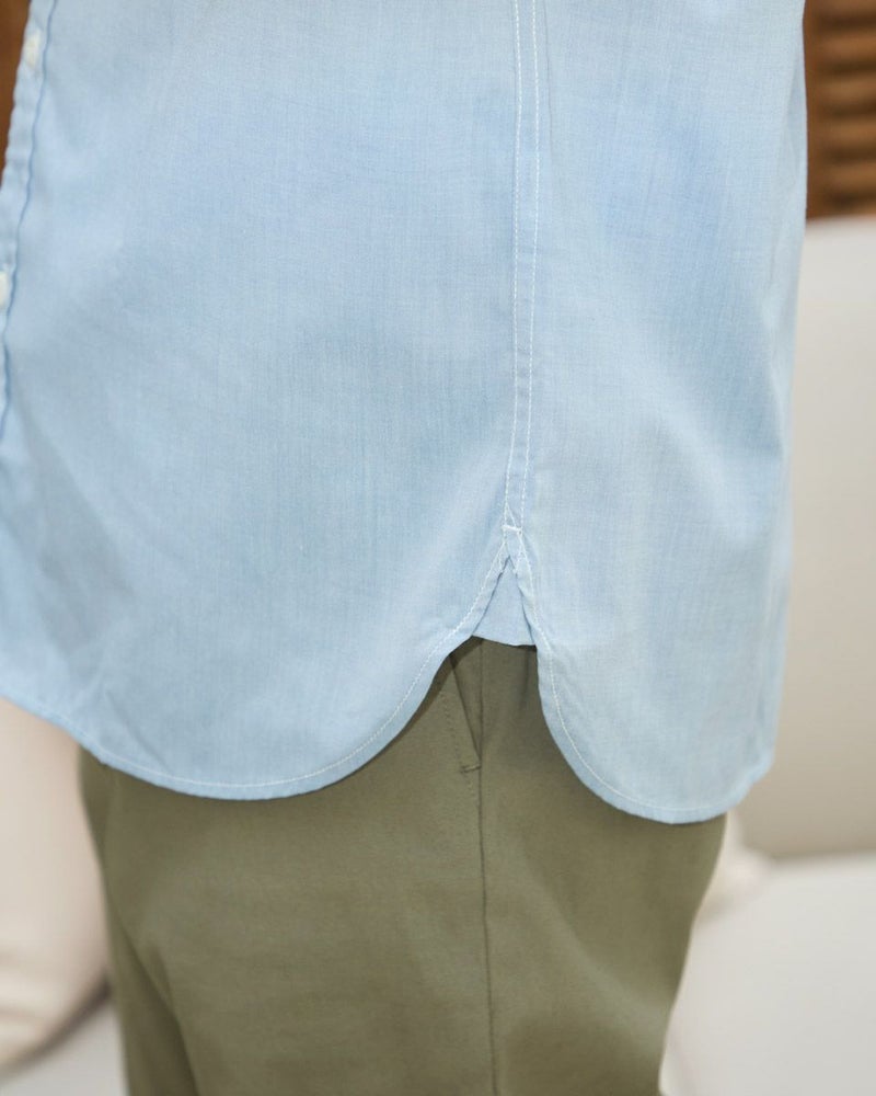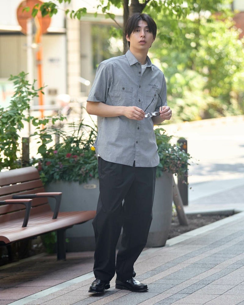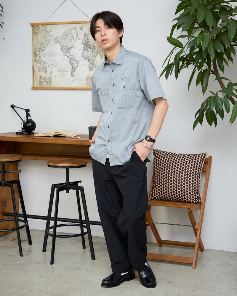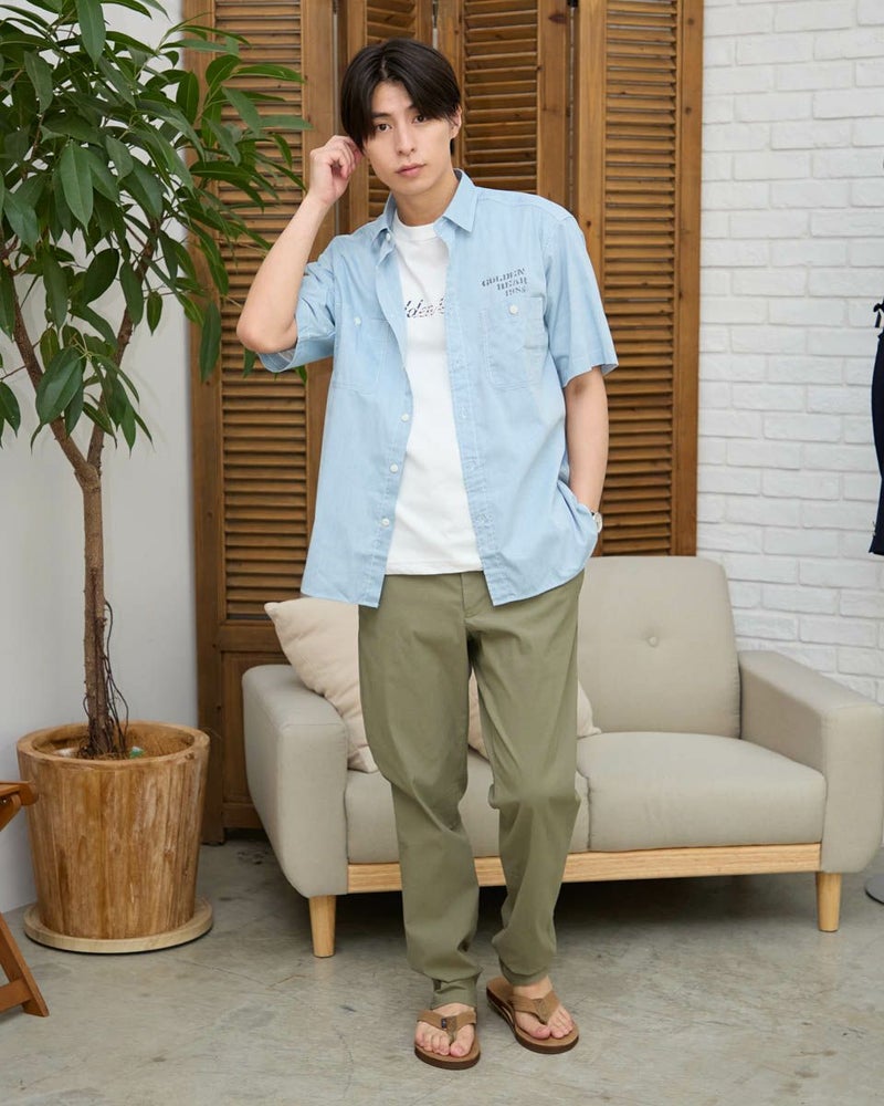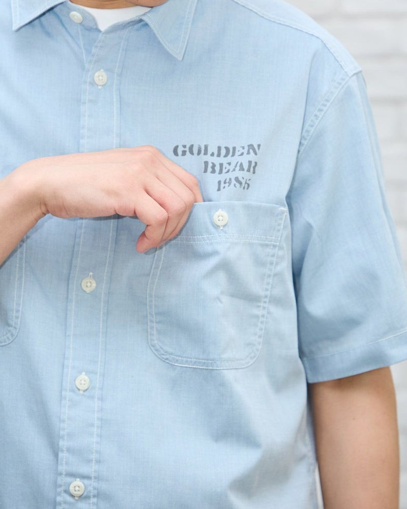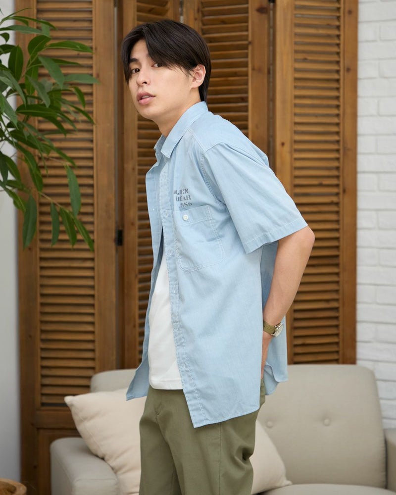 レギュラー襟のプリントシャツです。涼感のあるシャンブレー生地にロゴモチーフプリントを施しました。大きめな胸のダブルポケットの収納力も魅力です。 モデル身長: 180 cm 着用サイズ: L サイズ Golden Bear MEN シャツ (MEN) 同デザイン大きい(3L,4Lサイズ)はこちら 【着用アイテム】314R7511 ロゴTシャツ 314R7710 ワイドイージーパンツ