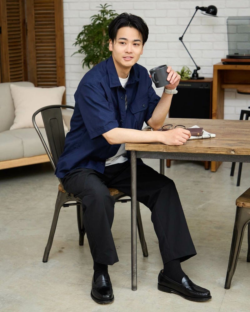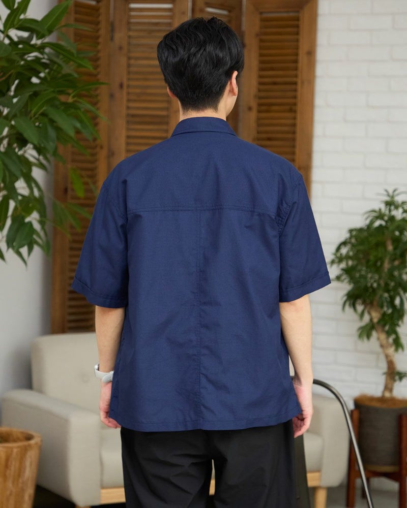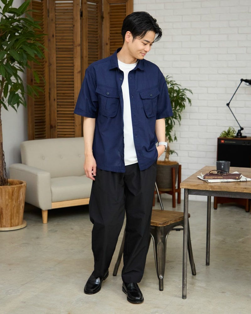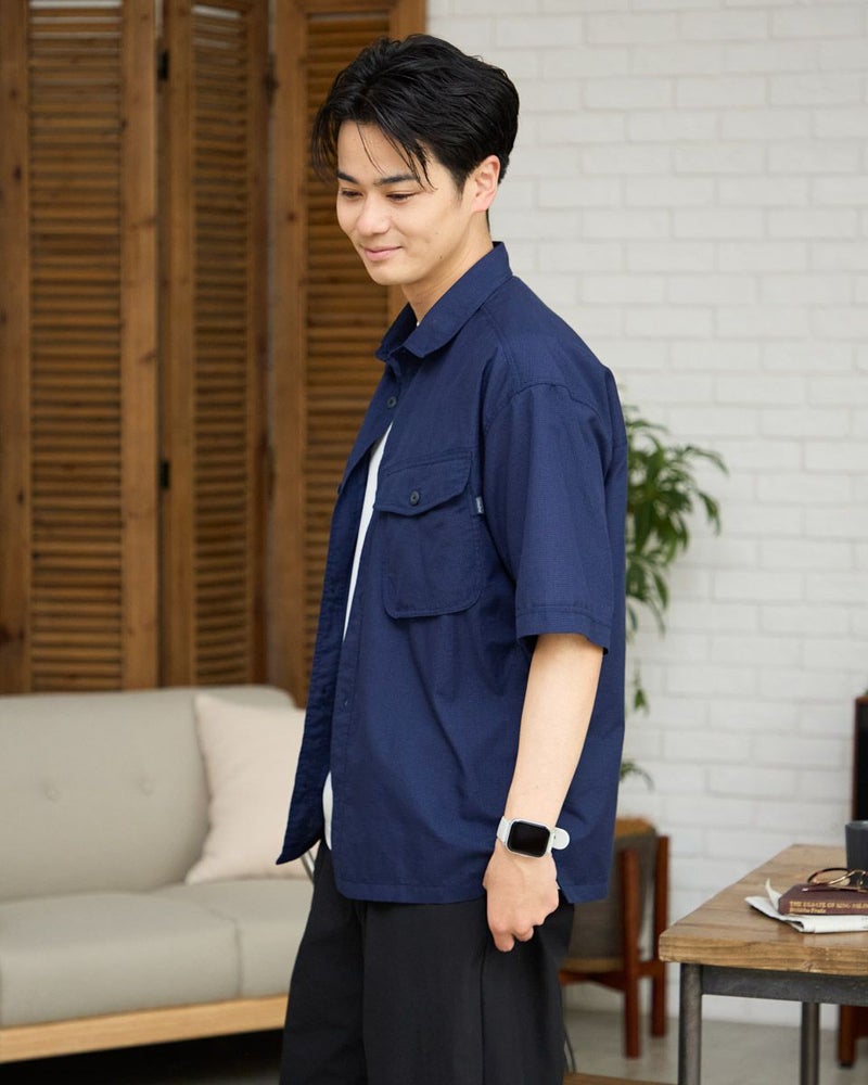 ワークテイストに仕上げたオーバーシャツです。表情のあるサッカー組織のマイクロチェック生地を使用しています。胸のダブルポケットが実用的で、軽い羽織りとしてリラックスしたスタイリングを演出します。