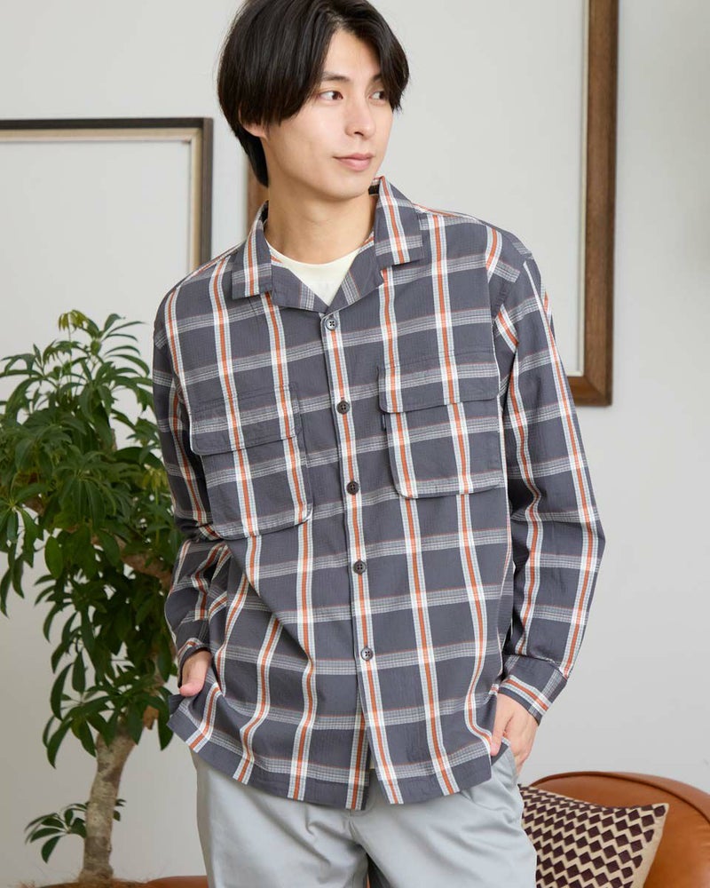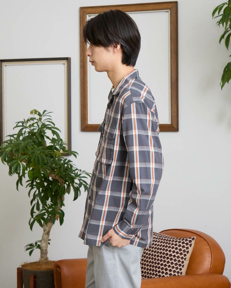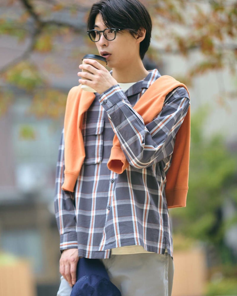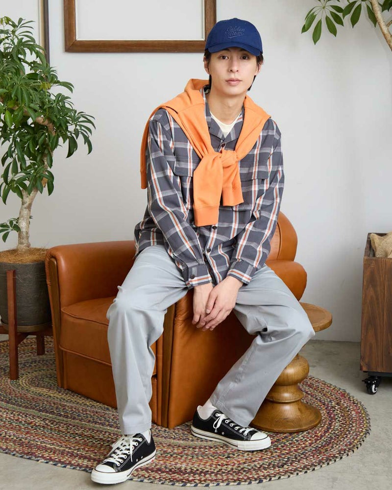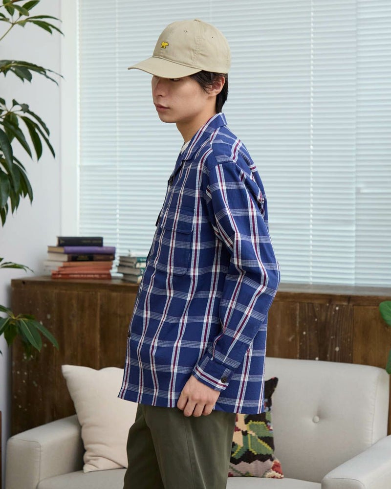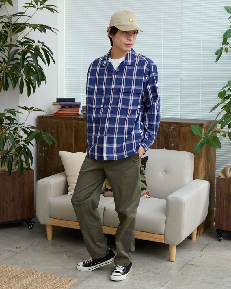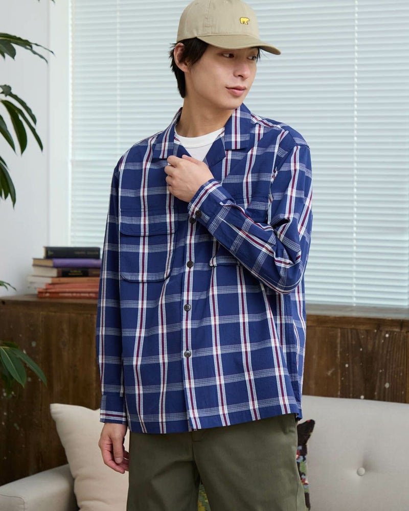 リップストップのような格子地柄が入ったオープンカラーシャツです。心地よいハリ感と色合いがスポーティーな印象を与える大柄チェックです。ややゆったりとしたサイズ感です。Tシャツの上に羽織るカジュアルスタイルがおすすめです。実用性とデザイン性を兼ね備えた大きめのマチ付きフラップポケットがポイントです。 モデル身長: 180 cm 着用サイズ: L サイズ Golden Bear MEN シャツ (MEN) 【着用アイテム】314RC003 ウォッシュキャップ 314RC414 ハーフZIPスウェット 314RC704 イージーパンツ