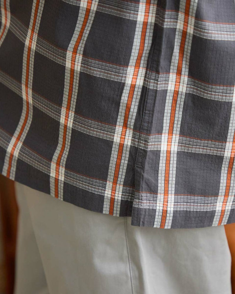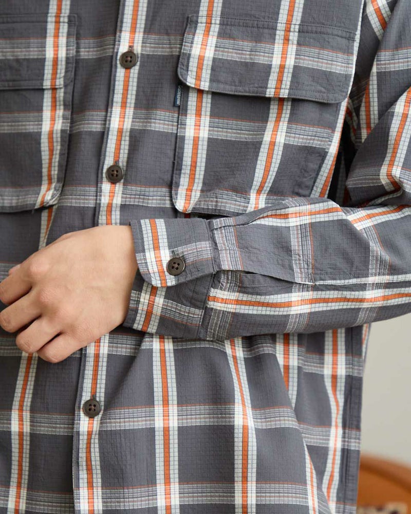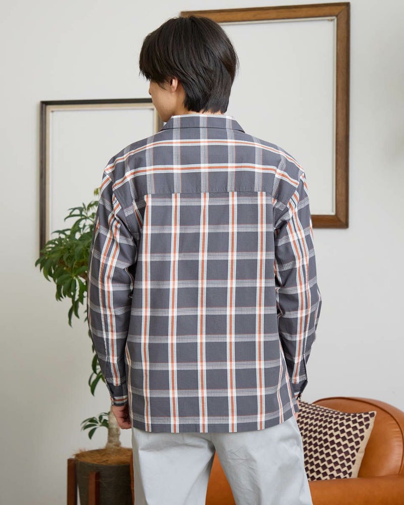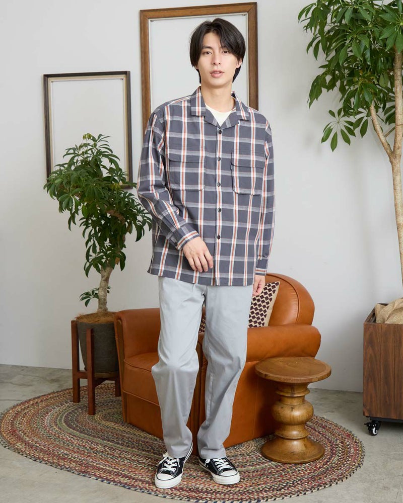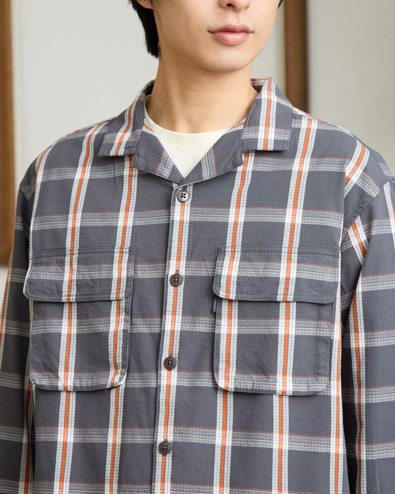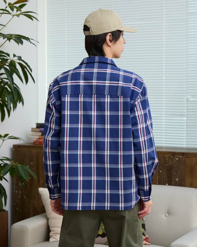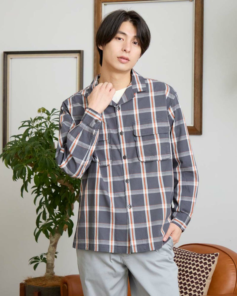 リップストップのような格子地柄が入ったオープンカラーシャツです。心地よいハリ感と色合いがスポーティーな印象を与える大柄チェックです。ややゆったりとしたサイズ感です。Tシャツの上に羽織るカジュアルスタイルがおすすめです。実用性とデザイン性を兼ね備えた大きめのマチ付きフラップポケットがポイントです。 モデル身長: 180 cm 着用サイズ: L サイズ Golden Bear MEN シャツ (MEN) 【着用アイテム】314RC003 ウォッシュキャップ 314RC414 ハーフZIPスウェット 314RC704 イージーパンツ