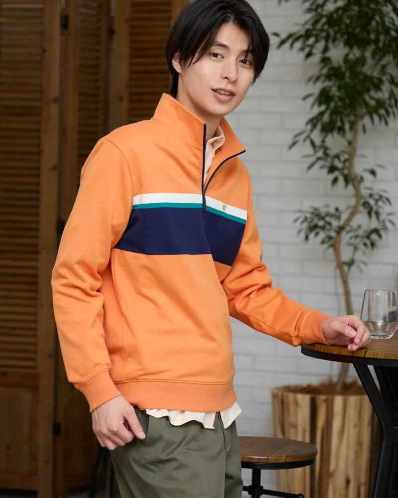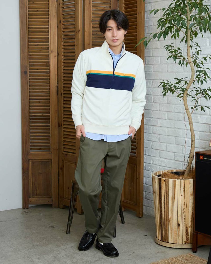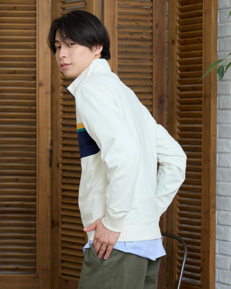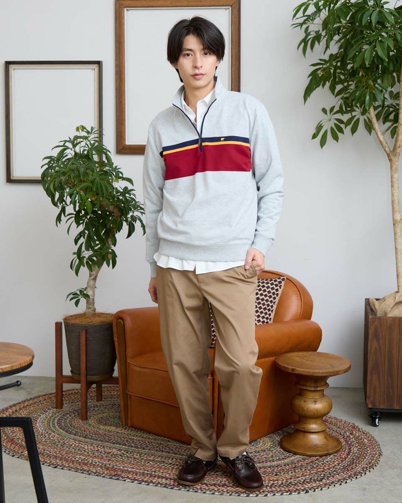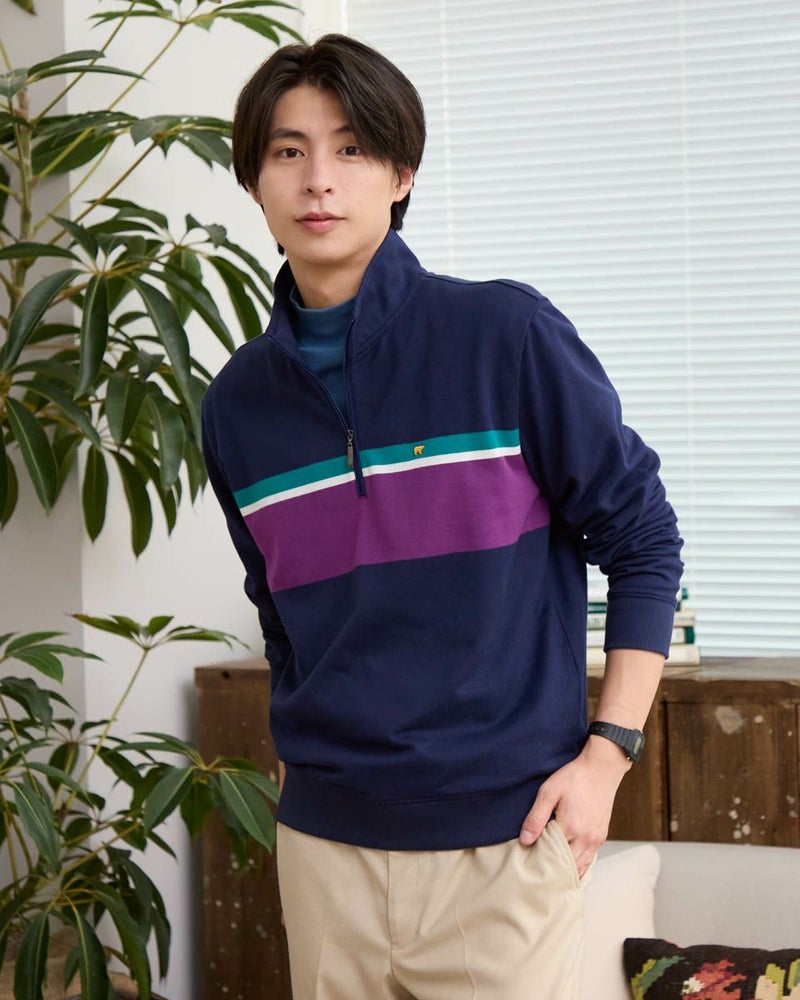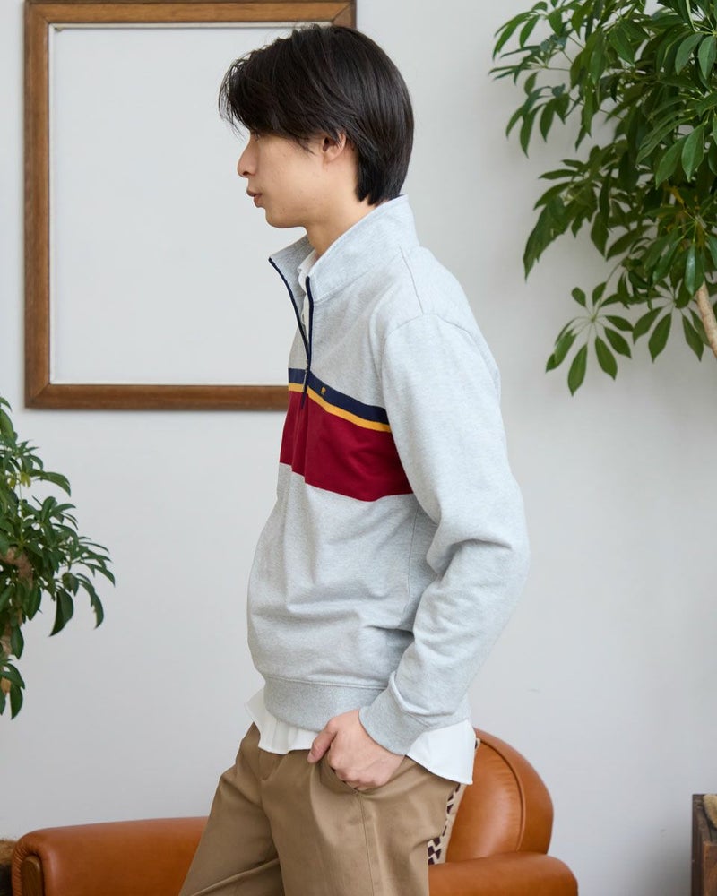 ラガーシャツのようなボーダー配色が特徴のハーフZIPスウェットです。柔らかな風合いに仕上げたインレー組織の生地を使用しています。スラックスやテーパードパンツと合わせることで、スポーティーさを抑え落ち着いた雰囲気を演出します。