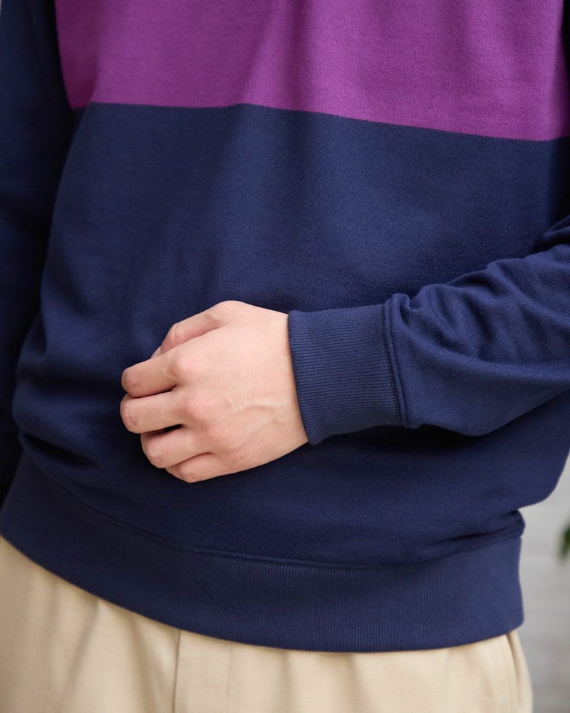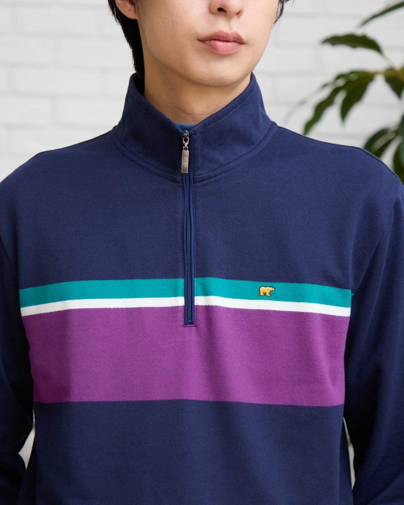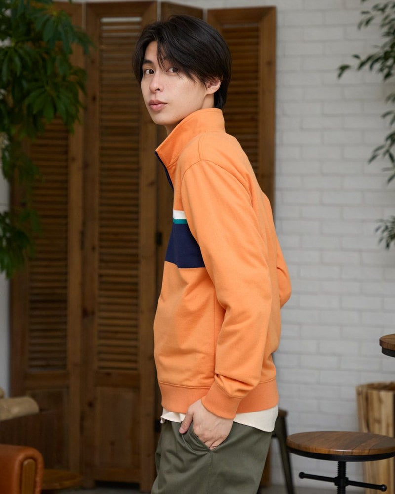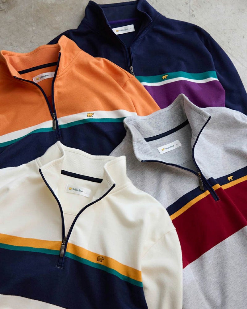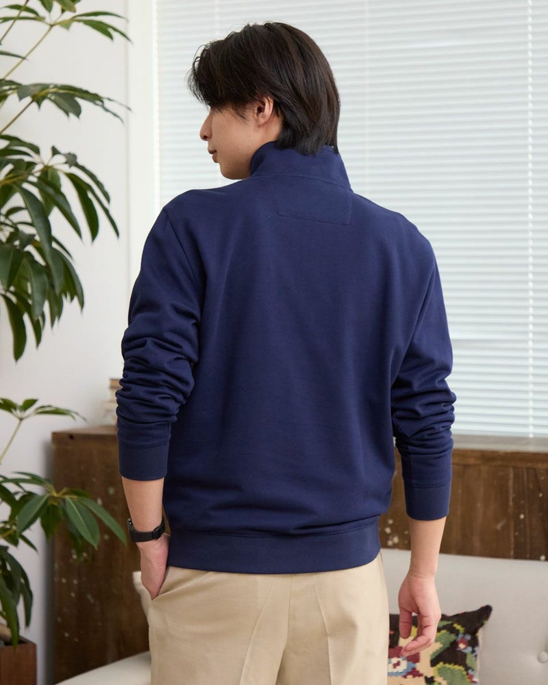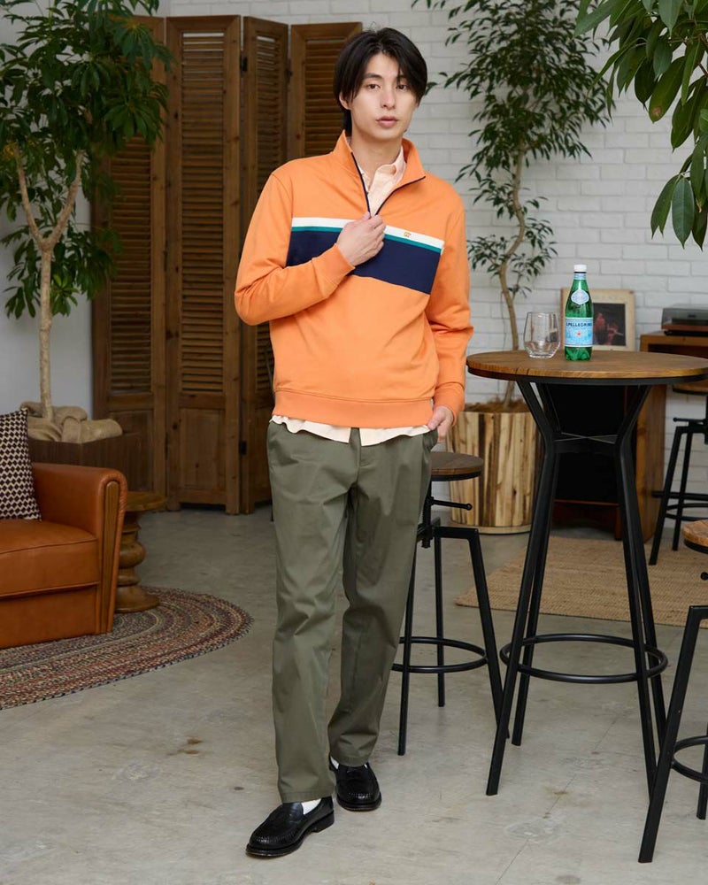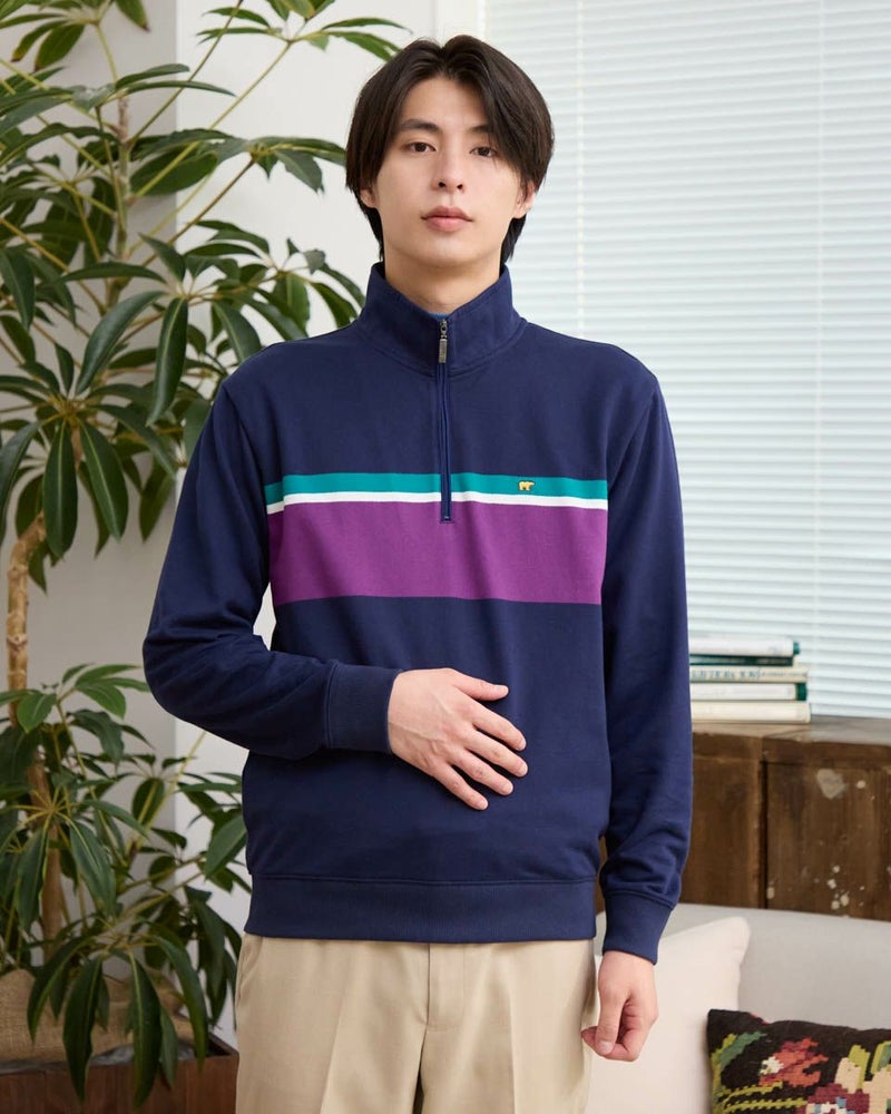ラガーシャツのようなボーダー配色が特徴のハーフZIPスウェットです。柔らかな風合いに仕上げたインレー組織の生地を使用しています。スラックスやテーパードパンツと合わせることで、スポーティーさを抑え落ち着いた雰囲気を演出します。