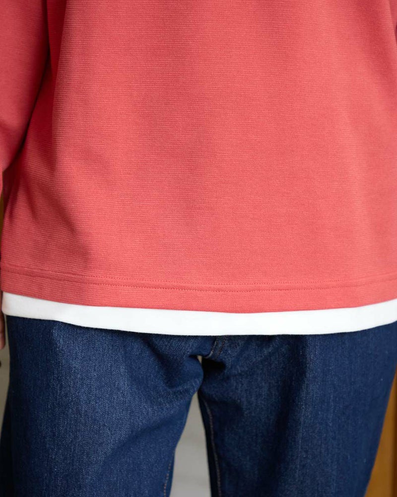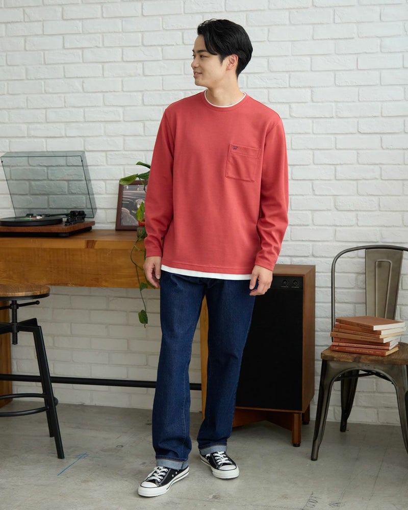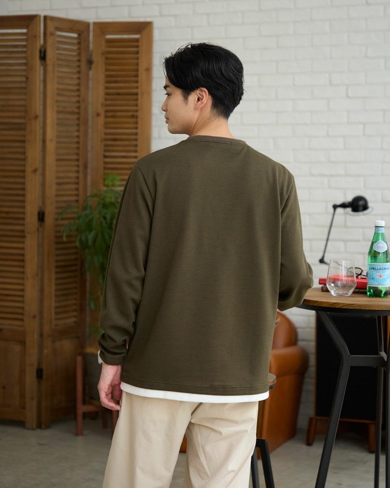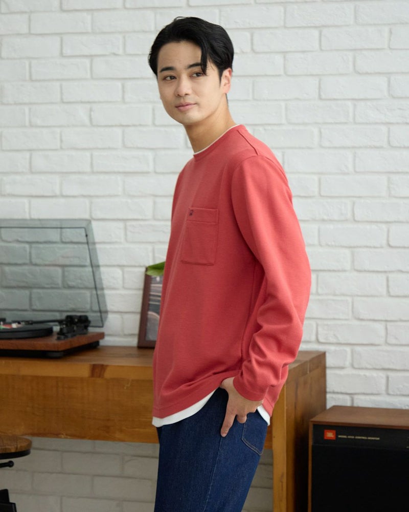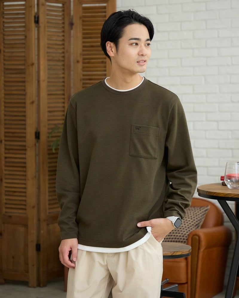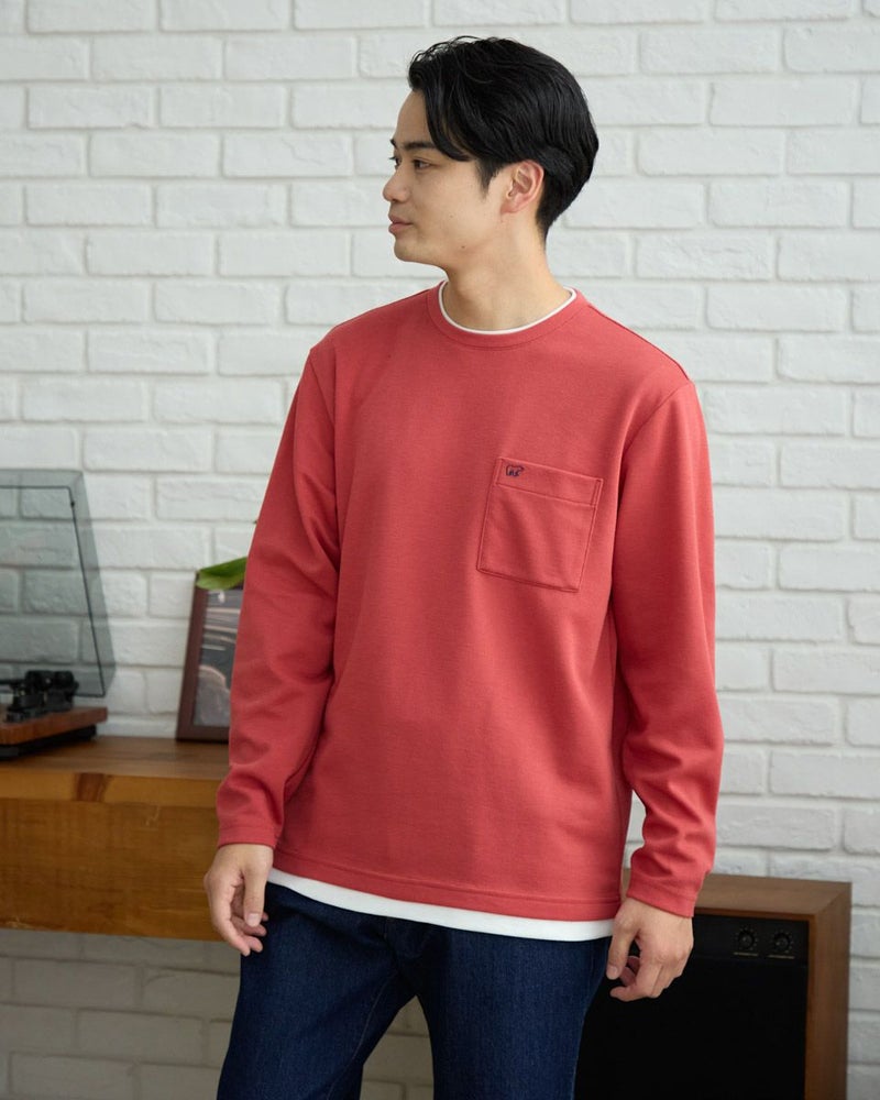 表面に横畝のあるリップル素材を使用した長袖Tシャツです。素材に適度なハリと厚みがあるので、通常の天竺のTシャツに比べて身体のラインを拾わないのが特徴です。襟を配色のレイヤードにしてアクセントにしています。 モデル身長: 176 cm 着用サイズ: L サイズ Golden Bear MEN カットソー (MEN) 【着用アイテム】314RD131 キルトジャケット 314R8702 デニム 314RC700 ワイドチノ