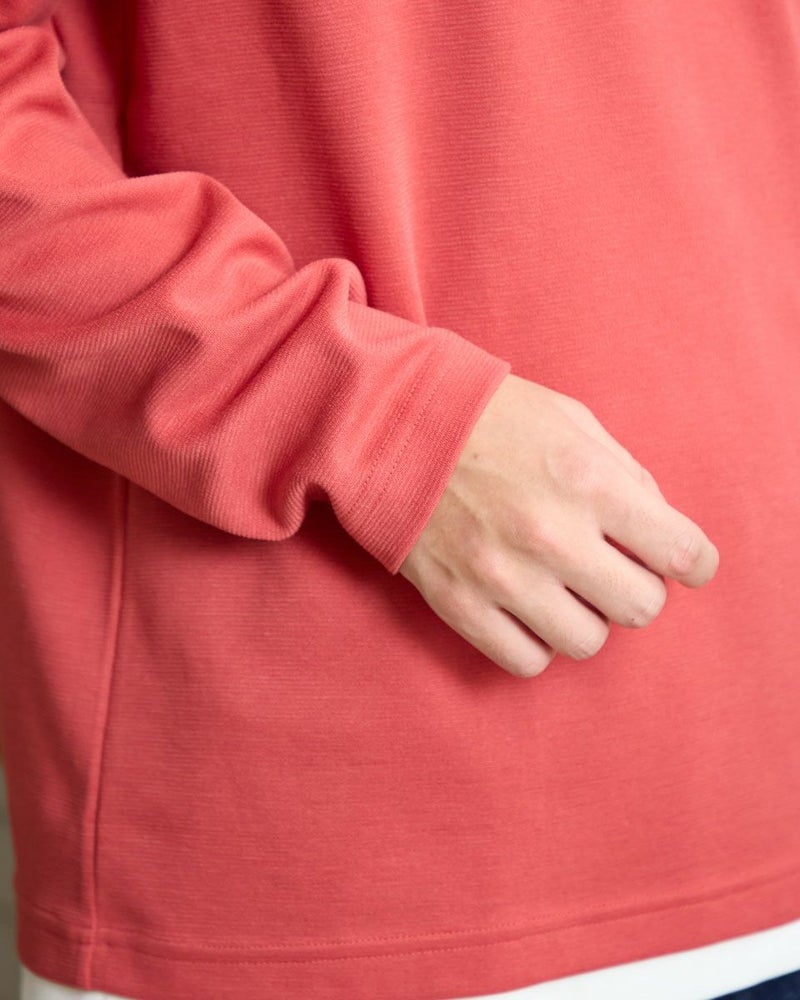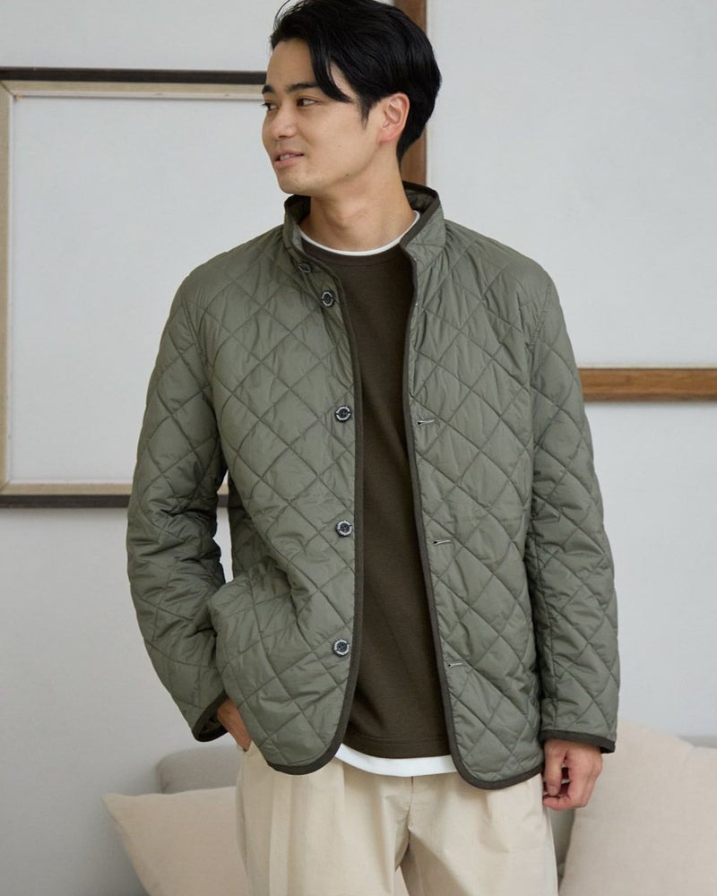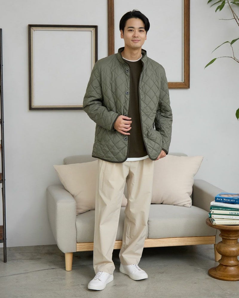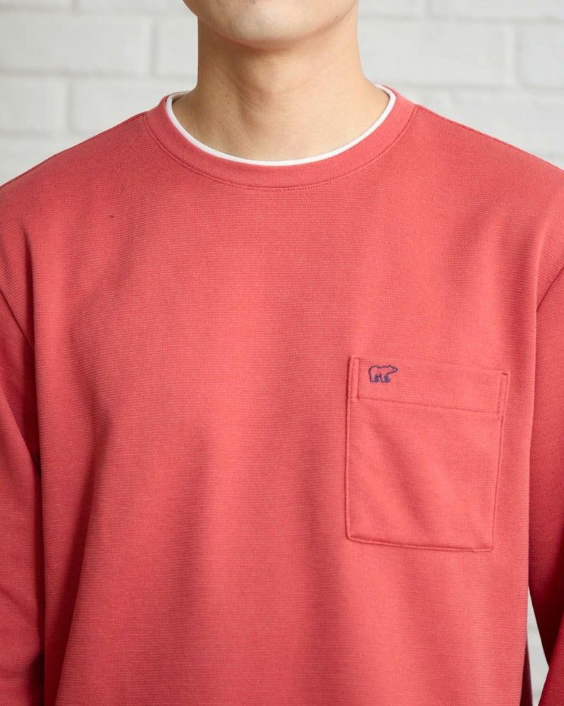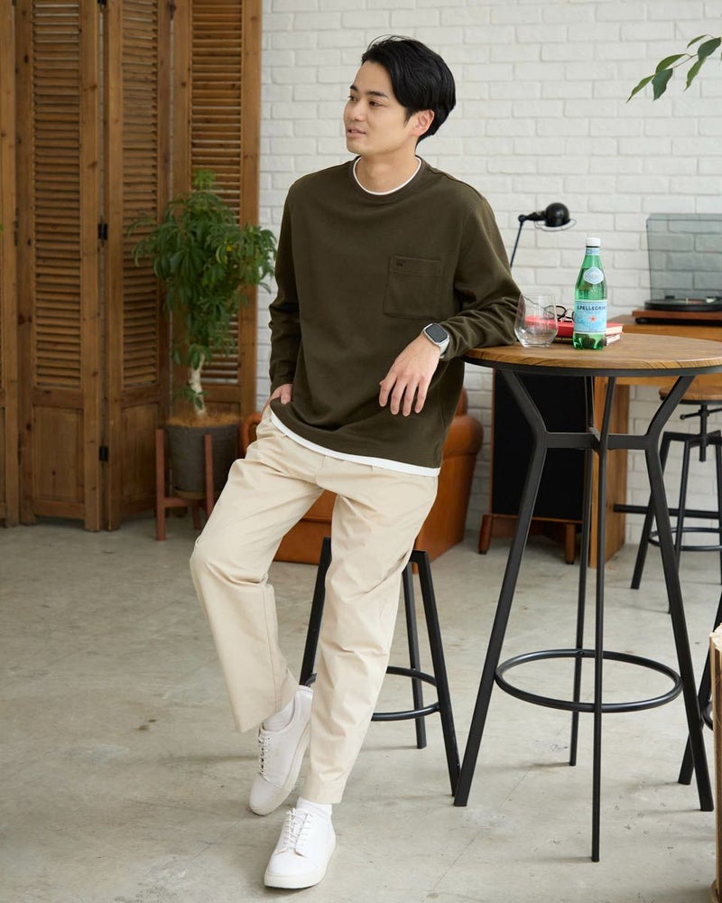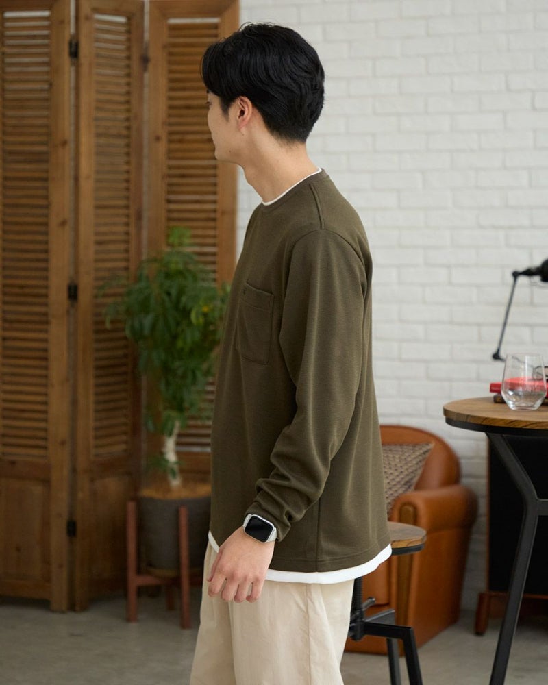 表面に横畝のあるリップル素材を使用した長袖Tシャツです。素材に適度なハリと厚みがあるので、通常の天竺のTシャツに比べて身体のラインを拾わないのが特徴です。襟を配色のレイヤードにしてアクセントにしています。 モデル身長: 176 cm 着用サイズ: L サイズ Golden Bear MEN カットソー (MEN) 【着用アイテム】314RD131 キルトジャケット 314R8702 デニム 314RC700 ワイドチノ