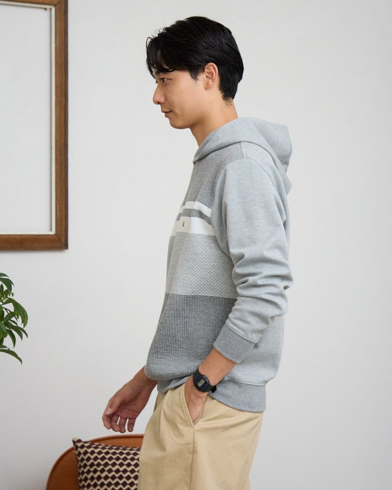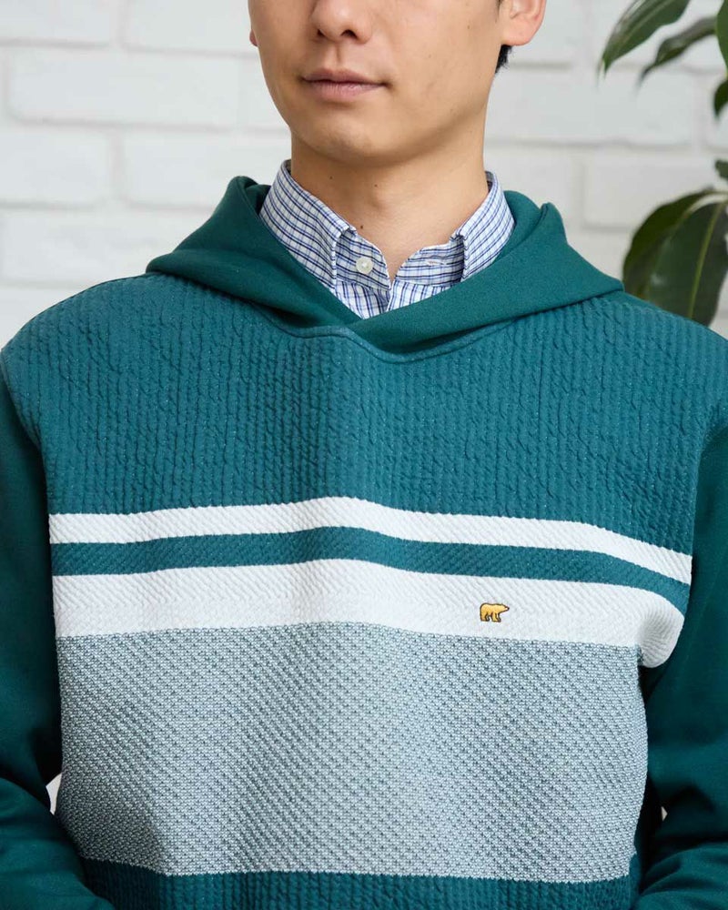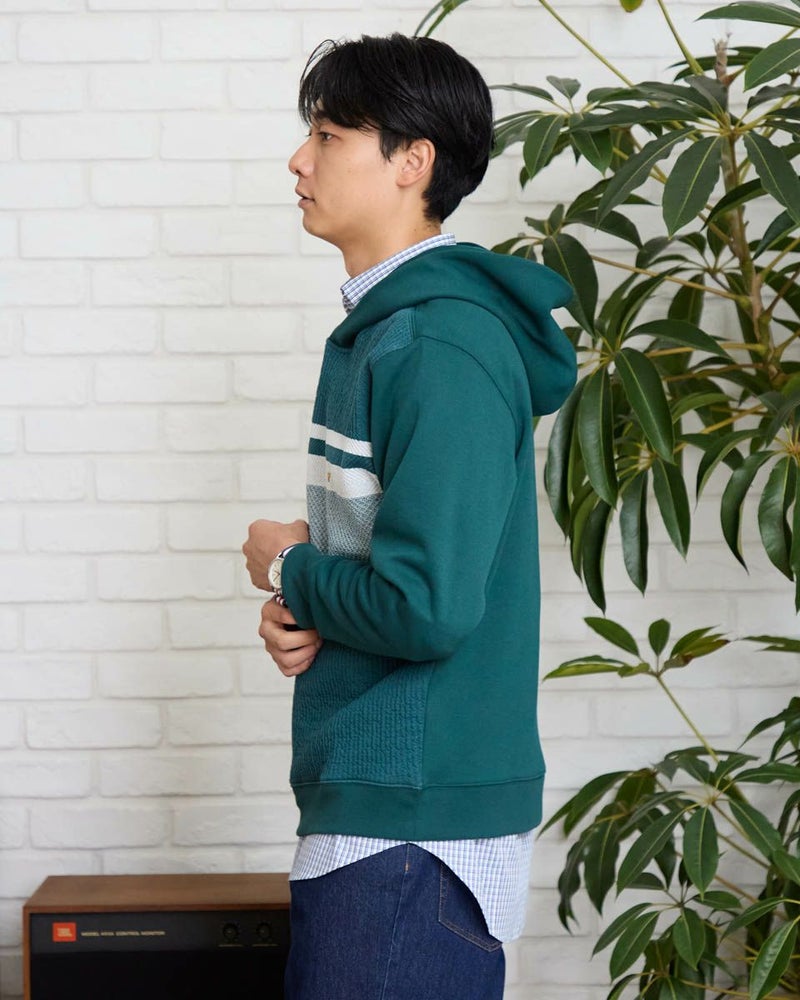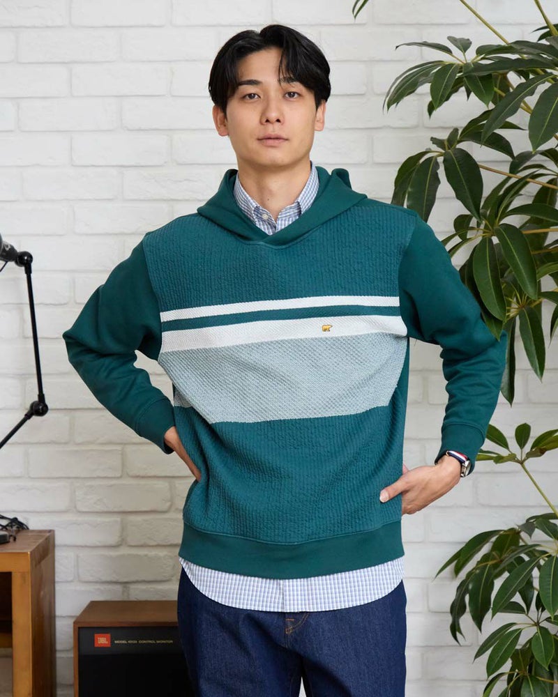 前身頃を横柄に切り替えたパーカです。前身頃は立体感のあるフクレジャカード生地、後身頃・袖は鹿の子組織のダンボールニット生地を使用しています。コーディネートの主役になるスウェットです。 モデル身長: 180 cm 着用サイズ: L サイズ Golden Bear MEN カットソー (MEN) 【着用アイテム】317RC201 チェックシャツ 314R8702 デニム 314RC700 ワイドチノ