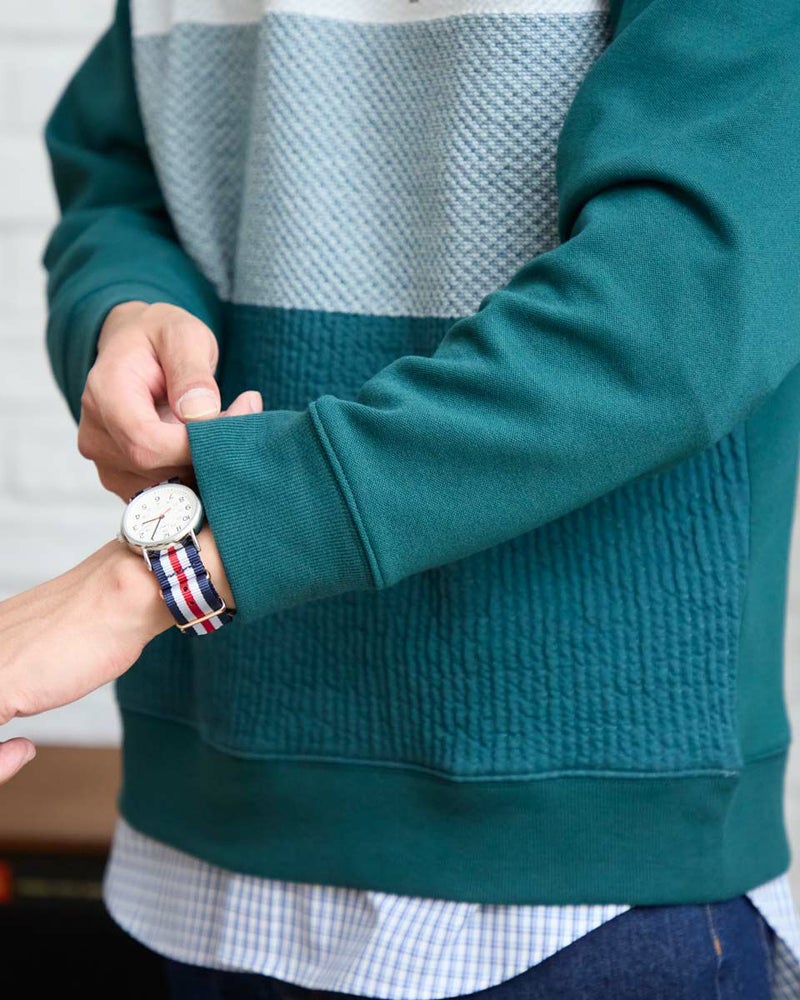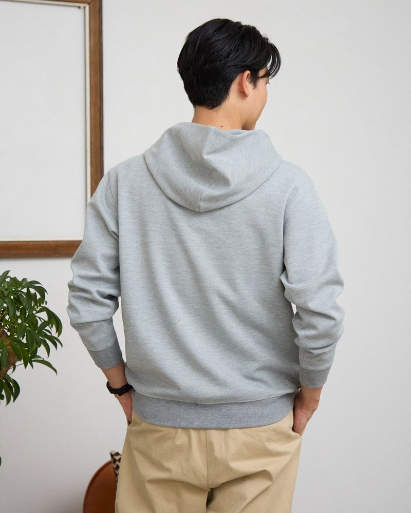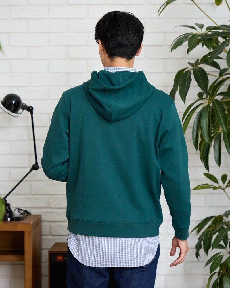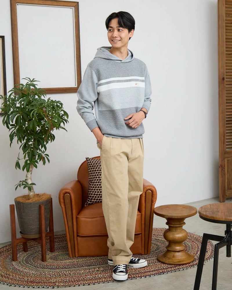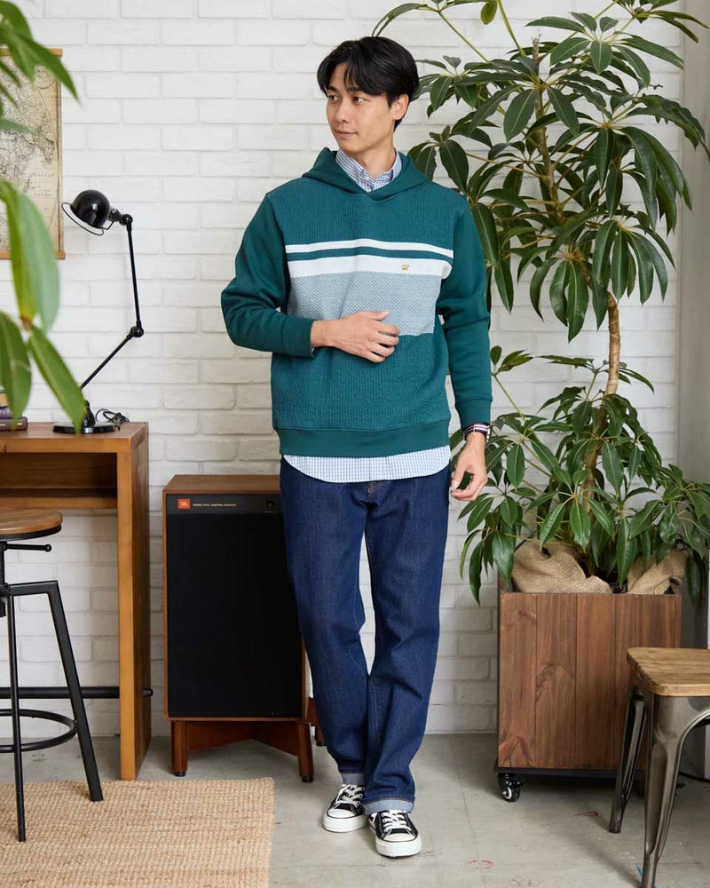 前身頃を横柄に切り替えたパーカです。前身頃は立体感のあるフクレジャカード生地、後身頃・袖は鹿の子組織のダンボールニット生地を使用しています。コーディネートの主役になるスウェットです。 モデル身長: 180 cm 着用サイズ: L サイズ Golden Bear MEN カットソー (MEN) 【着用アイテム】317RC201 チェックシャツ 314R8702 デニム 314RC700 ワイドチノ