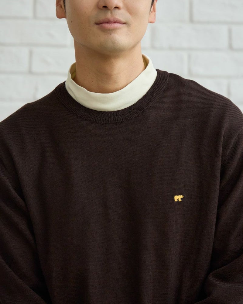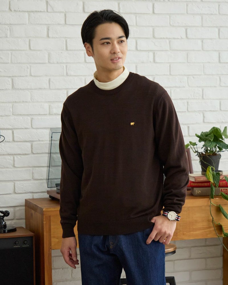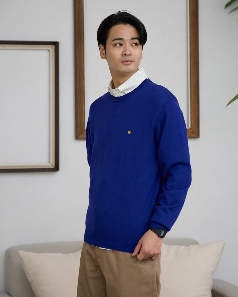 ベーシックなクルーネックニットです。メリノウール100%を使用した12G天竺の編地です。優れた保温性と肌触りが特徴です。繊維がとても細かいため、チクチクする不快感を感じにくいのも魅力です。明るいカラーでコーディネイトのアクセントに最適です。お手入れが楽な家庭洗濯(手洗い)が可能です。 モデル身長: 176 cm 着用サイズ: L サイズ Golden Bear MEN ニット (MEN) 【着用アイテム】314RD131 キルトジャケット 317RC202 ストライプシャツ 314RD433 吸湿発熱ハイネック長袖Tシャツ 314R8702 デニム 314RC700 ワイドチノ 314RC704 イージーパンツ
