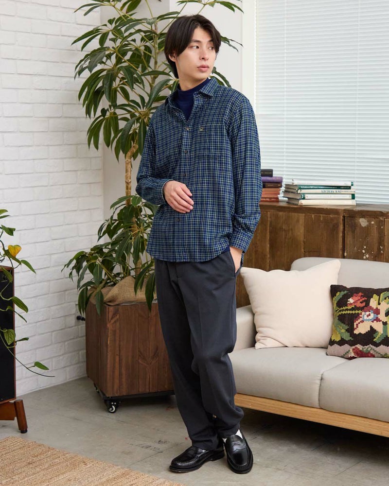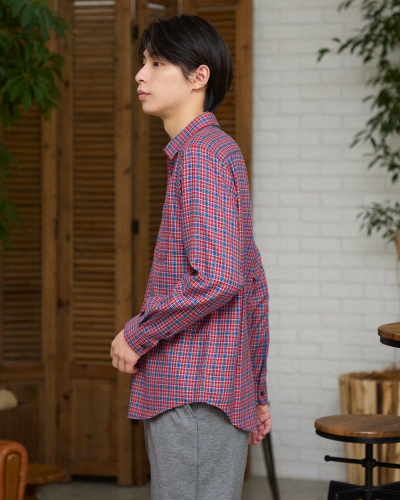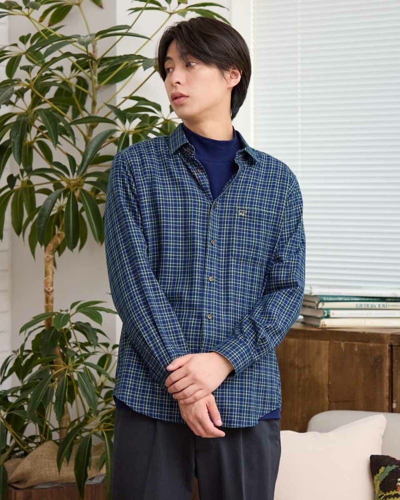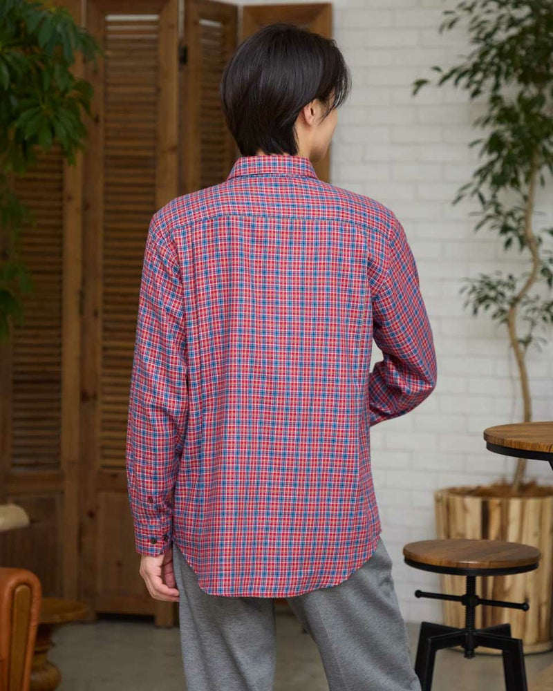 レーヨンポリエステルの特殊な混紡糸を使用した、タータンチェックのレギュラーカラーシャツ。しなやかでしっとりとした、独特な風合いと、発色の良い色合いが特徴です。スウェットやニットのレイヤードにデニムやチノを合わせた王道のアメカジスタイルがおすすめ。 モデル身長: 180 cm 着用サイズ: L サイズ Golden Bear MEN シャツ (MEN) 【着用アイテム】314RD433 吸湿発熱ハイネック長袖Tシャツ 314RD712 イージー発熱素材スラックス