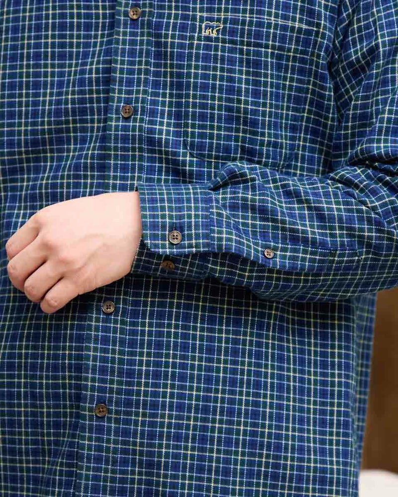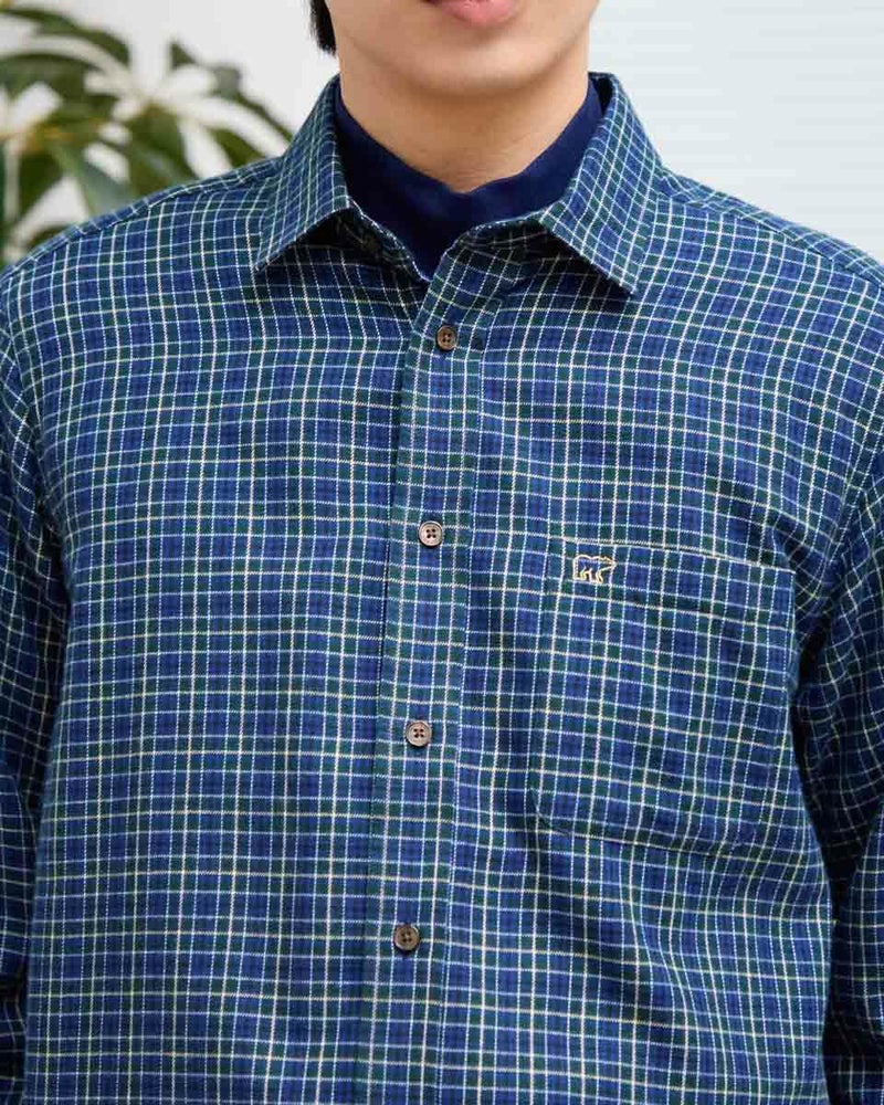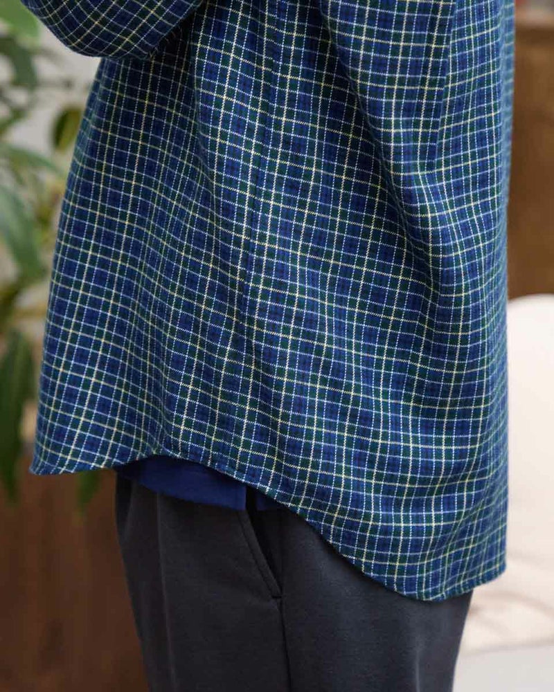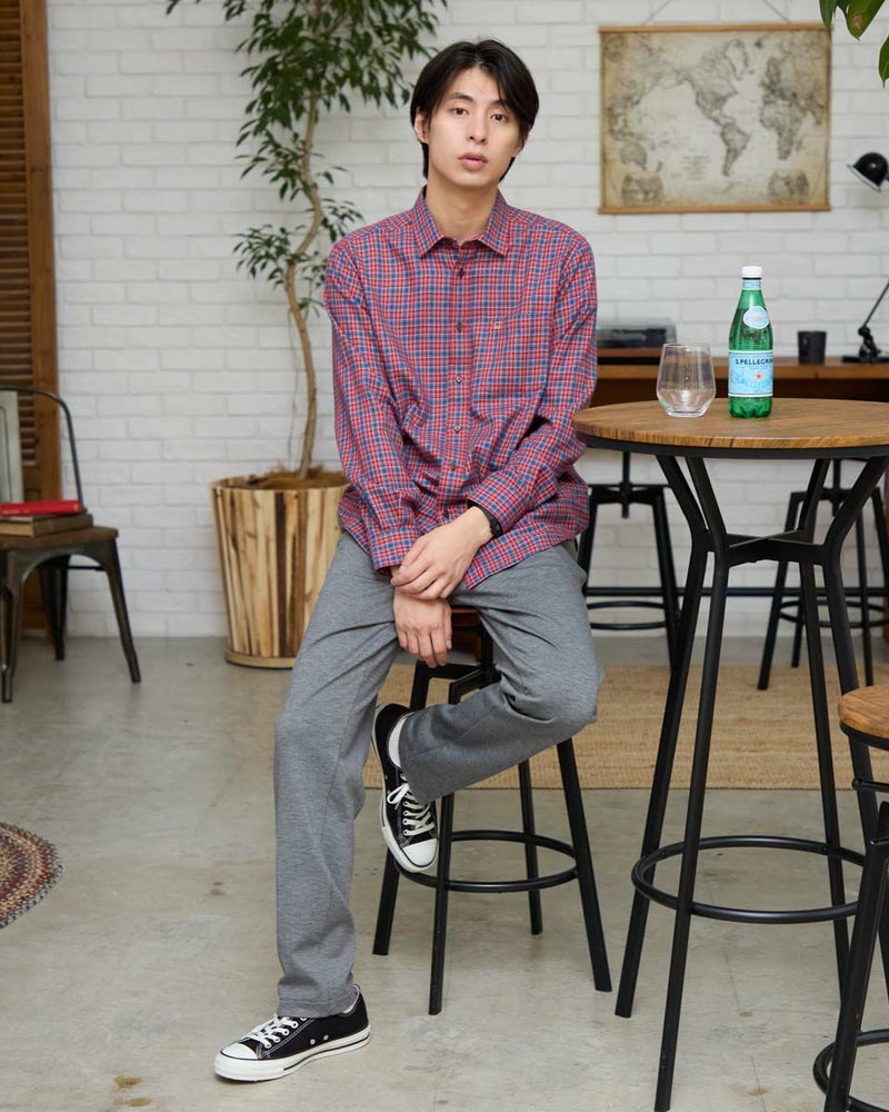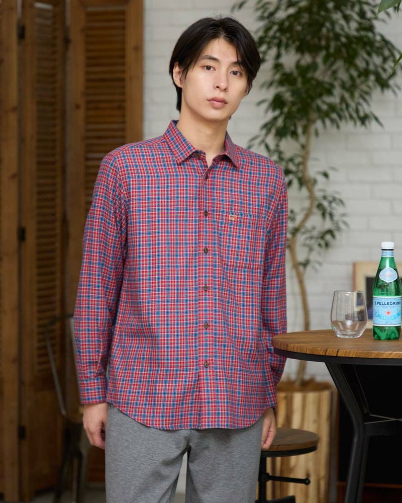 レーヨンポリエステルの特殊な混紡糸を使用した、タータンチェックのレギュラーカラーシャツ。しなやかでしっとりとした、独特な風合いと、発色の良い色合いが特徴です。スウェットやニットのレイヤードにデニムやチノを合わせた王道のアメカジスタイルがおすすめ。 モデル身長: 180 cm 着用サイズ: L サイズ Golden Bear MEN シャツ (MEN) 【着用アイテム】314RD433 吸湿発熱ハイネック長袖Tシャツ 314RD712 イージー発熱素材スラックス
