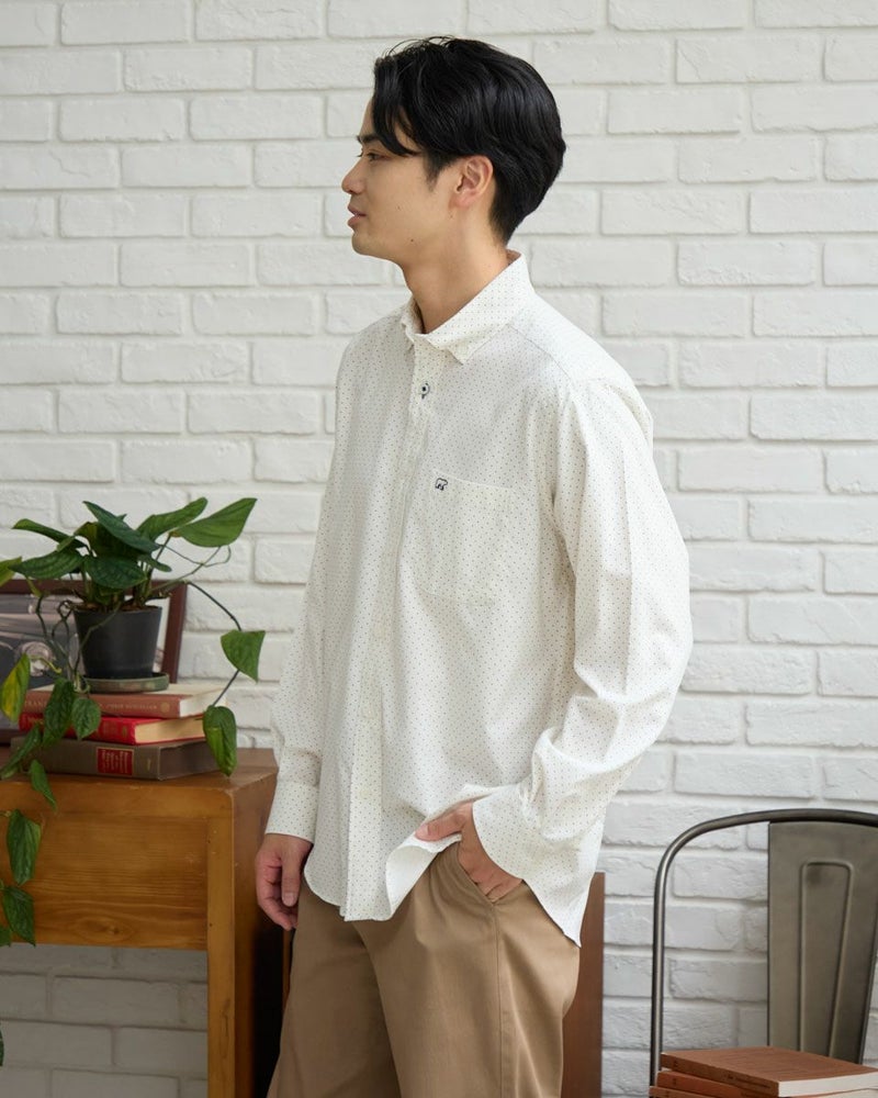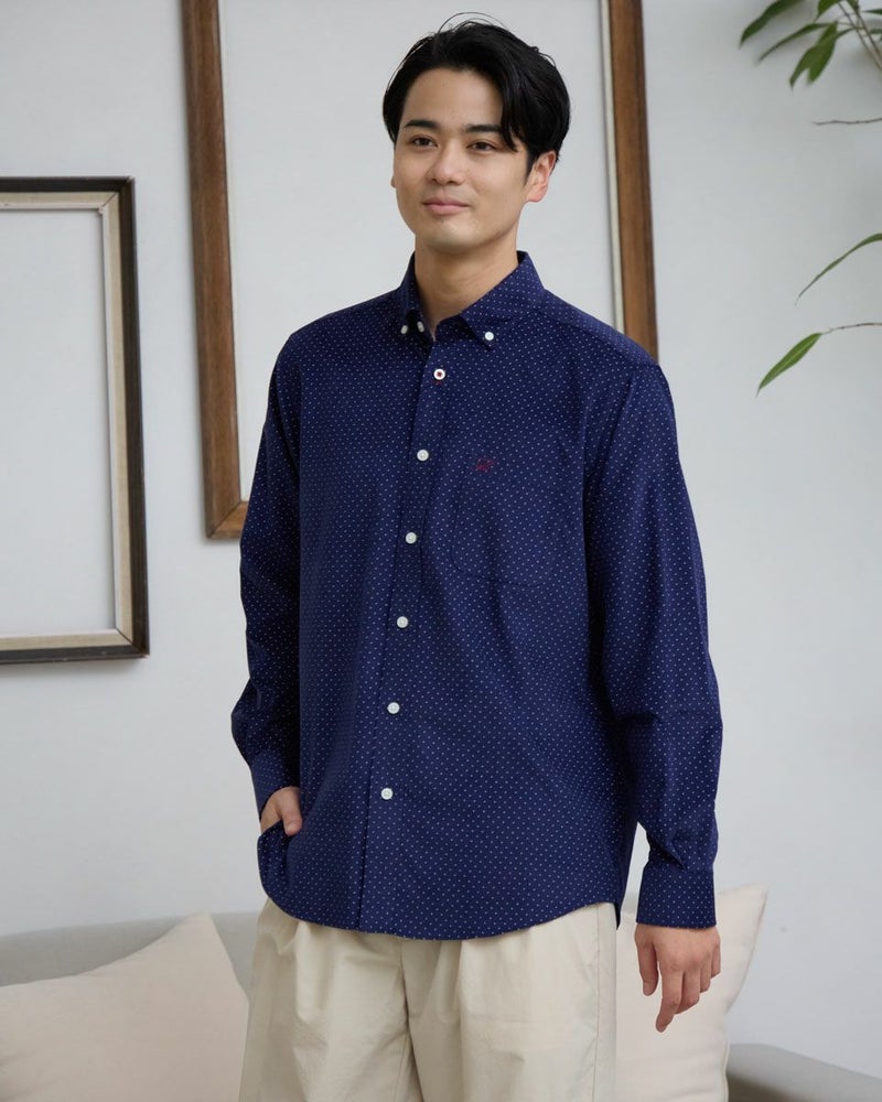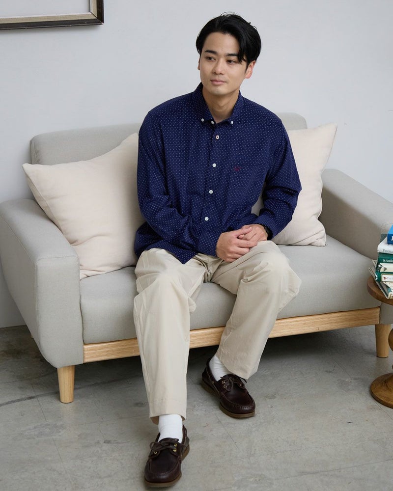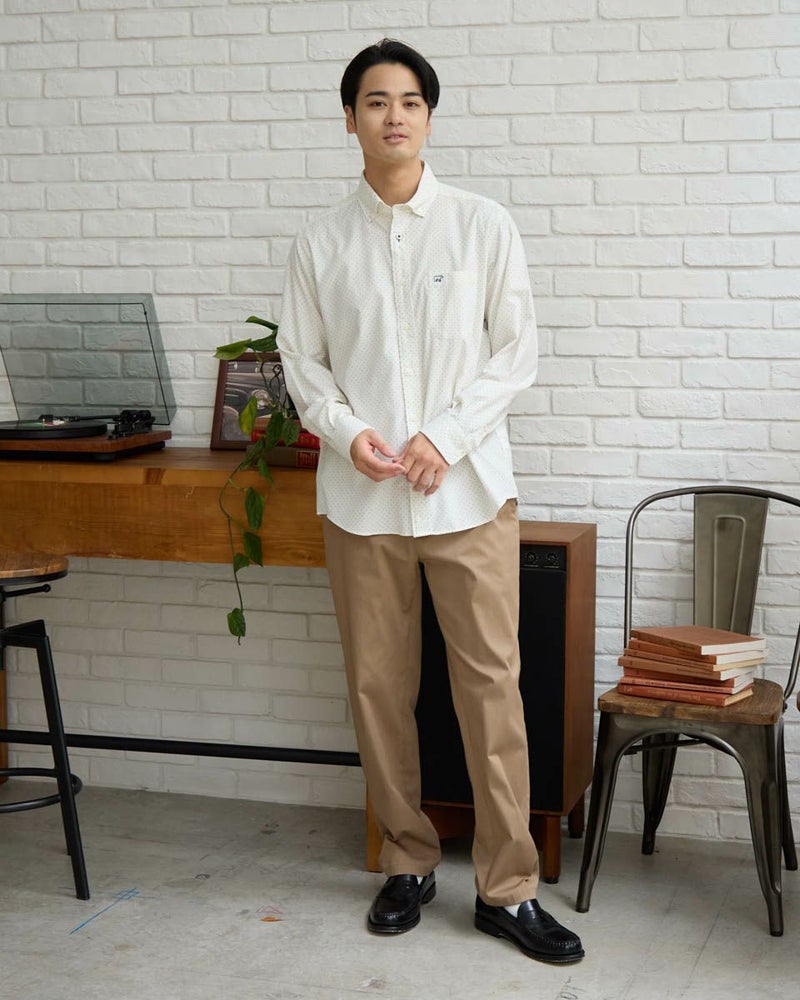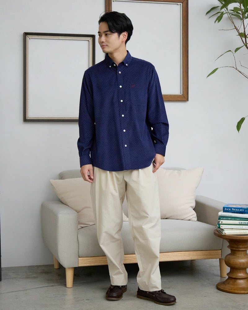 上品なピンドットプリントのコーデュロイシャツです。襟はセミワイドのボタンダウン仕様です。綿/リヨセル混の生地はやわらかな肌ざわりが特徴です。カジュアルでもきれいめにも合わせやすいドット柄シャツは秋冬のコーディネイトに重宝する1枚です。 モデル身長: 176 cm 着用サイズ: L サイズ Golden Bear MEN シャツ (MEN) 【着用アイテム】314RC700 ワイドチノ 314RC704 イージーパンツ