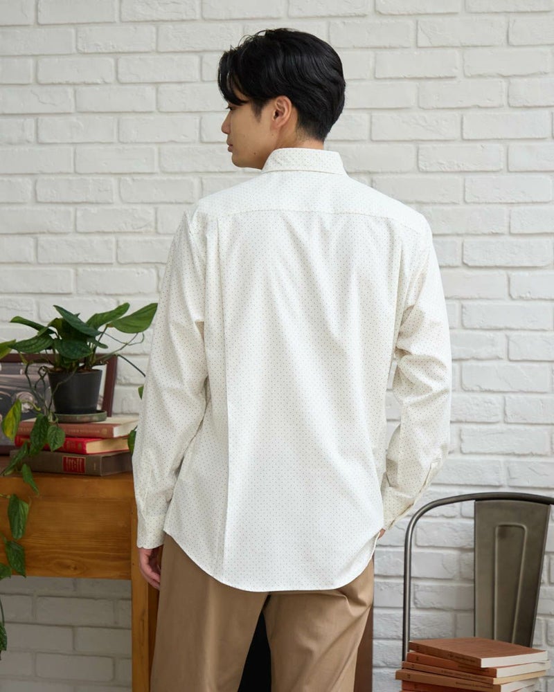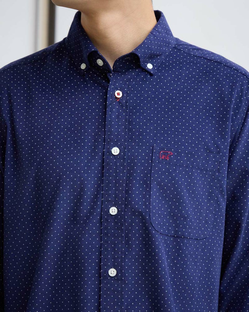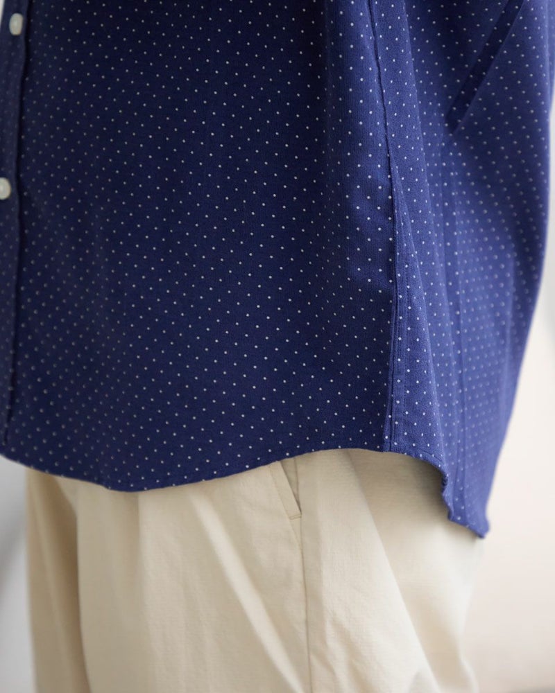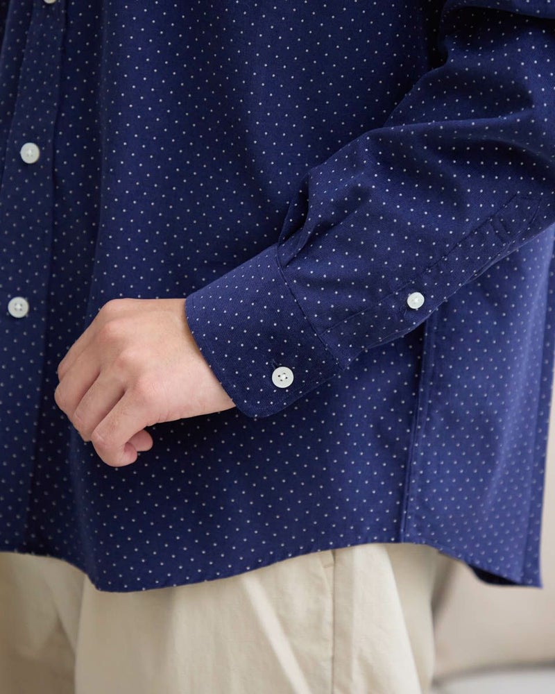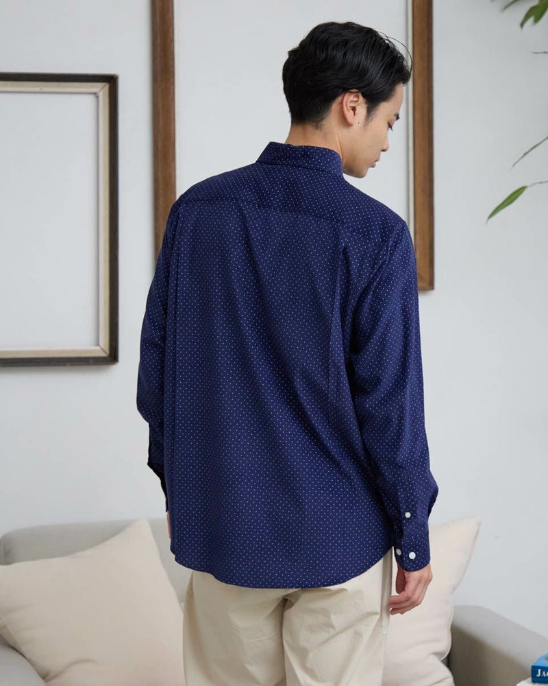 上品なピンドットプリントのコーデュロイシャツです。襟はセミワイドのボタンダウン仕様です。綿/リヨセル混の生地はやわらかな肌ざわりが特徴です。カジュアルでもきれいめにも合わせやすいドット柄シャツは秋冬のコーディネイトに重宝する1枚です。 モデル身長: 176 cm 着用サイズ: L サイズ Golden Bear MEN シャツ (MEN) 【着用アイテム】314RC700 ワイドチノ 314RC704 イージーパンツ