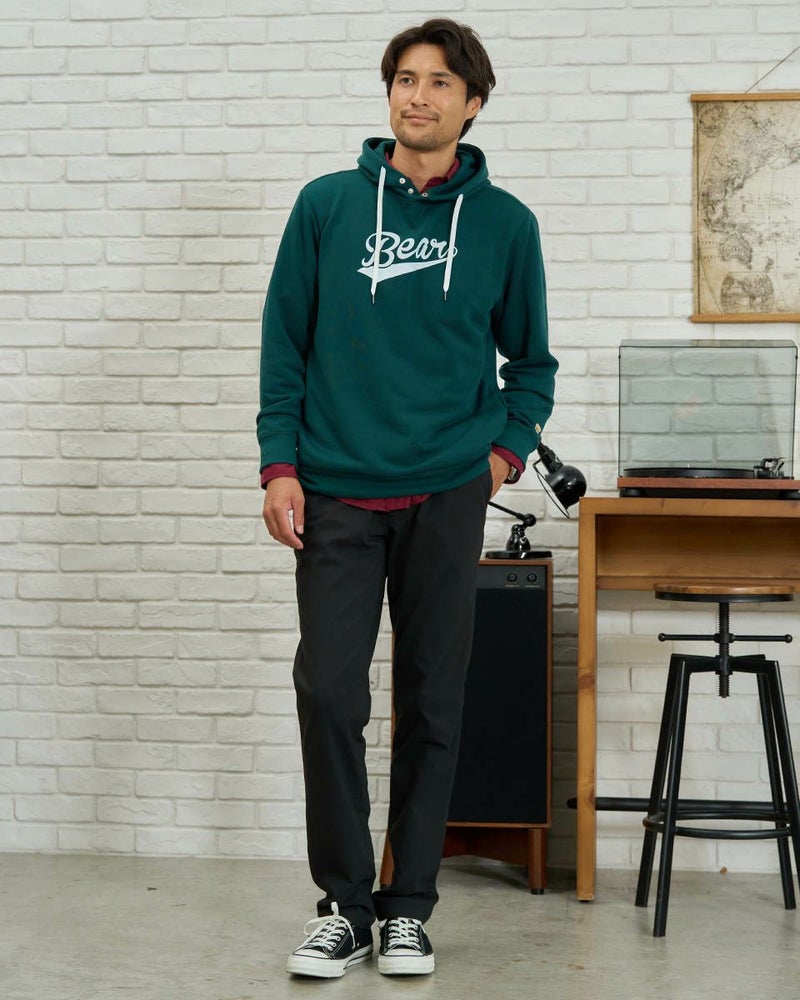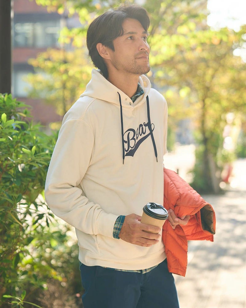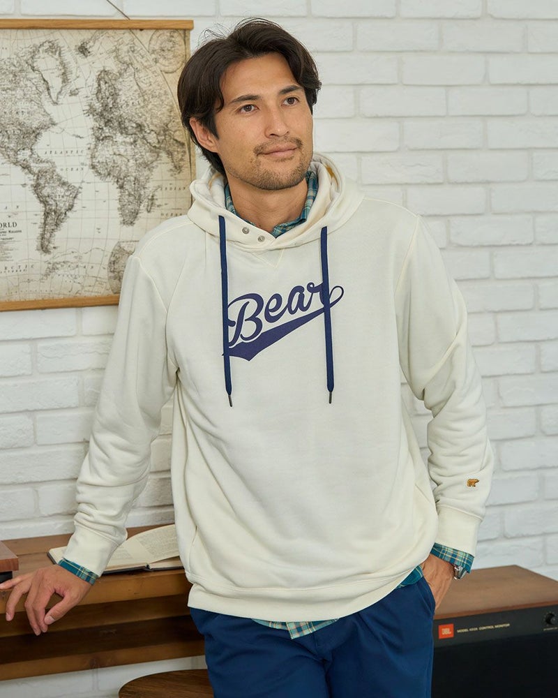 秋冬シーズンの裏毛スウェットって洗濯後に乾きにくいですよね?その問題を解消するために速乾性の高いポリエステルだけで裏毛素材つくりました。洗濯しても乾きやすく、軽い着用感が特徴です。ベースボールフォントのBearがアメカジらしいパーカーです。