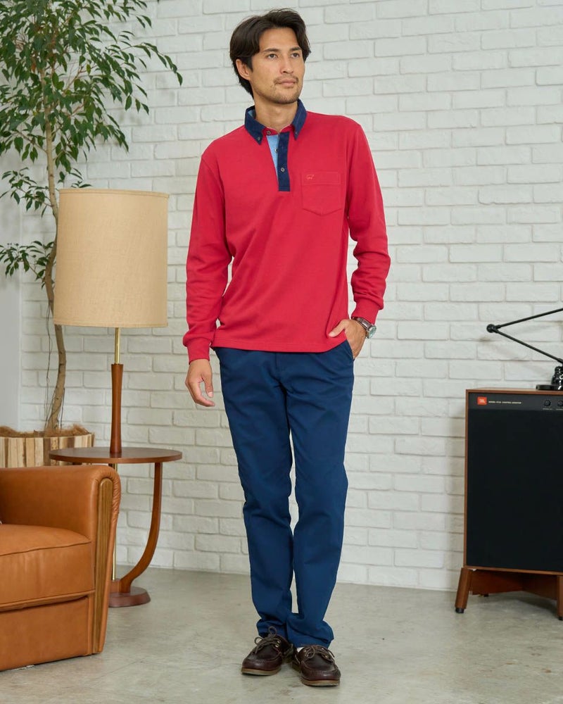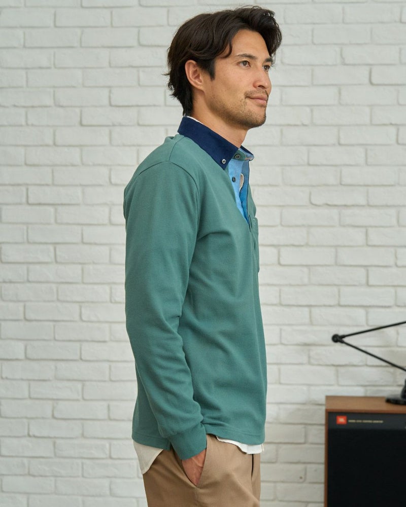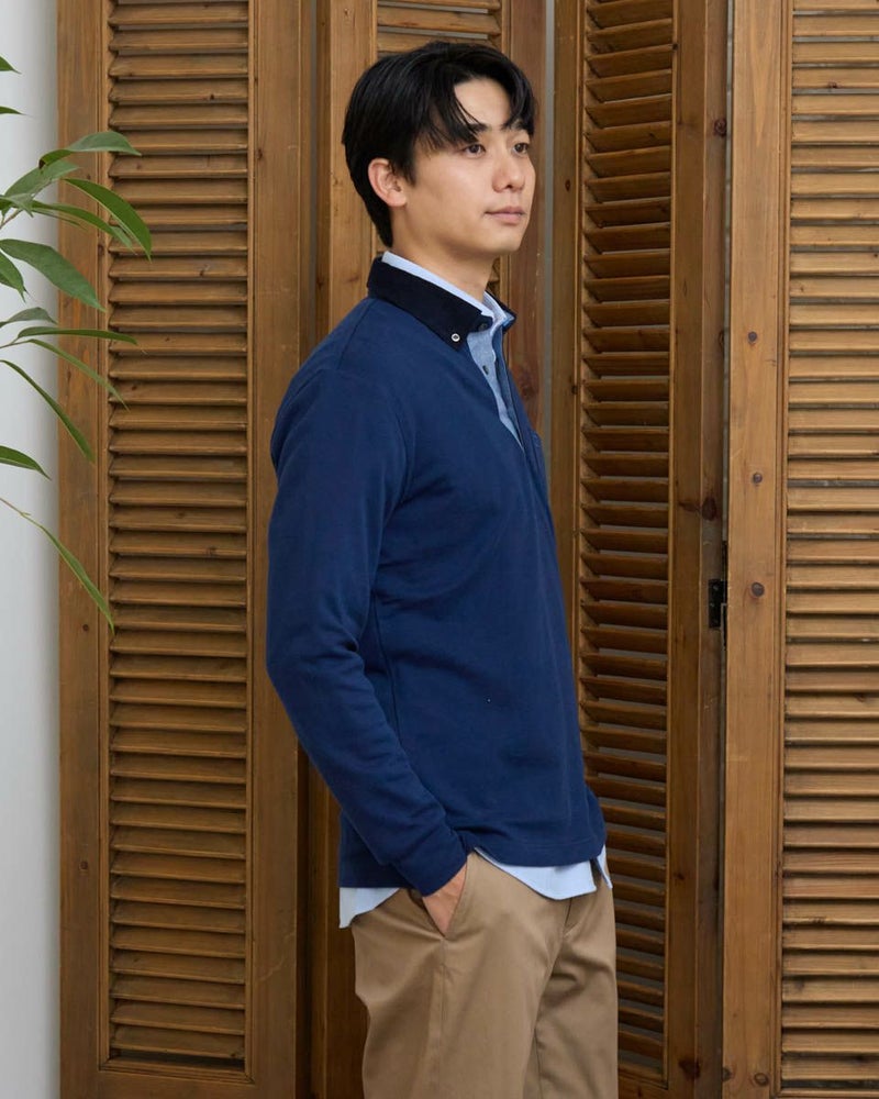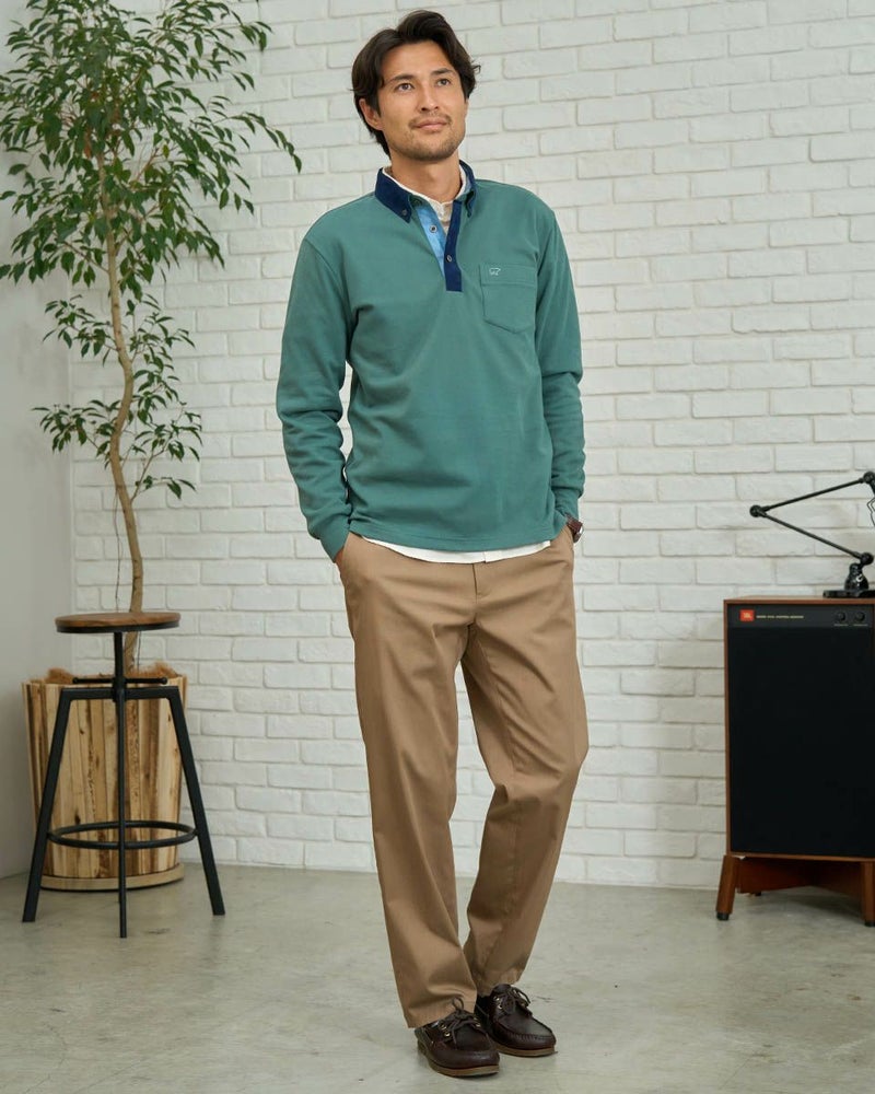 コーデュロイ布帛を使用した長袖ポロシャツです。表面に微起毛を施したカノコ素材を使用しています。柔らかく、優しい肌触りが特徴です。カジュアルながらもきれいに着こなせるポロシャツです。 モデル身長: 180 cm 着用サイズ: L サイズ Golden Bear MEN カットソー (MEN) 【着用アイテム】314RD112 ドライビングジャケット 314RD210 フランネルシャツ 315RC704 イージーパンツ 314RD711 超ストレッチ発熱素材パンツ