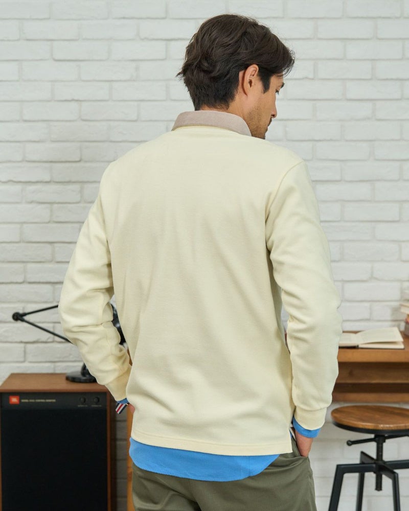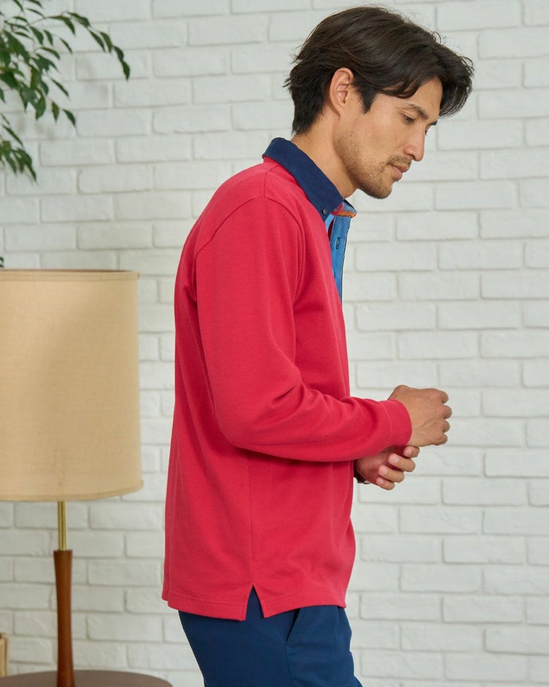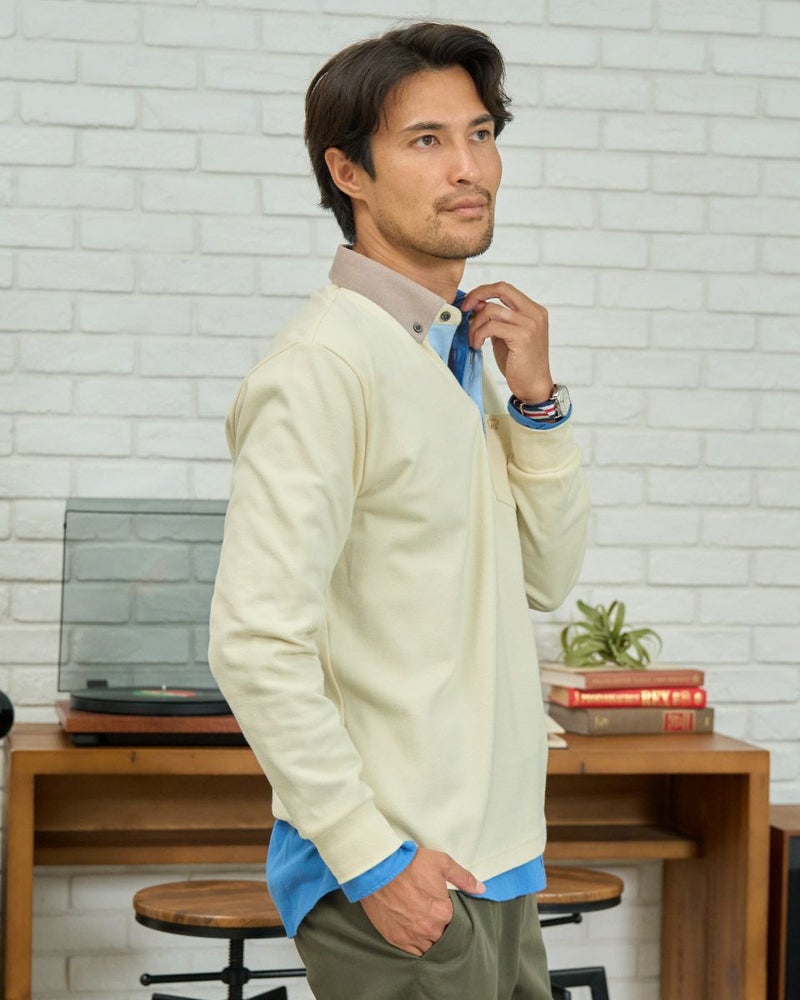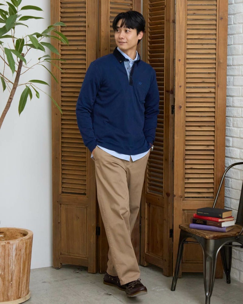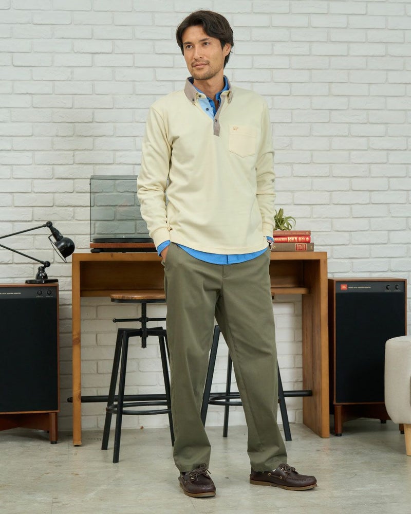 コーデュロイ布帛を使用した長袖ポロシャツです。表面に微起毛を施したカノコ素材を使用しています。柔らかく、優しい肌触りが特徴です。カジュアルながらもきれいに着こなせるポロシャツです。 モデル身長: 180 cm 着用サイズ: L サイズ Golden Bear MEN カットソー (MEN) 【着用アイテム】314RD112 ドライビングジャケット 314RD210 フランネルシャツ 315RC704 イージーパンツ 314RD711 超ストレッチ発熱素材パンツ