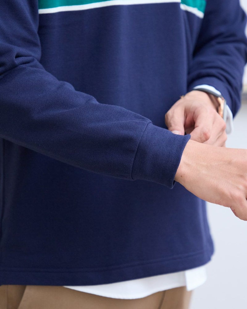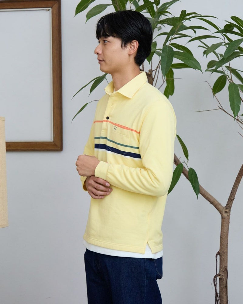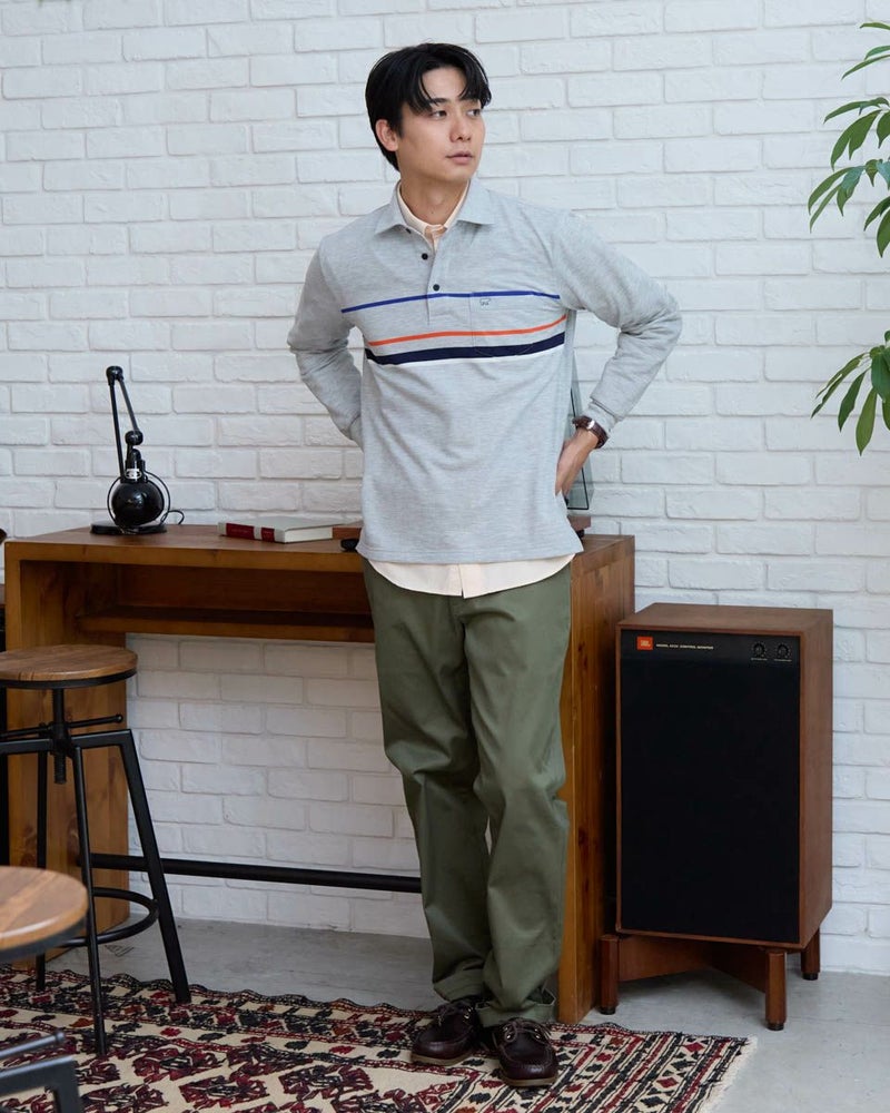 パネルボーダーの長袖ポロシャツです。暖かみのある裏起毛素材を使用しています。胸の大柄ボーダーがコーディネイトのアクセントに。中肉で1枚着としても活躍するポロシャツです。 モデル身長: 180 cm 着用サイズ: L サイズ Golden Bear MEN カットソー (MEN) 【着用アイテム】 314RC230 オックスシャツ 314RD412 ヘンリーネックTシャツ 314R8702 デニム 314RC704 ストレッチイージーパンツ