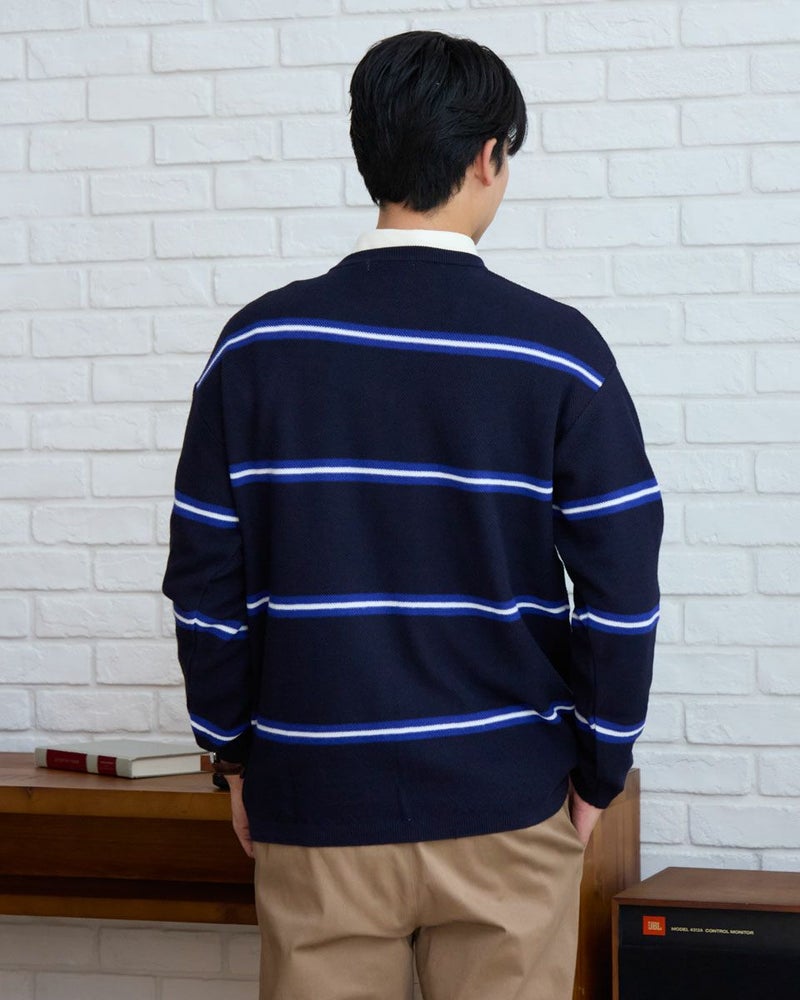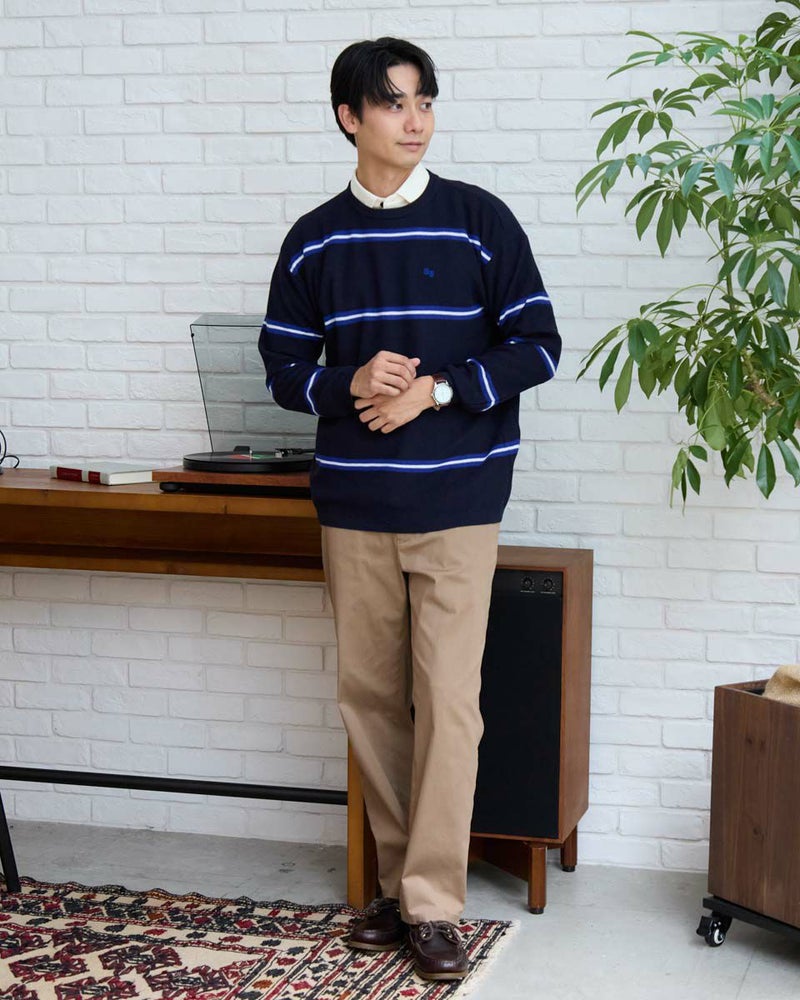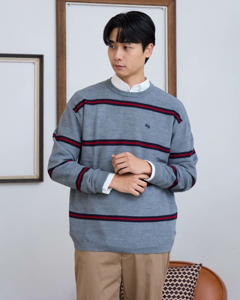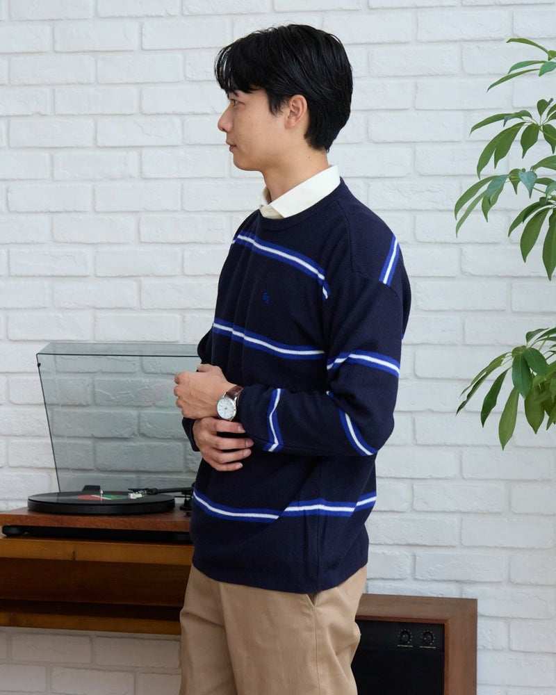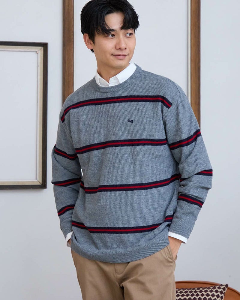 トレンドのクラシックなボーダー柄のクルーネックニットです。表情のあるカノコ組織で編み立てました。リラックス感のあるややゆったりめのシルエットでTシャツのように気軽に着用いただけます。スポーティーなビビッドカラーのボーダー配色がコーディネートのアクセントになるニットです。 モデル身長: 180 cm 着用サイズ: L サイズ Golden Bear MEN ニット (MEN) 【着用アイテム】 314RD408 マウンテンジャケット 314RD454 長袖パネルポロシャツ 314RC704 ストレッチイージーパンツ