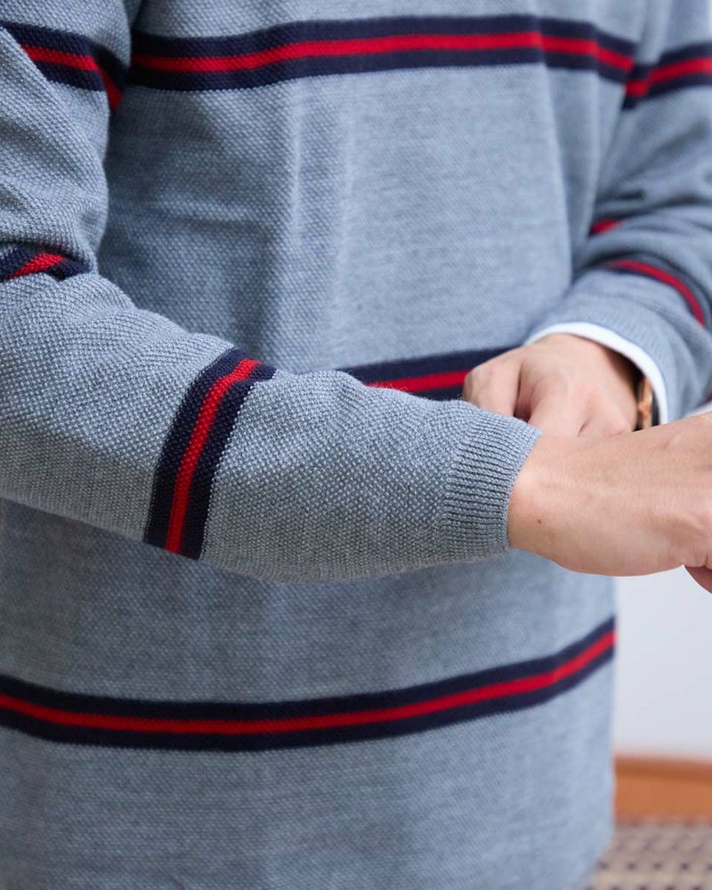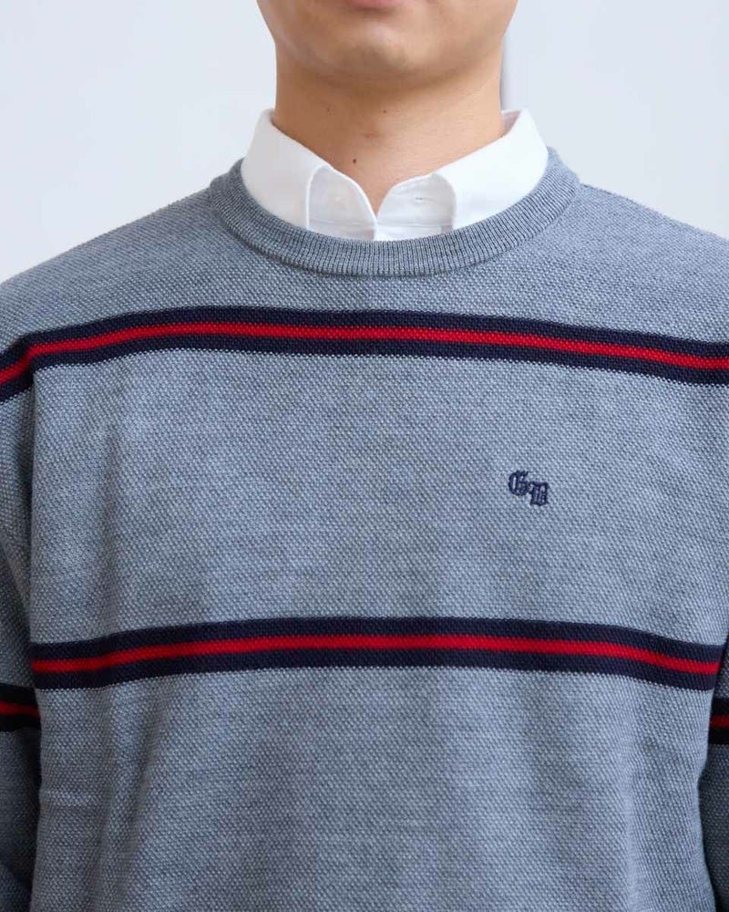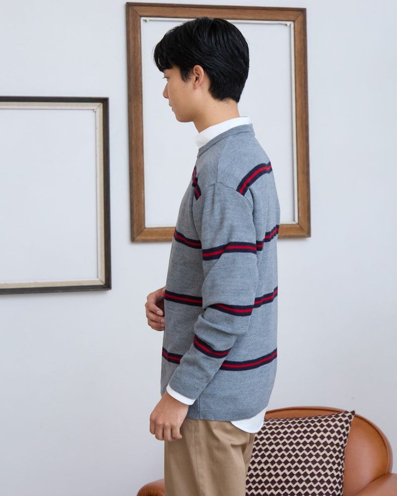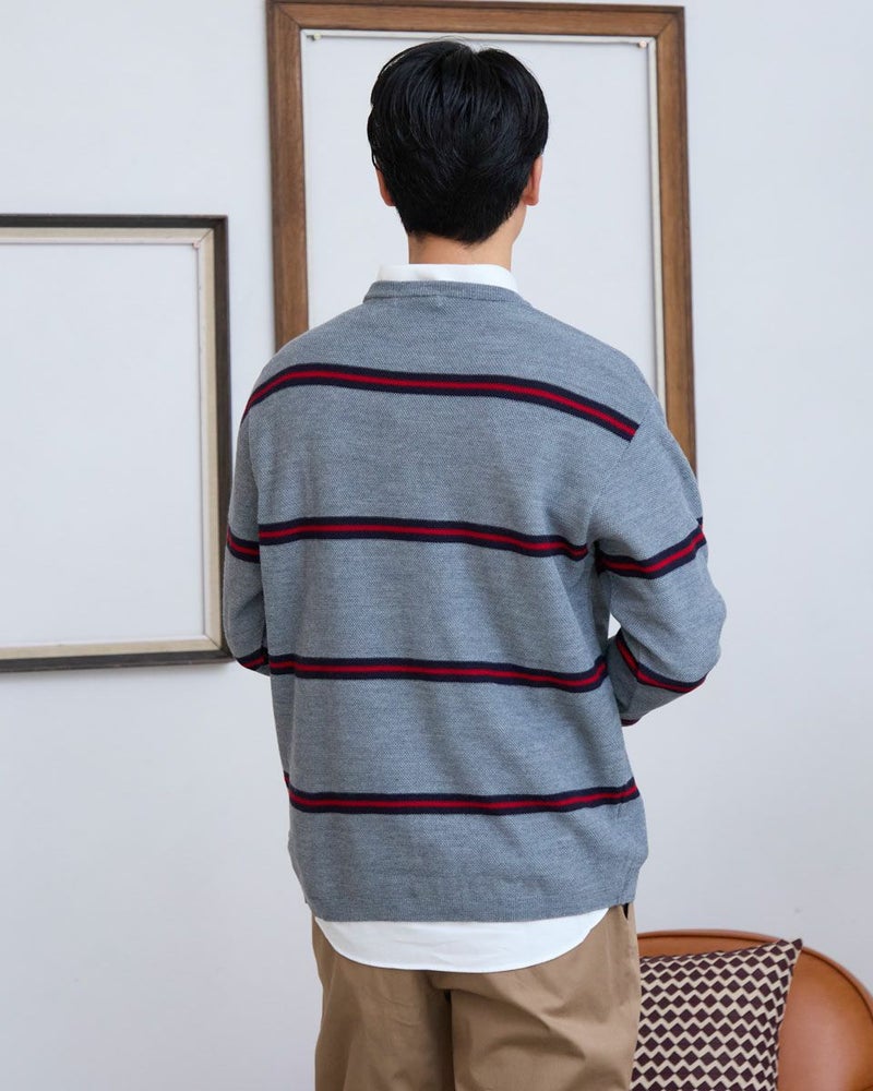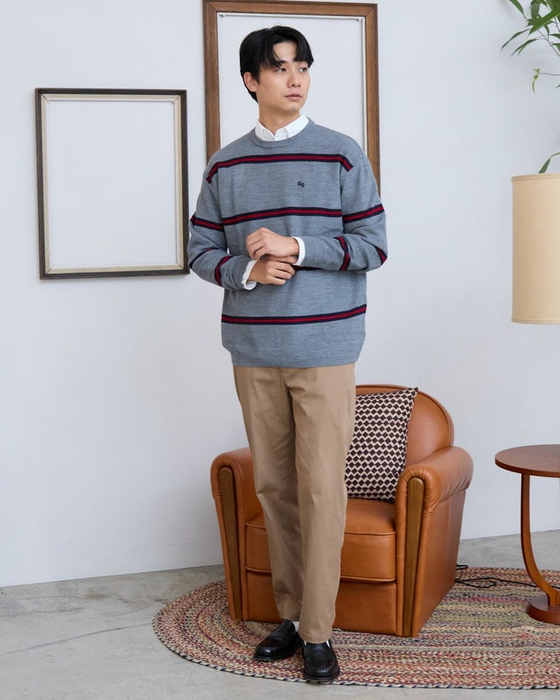 トレンドのクラシックなボーダー柄のクルーネックニットです。表情のあるカノコ組織で編み立てました。リラックス感のあるややゆったりめのシルエットでTシャツのように気軽に着用いただけます。スポーティーなビビッドカラーのボーダー配色がコーディネートのアクセントになるニットです。 モデル身長: 180 cm 着用サイズ: L サイズ Golden Bear MEN ニット (MEN) 【着用アイテム】 314RD408 マウンテンジャケット 314RD454 長袖パネルポロシャツ 314RC704 ストレッチイージーパンツ