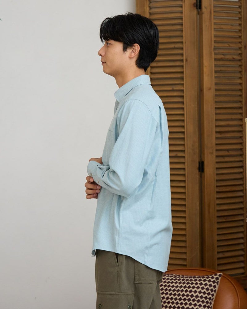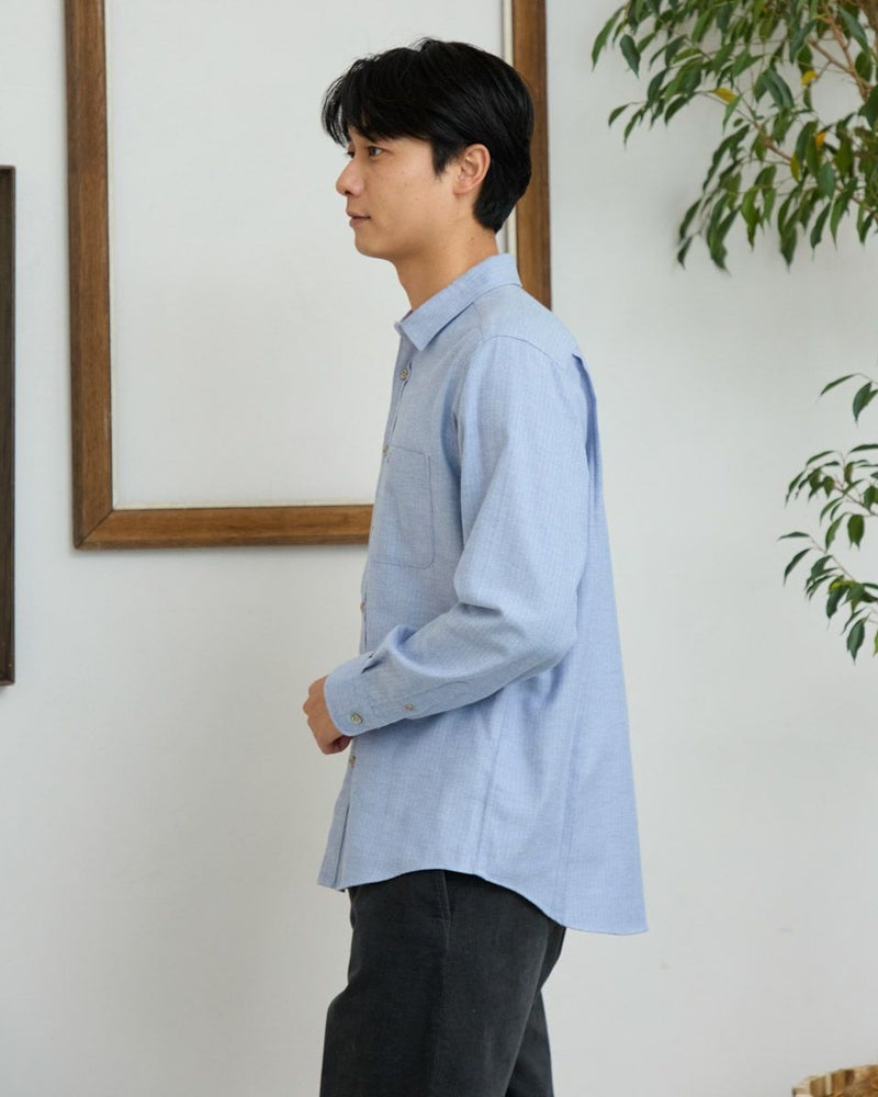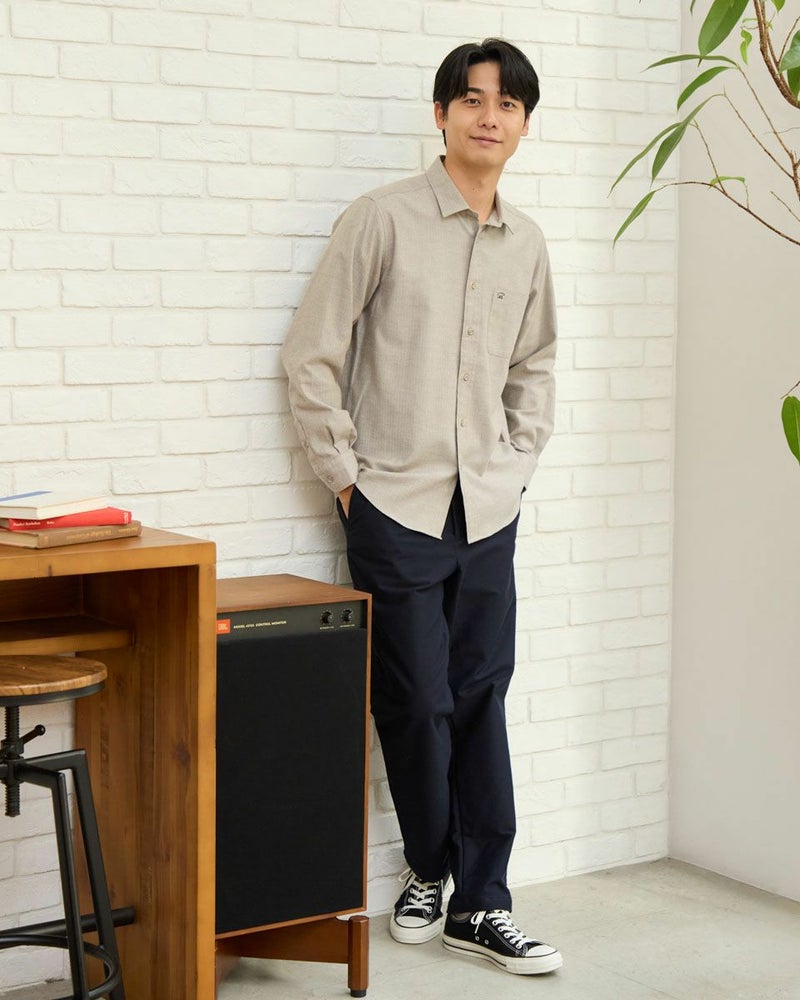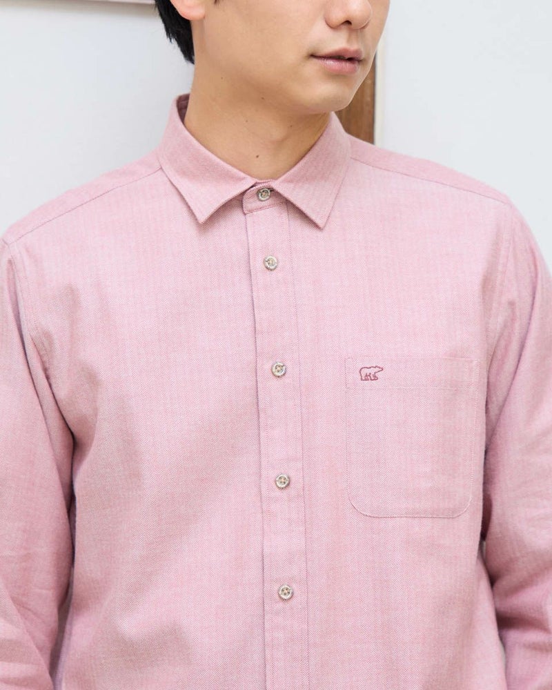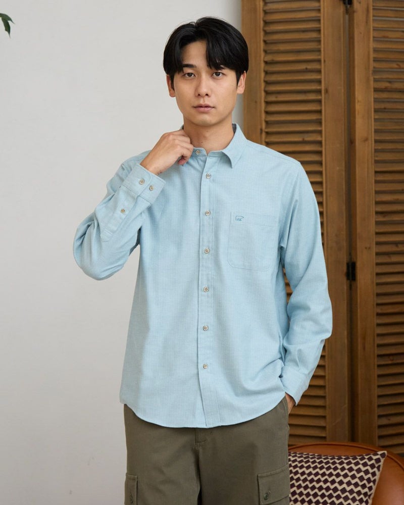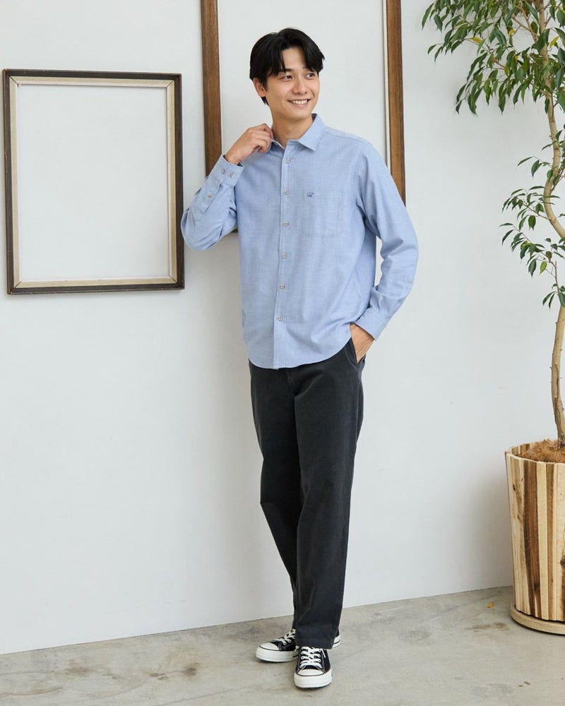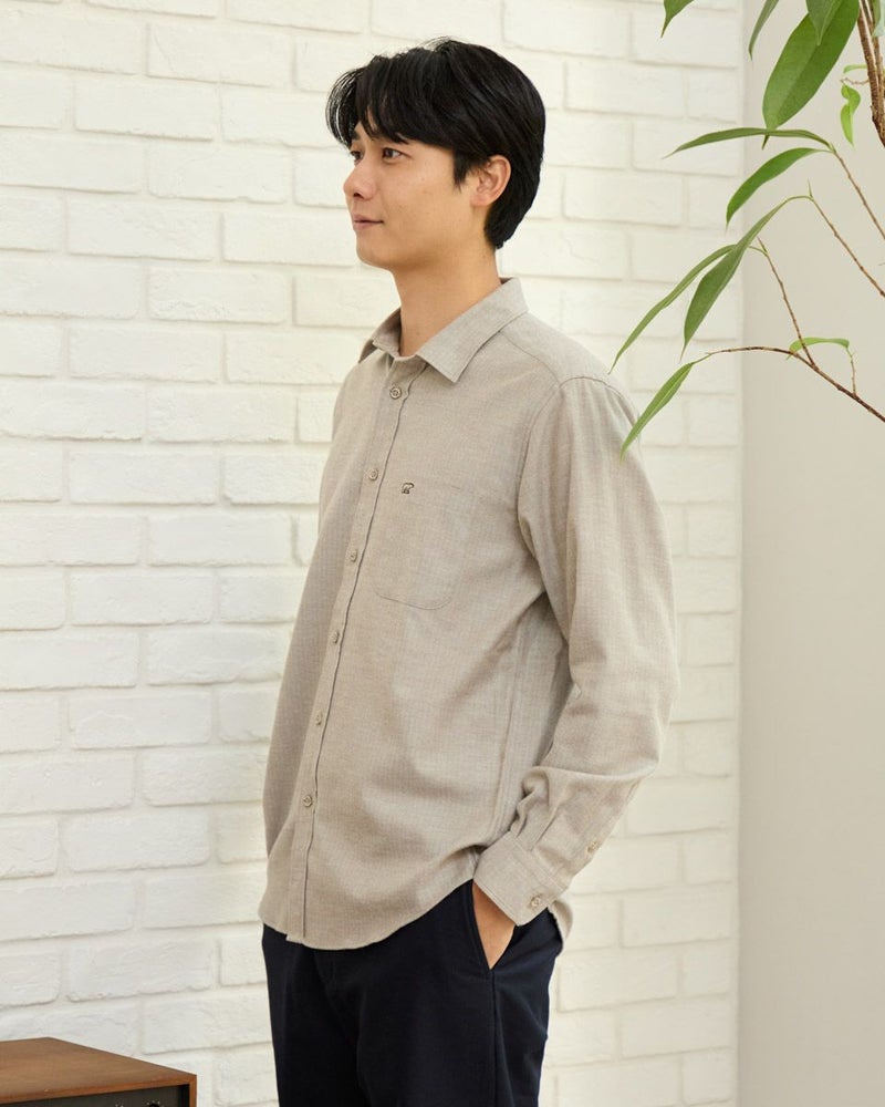 ヘリンボーン柄のレギュラー襟シャツです。起毛を施した暖かさと柔らかな風合いに加え、お手入れが簡単なイージーケア加工を施しています。クラシカルで上品な印象を与える落ち着きのある柄で様々なコーディネートに合わせやすさが魅力です。秋から冬にかけてのワードローブにぜひオススメしたい便利な一枚です。 モデル身長: 180 cm 着用サイズ: L サイズ Golden Bear MEN シャツ (MEN) 【着用アイテム】314RE123 キルトジャケット 314RE720 カーゴパンツ 314RE721 ストレッチコーデュロイパンツ