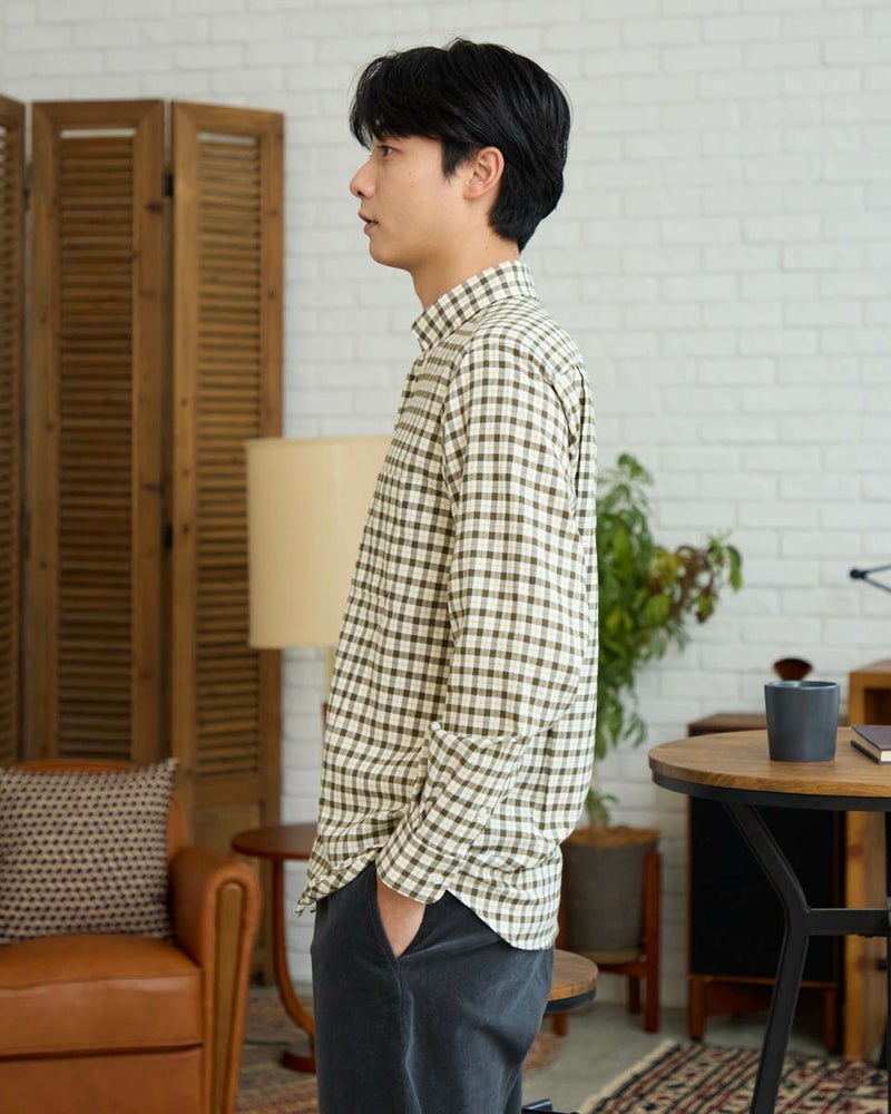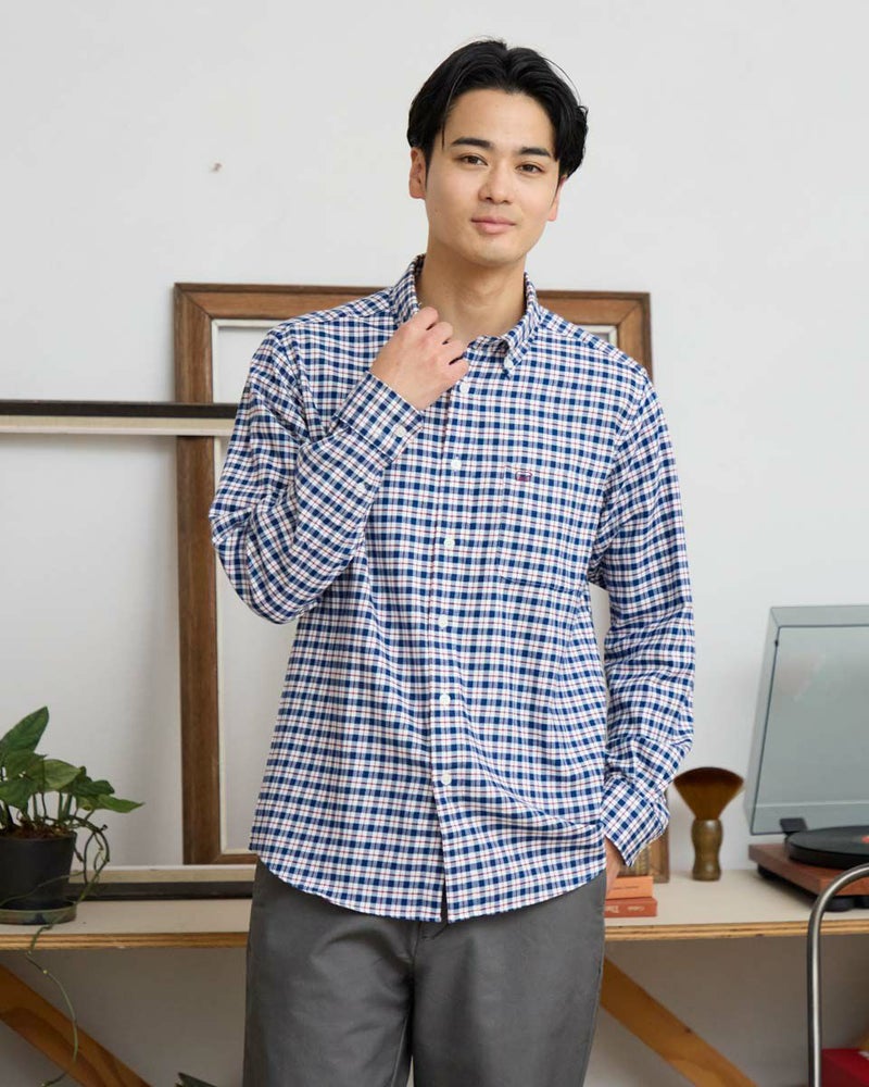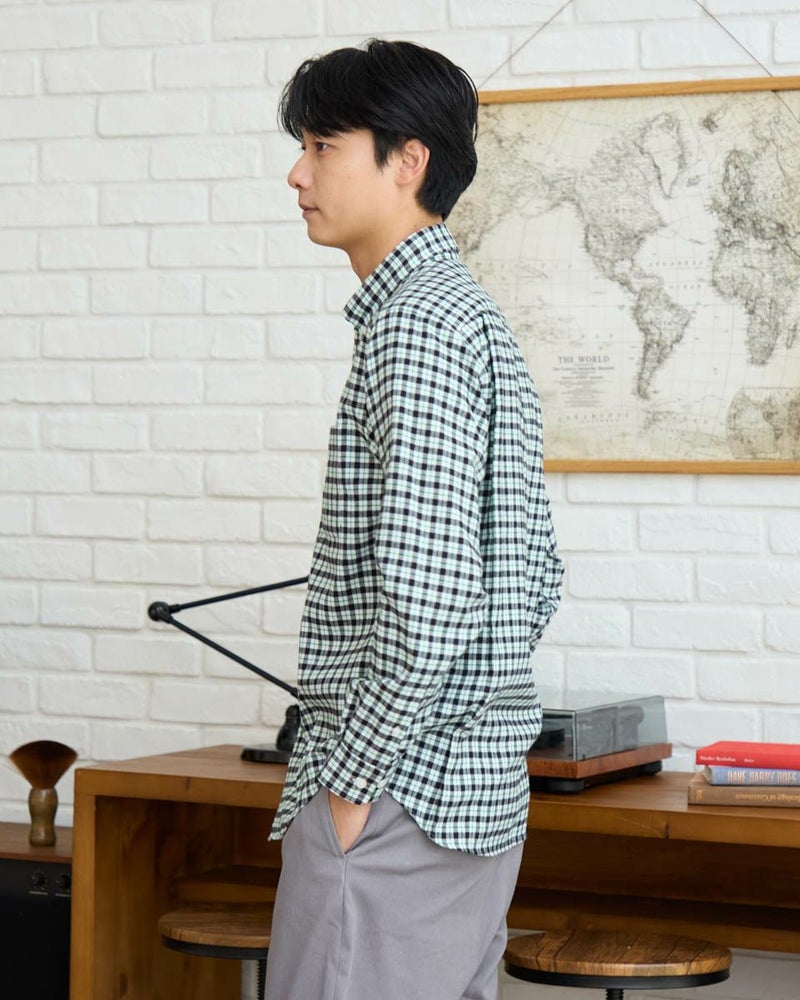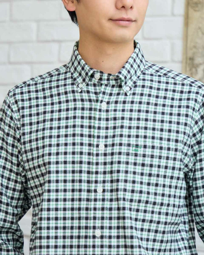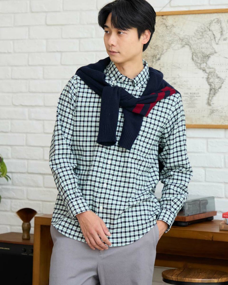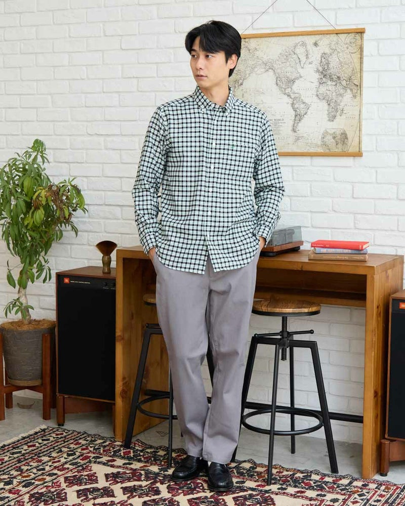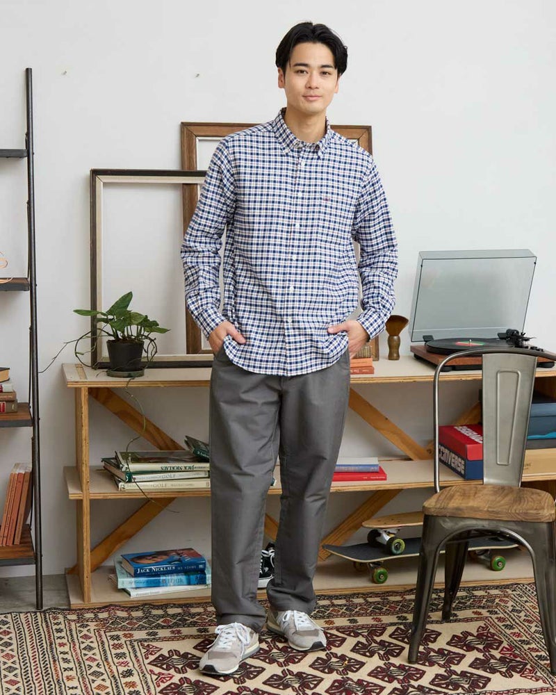 ビエラチェックのボタンダウン襟シャツです。起毛を施した暖かさと柔らかな風合いに加え、お手入れが簡単なイージーケア加工を施しています。コーディネートしやすい白ベースの中柄チェックは着用シーンや年代を問わず使いやすいシャツです。 180/176 cm 着用サイズ: L サイズ Golden Bear MEN シャツ (MEN) 【着用アイテム】314RE124 マウンテンパーカ 314RD409 ボアベスト 314RE633 洗えるラムカーディガン 314RE721 ストレッチコーデュロイパンツ 314RE722 ストレッチスリムイージーパンツ