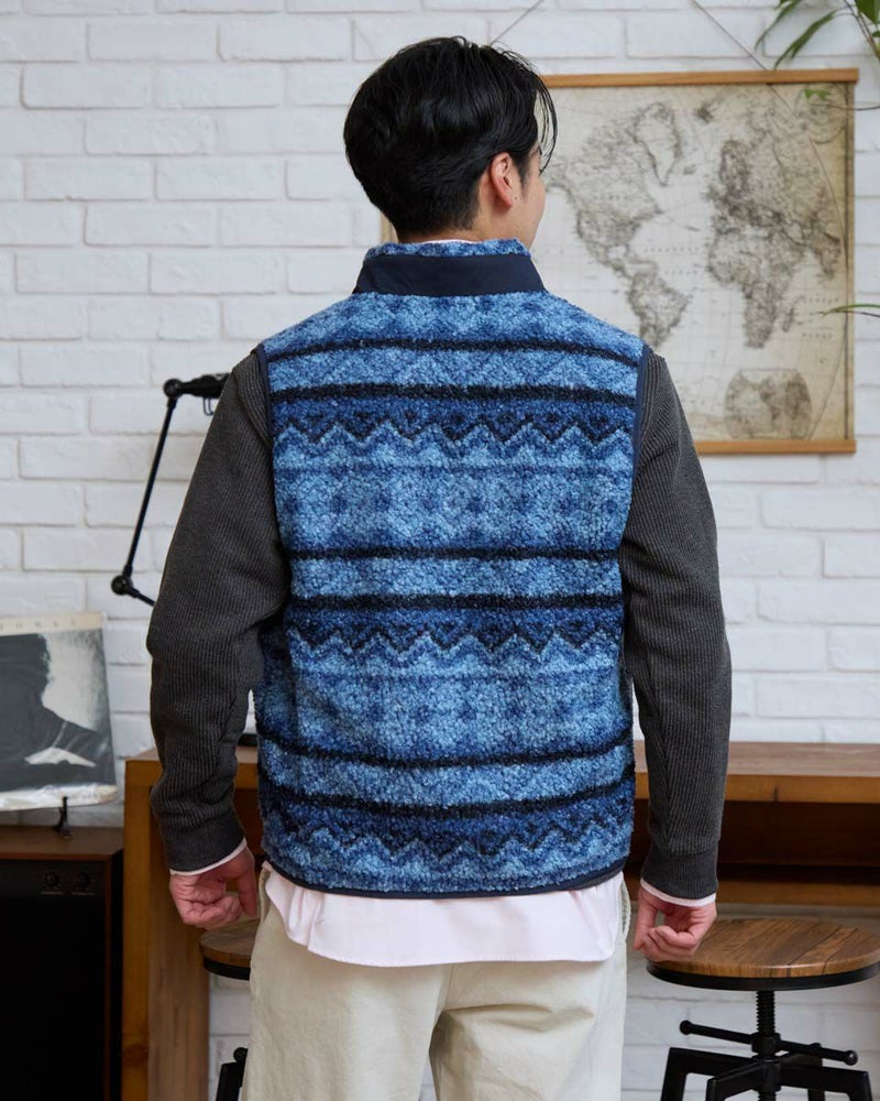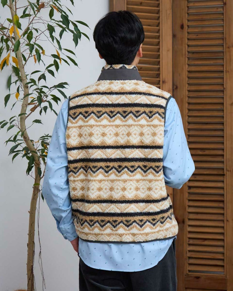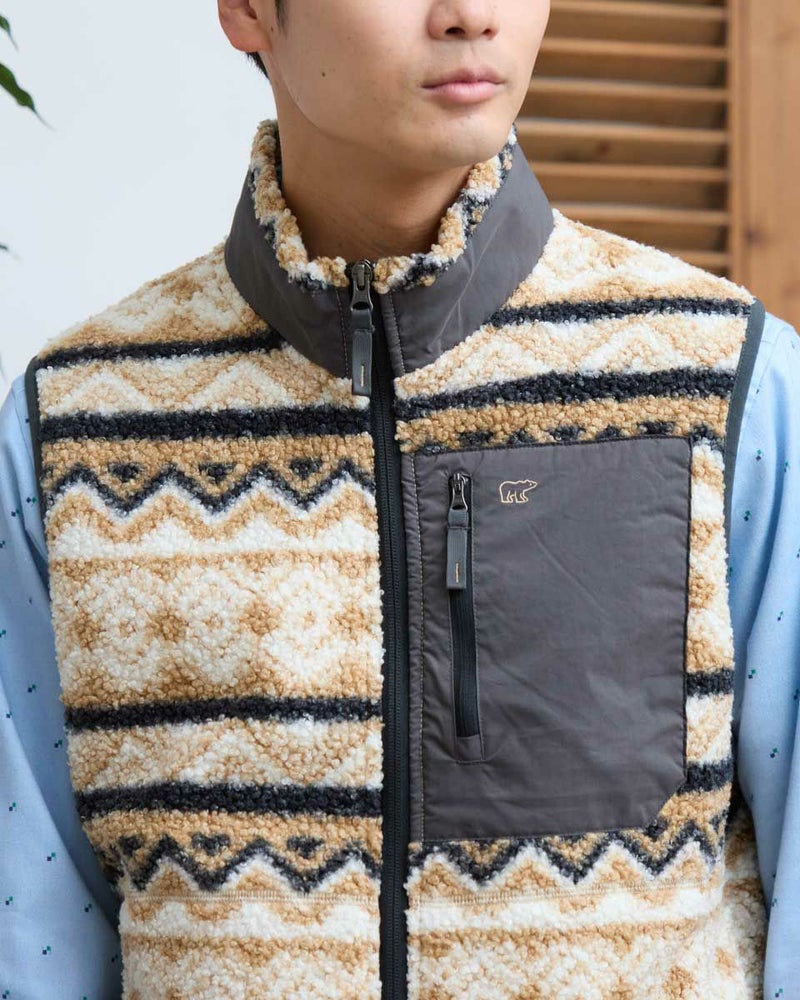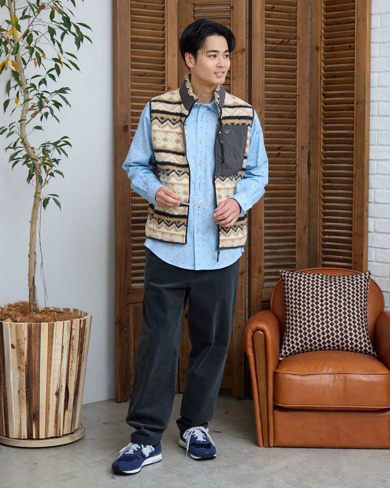 軽くて、暖かいボアフリース素材を使用したスタンドカラーベストです。レトロな印象のネイティブ柄のプリントを施しました。Tシャツやスウェットとの重ね着から、アウターのインナーまで幅広いコーディネートに活躍するベストです。 モデル身長: 180 cm 着用サイズ: L サイズ Golden Bear MEN カットソー (MEN) 【着用アイテム】314RC230 オックスシャツ 314RE224 プリントシャツ 314RE423 ハーフZIPスウェット 314RE721 ストレッチコーデュロイパンツ