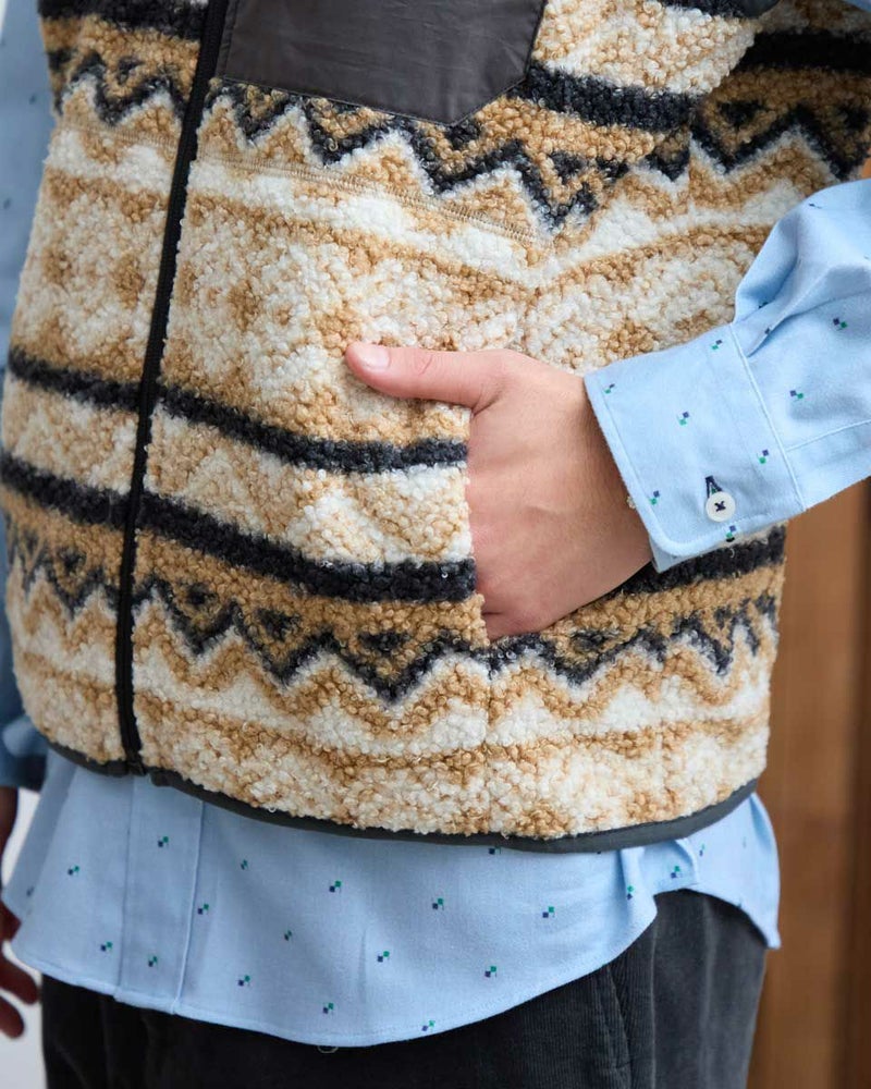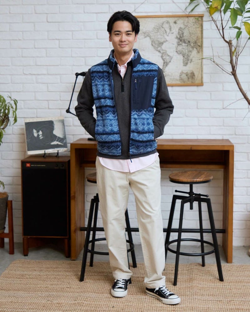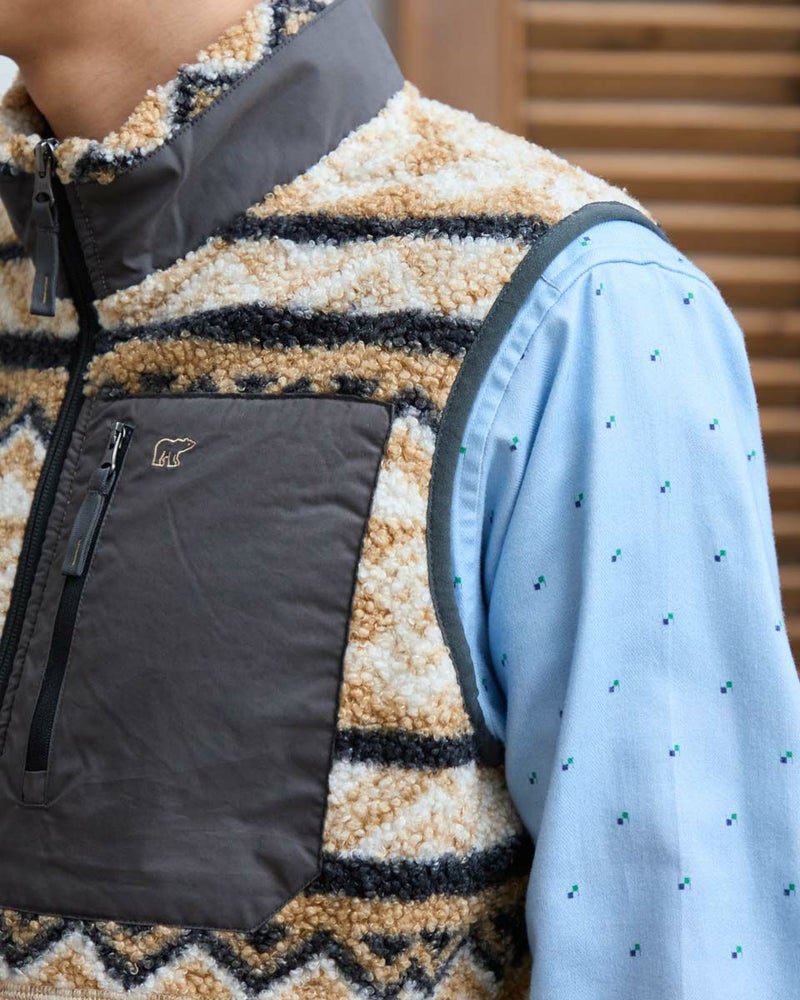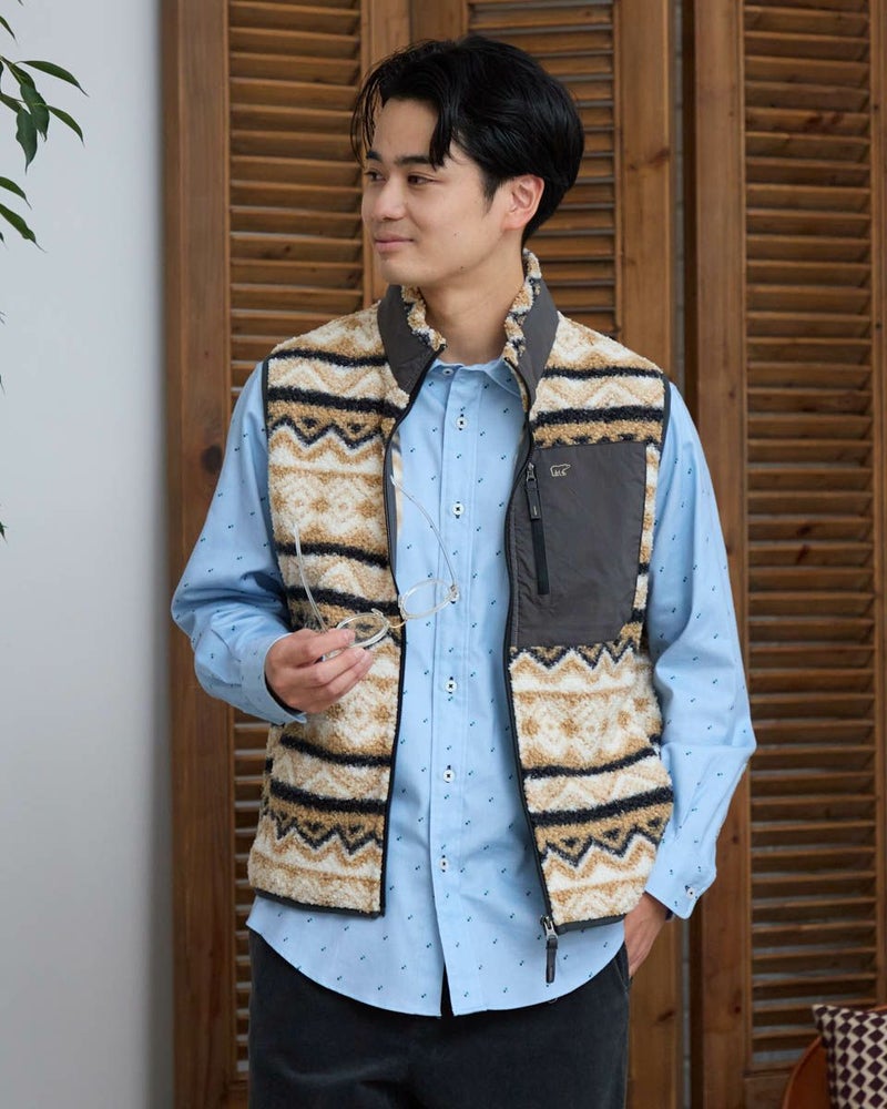 軽くて、暖かいボアフリース素材を使用したスタンドカラーベストです。レトロな印象のネイティブ柄のプリントを施しました。Tシャツやスウェットとの重ね着から、アウターのインナーまで幅広いコーディネートに活躍するベストです。 モデル身長: 180 cm 着用サイズ: L サイズ Golden Bear MEN カットソー (MEN) 【着用アイテム】314RC230 オックスシャツ 314RE224 プリントシャツ 314RE423 ハーフZIPスウェット 314RE721 ストレッチコーデュロイパンツ
