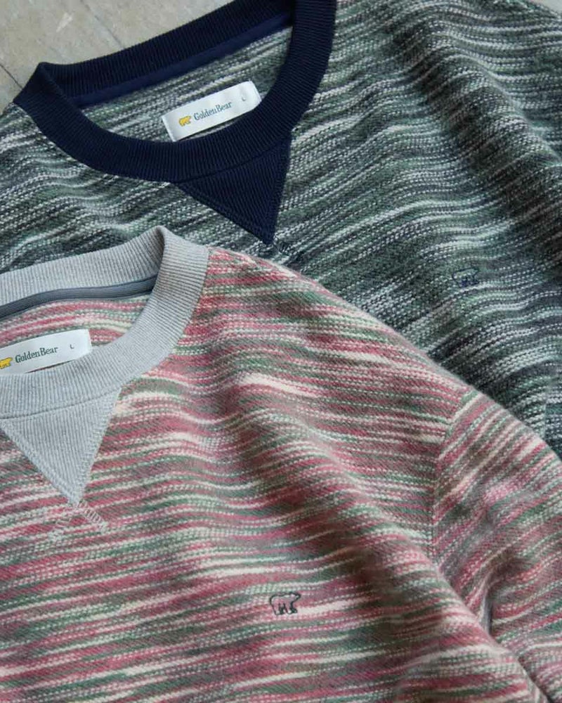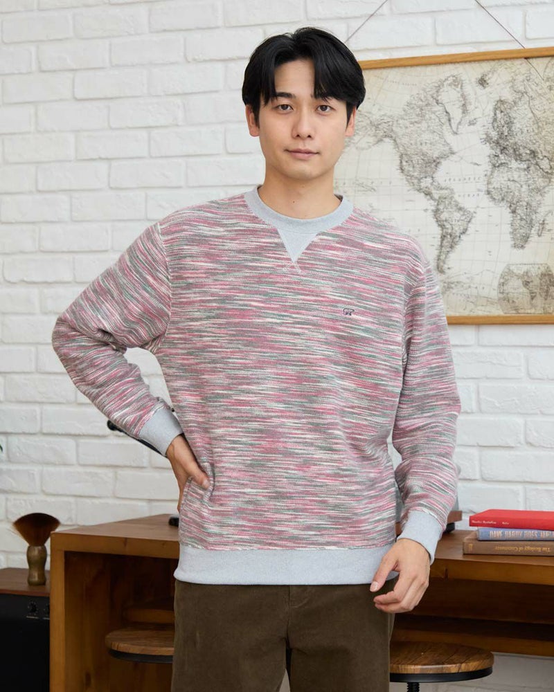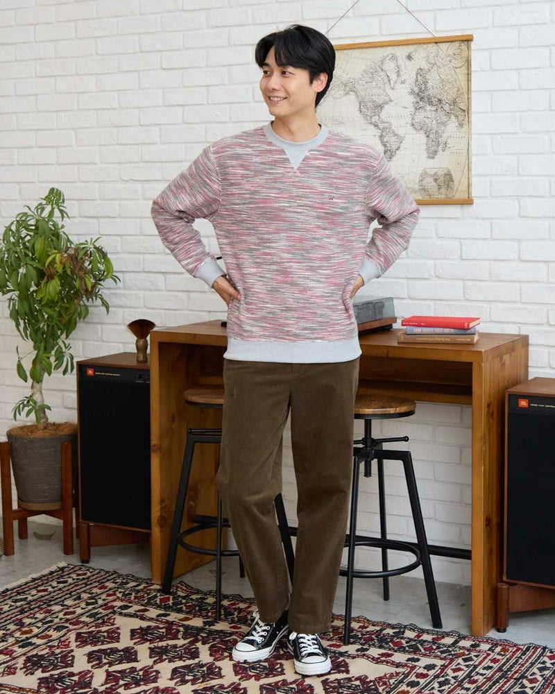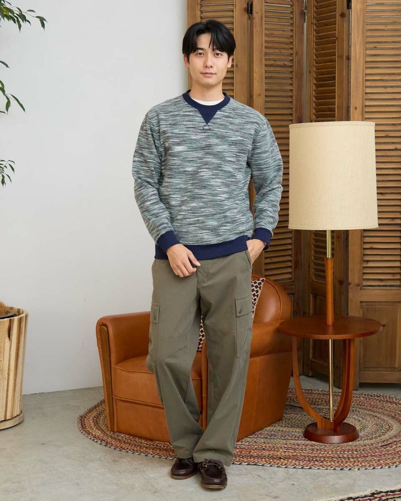 同系色のカラー糸を使用したかすり裏毛スウェットです。カラー糸の独特の表情をお楽しみください。暗くなりがちな冬のコーディネートのアクセントにオススメです。 モデル身長: 180 cm 着用サイズ: L サイズ Golden Bear MEN カットソー (MEN) 【着用アイテム】314RE720 カーゴパンツ 314RE721 ストレッチコーデュロイパンツ