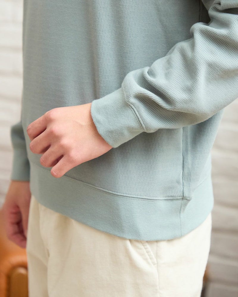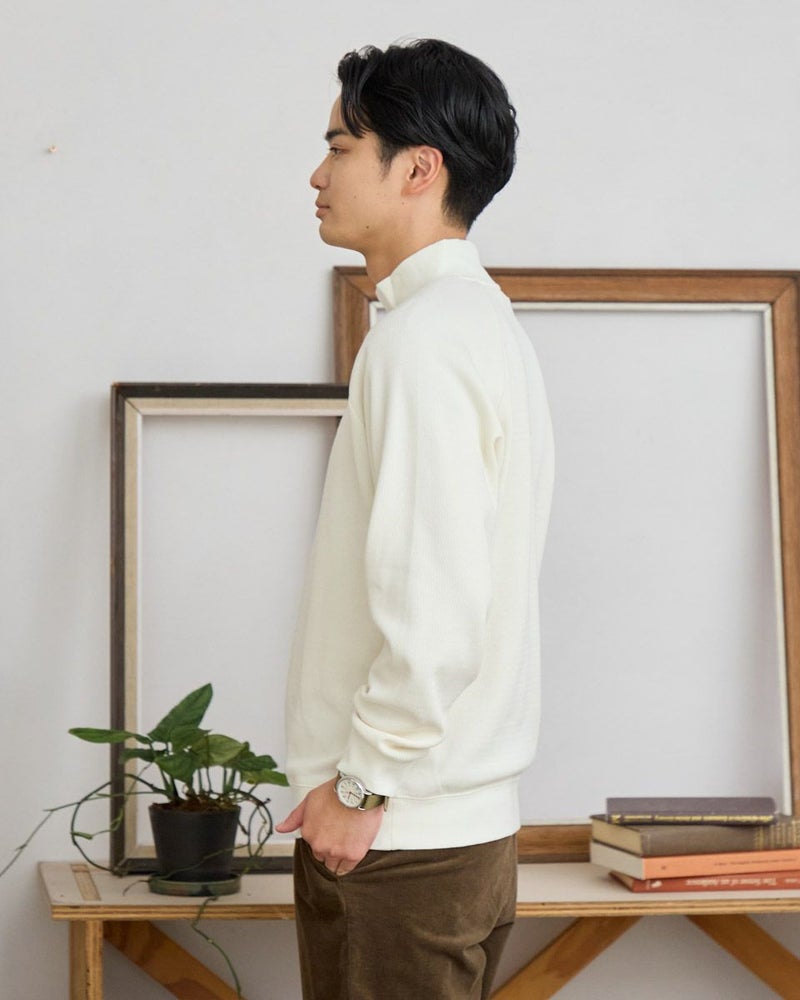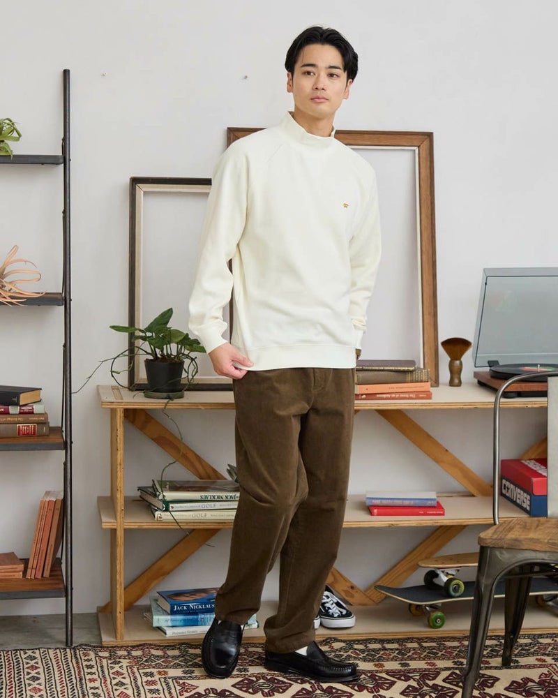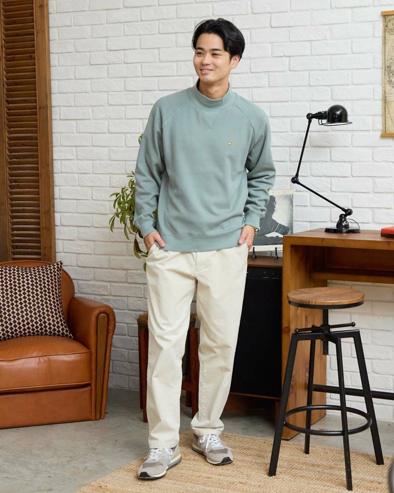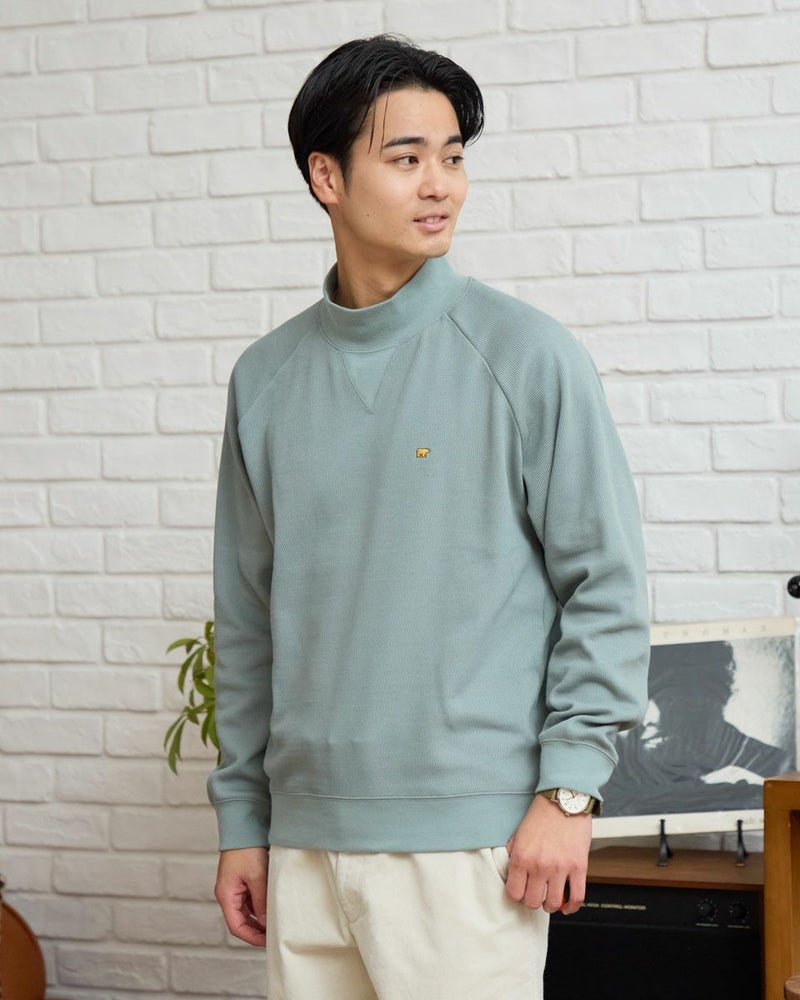 ラグランスリーブのハイネックスウェットです。サーマル素材の裏面をシャギー起毛しており、滑らかな肌ざわりと暖かさが特徴です。表面感があるニットのような見た目ですが、家庭洗濯が可能でお手入れのしやすさがポイントです。 モデル身長: 176cm 着用サイズ: L サイズ Golden Bear MEN カットソー (MEN) 【着用アイテム】317RE130 Pコート 314RE632 洗えるGBラムウールニット 314RE721 ストレッチコーデュロイパンツ
