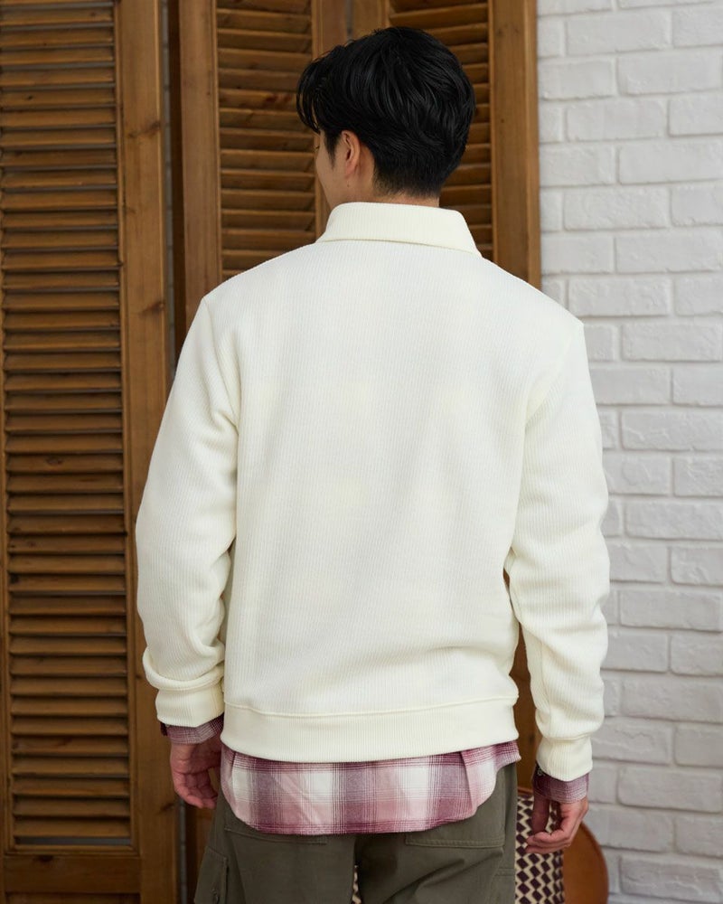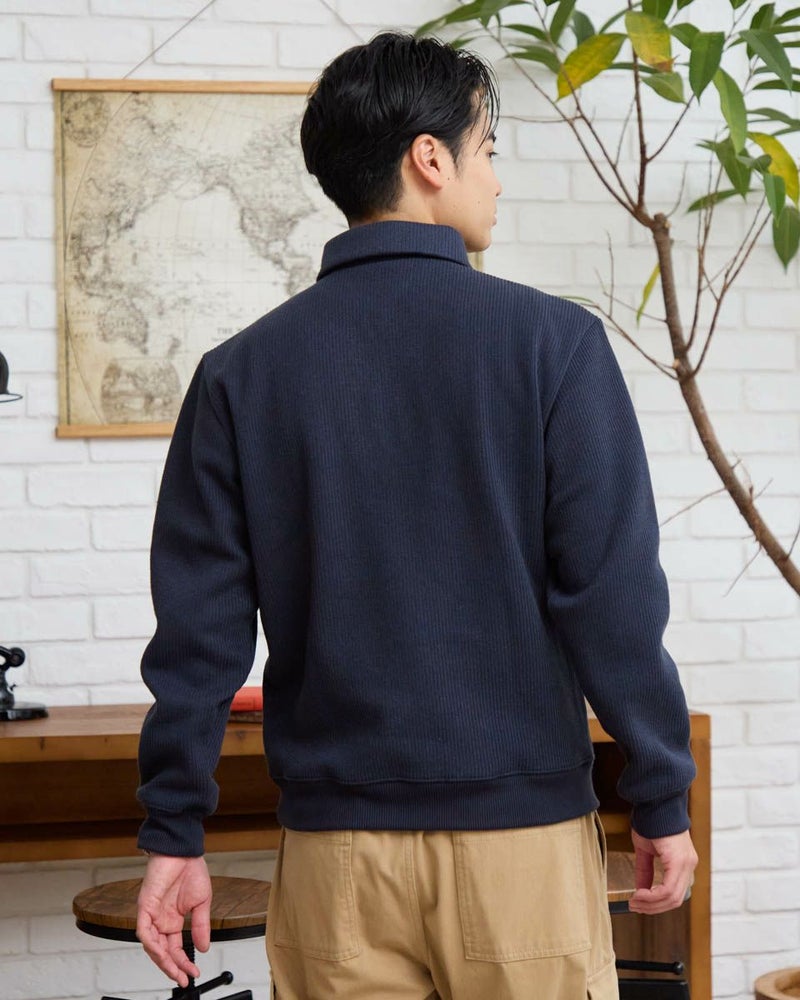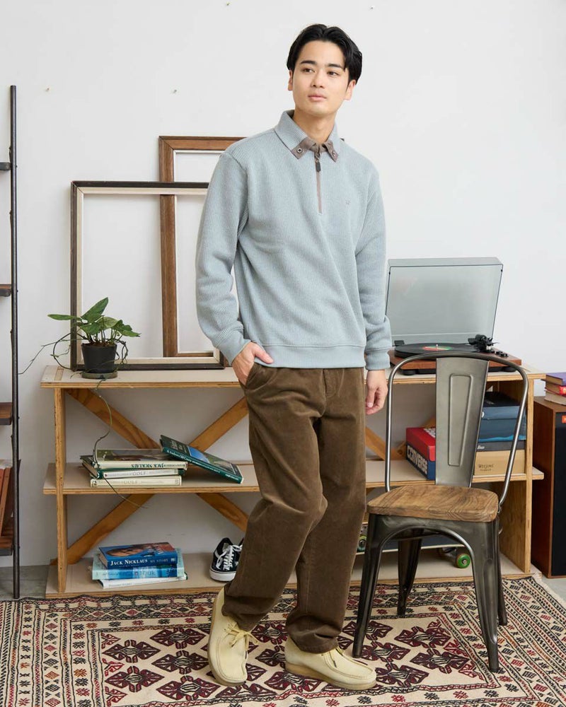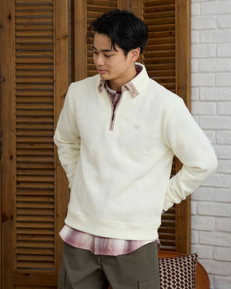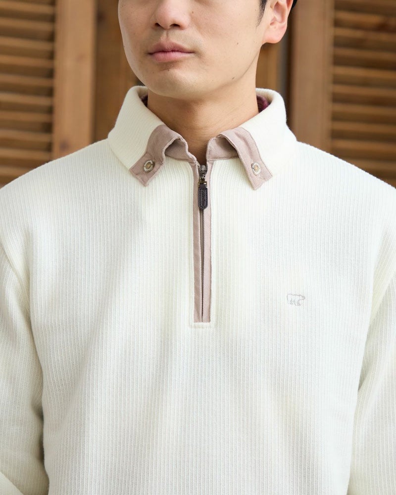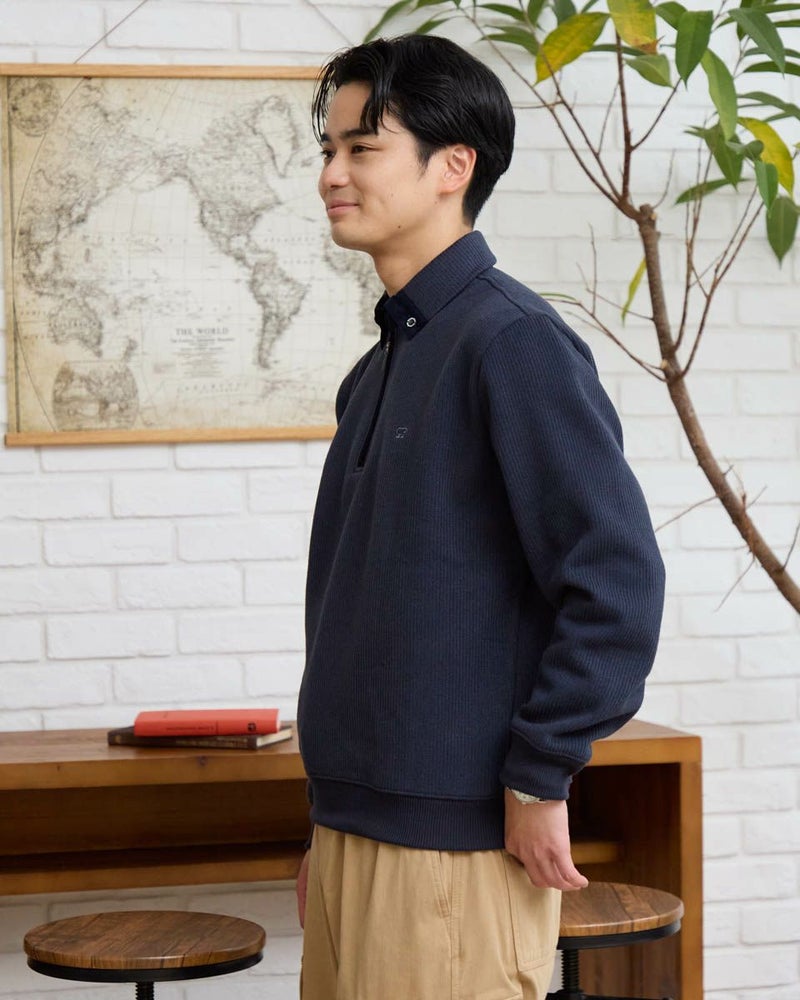 首回りが暖かいリブ襟のZIPスウェットです。保温性に優れた裏起毛素材を使用しています。やわらかく、肌ざわりのよさが特徴です。部分的に配したコーデュロイが上品さを演出するスウェットです。 モデル身長: 176cm 着用サイズ: L サイズ Golden Bear MEN カットソー (MEN) 【着用アイテム】314RC230 オックスシャツ 314RE402 ボアベスト 314RE720 カーゴパンツ 314RE721 ストレッチコーデュロイパンツ