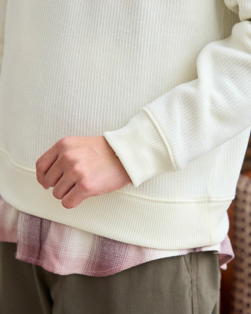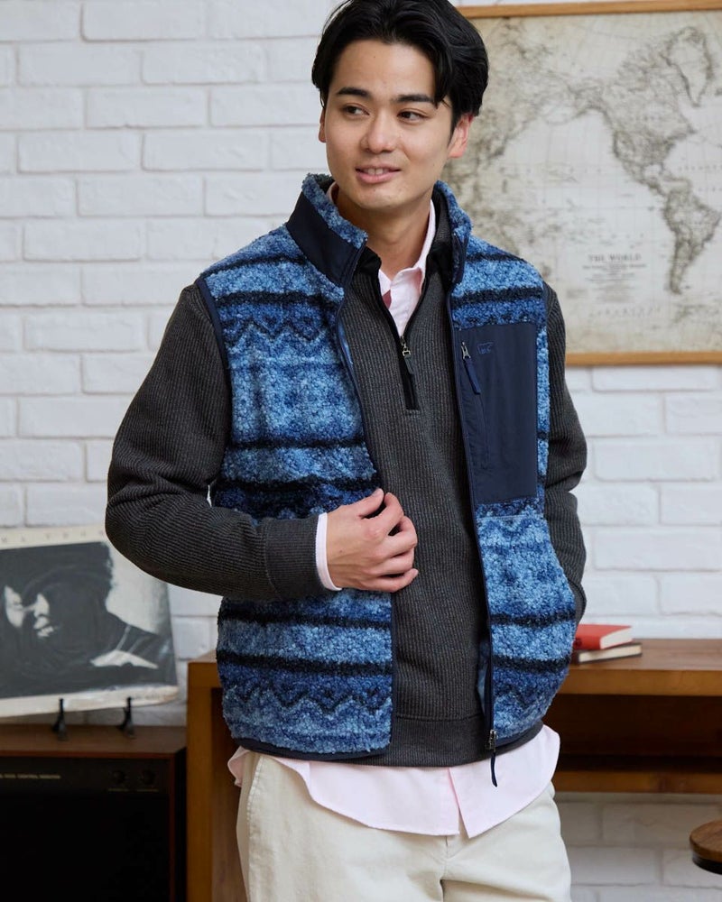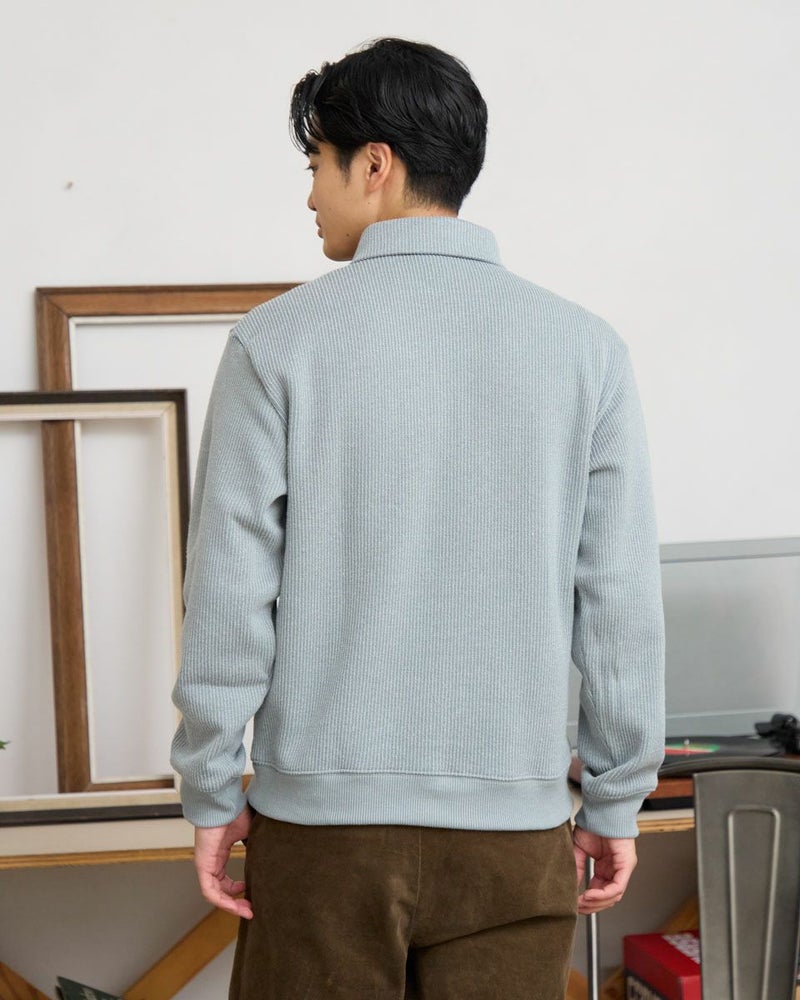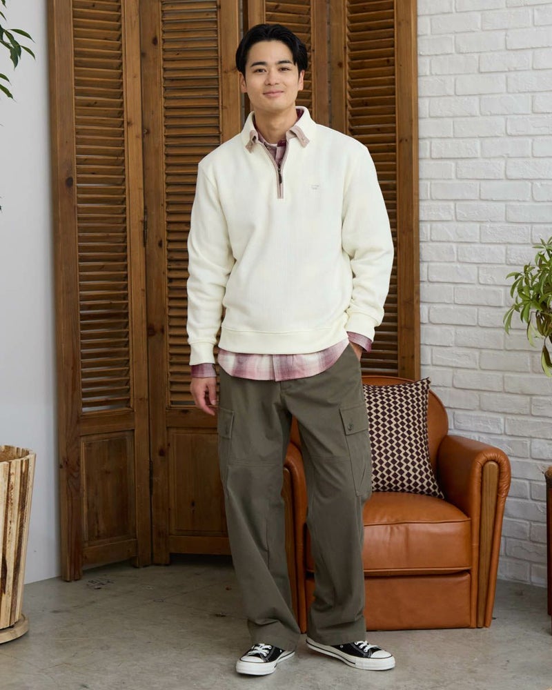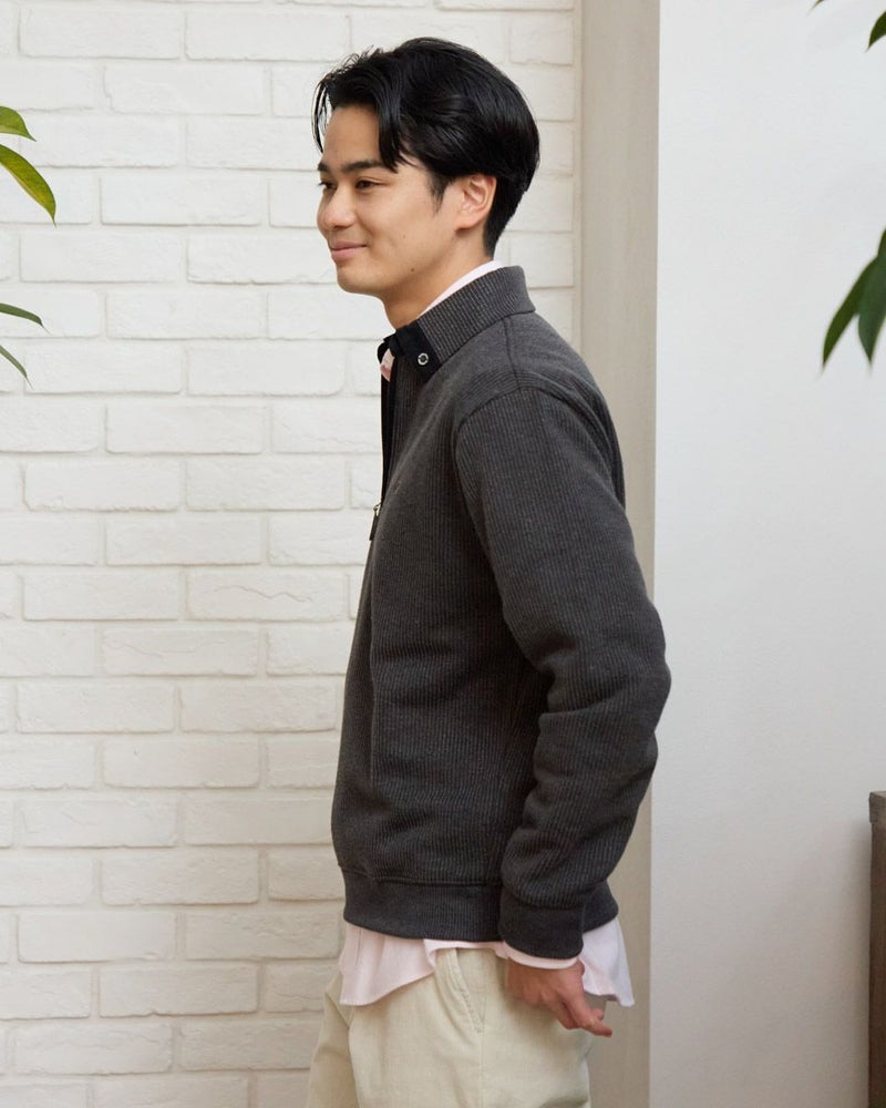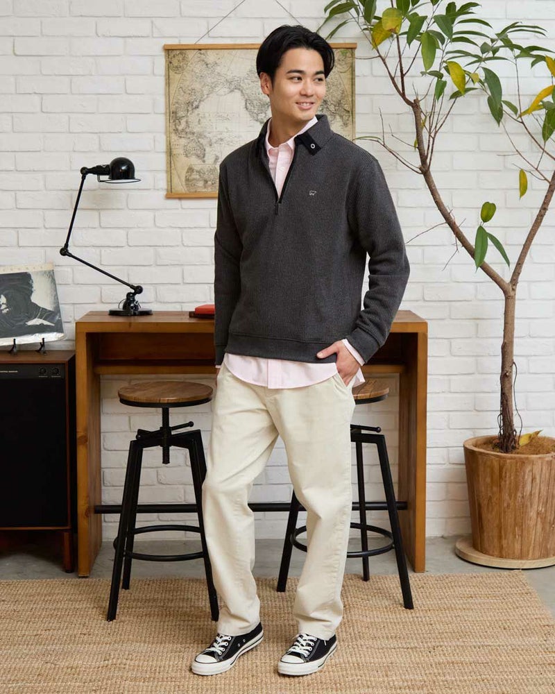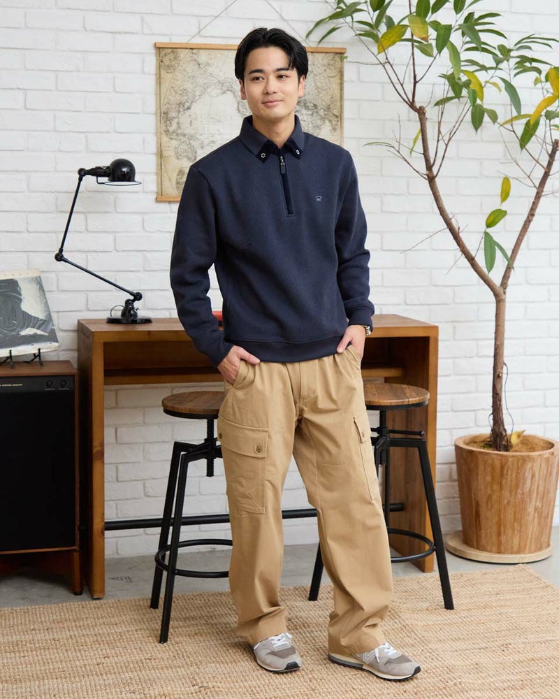 首回りが暖かいリブ襟のZIPスウェットです。保温性に優れた裏起毛素材を使用しています。やわらかく、肌ざわりのよさが特徴です。部分的に配したコーデュロイが上品さを演出するスウェットです。 モデル身長: 176cm 着用サイズ: L サイズ Golden Bear MEN カットソー (MEN) 【着用アイテム】314RC230 オックスシャツ 314RE402 ボアベスト 314RE720 カーゴパンツ 314RE721 ストレッチコーデュロイパンツ