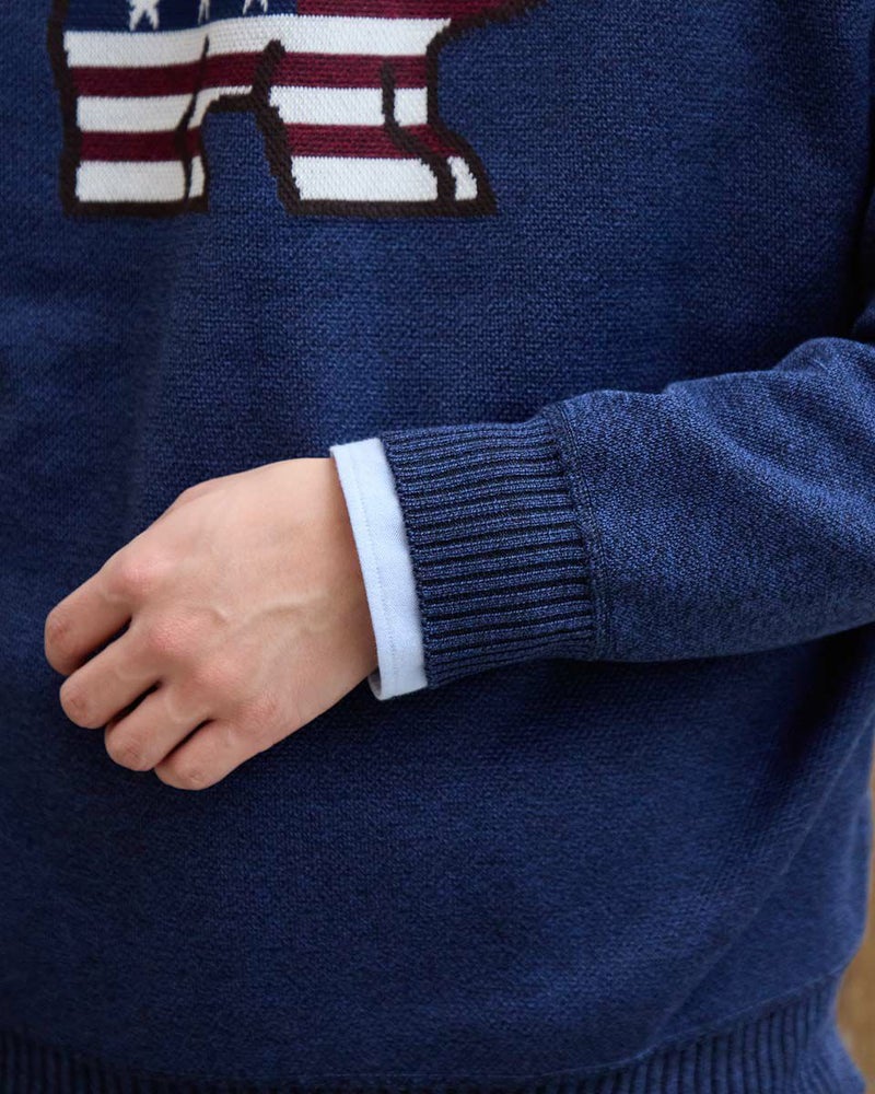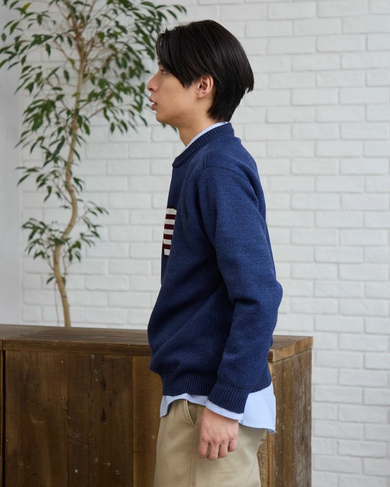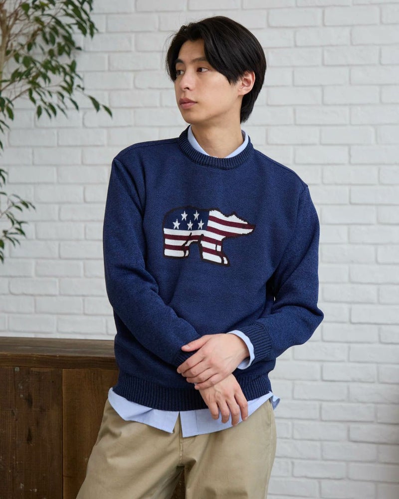 ニットとカットソーを切替えたクルーネックスウェットです。前身頃は星条旗モチーフのクマをジャカードで編み立てたニット素材。袖・後身頃はフリース素材を使用しています。家庭洗濯が可能でお手入れのしやすさがポイントです。 モデル身長: 180 cm 着用サイズ: L サイズ Golden Bear MEN カットソー (MEN) 【着用アイテム】314RC230 オックスシャツ 314RD433 吸湿発熱ハイネック長袖Tシャツ 314R8702 デニム