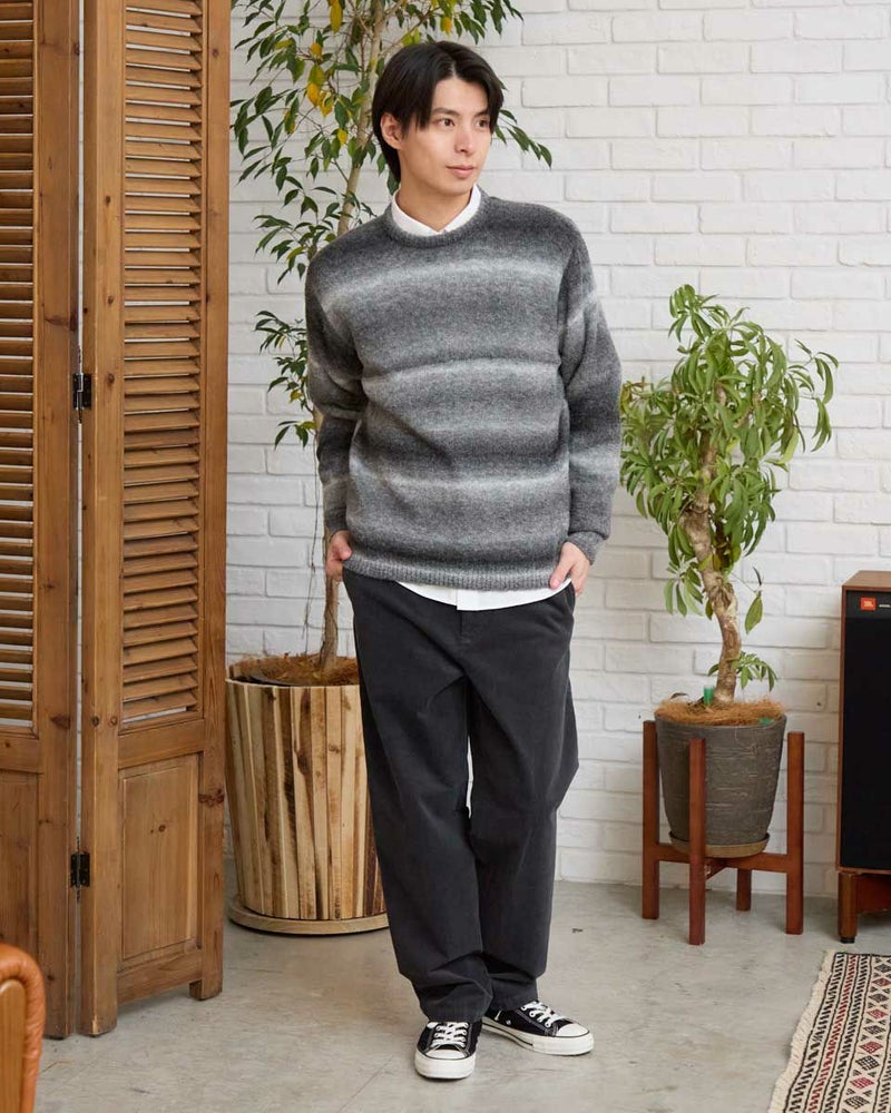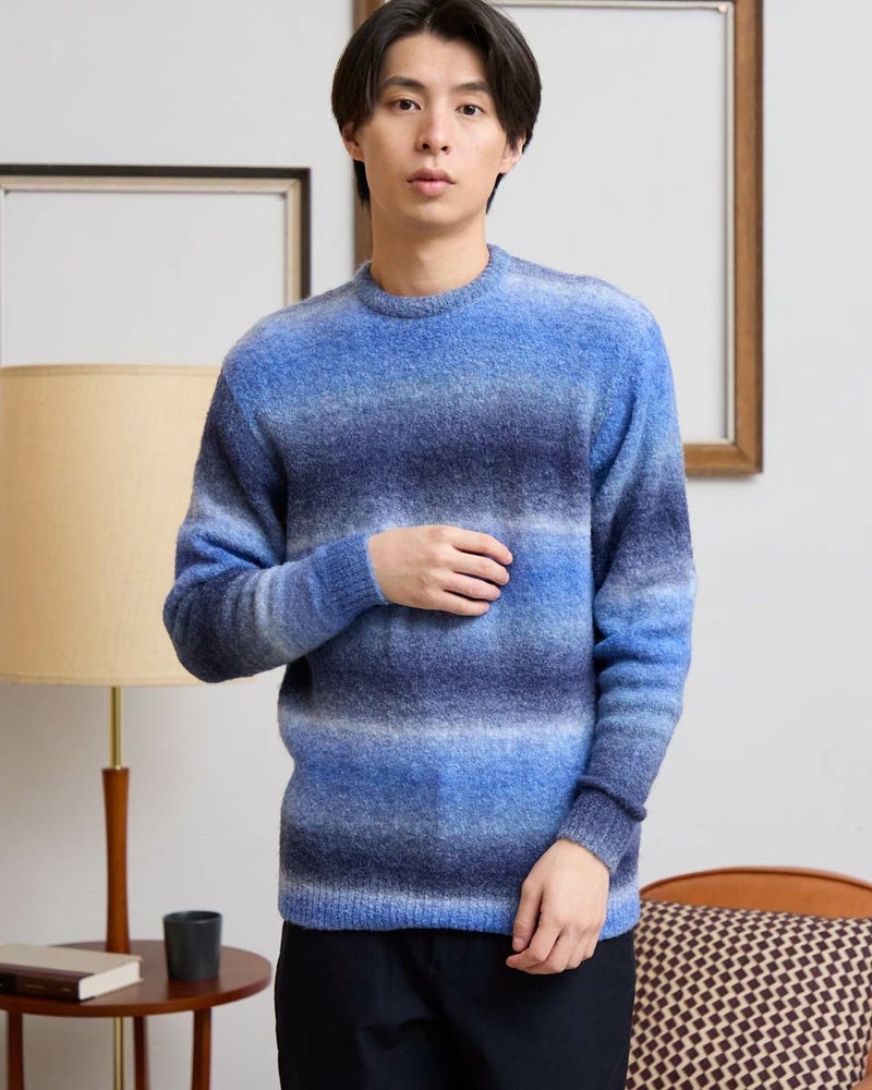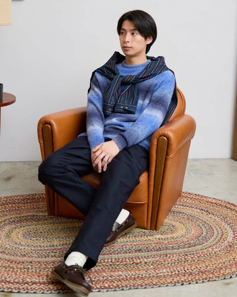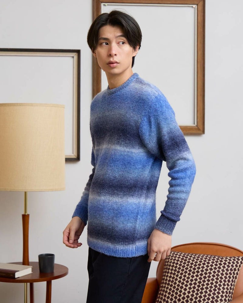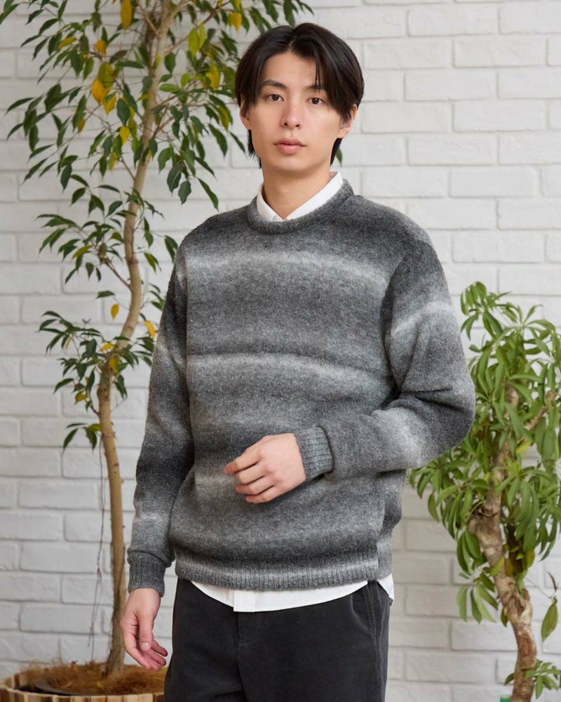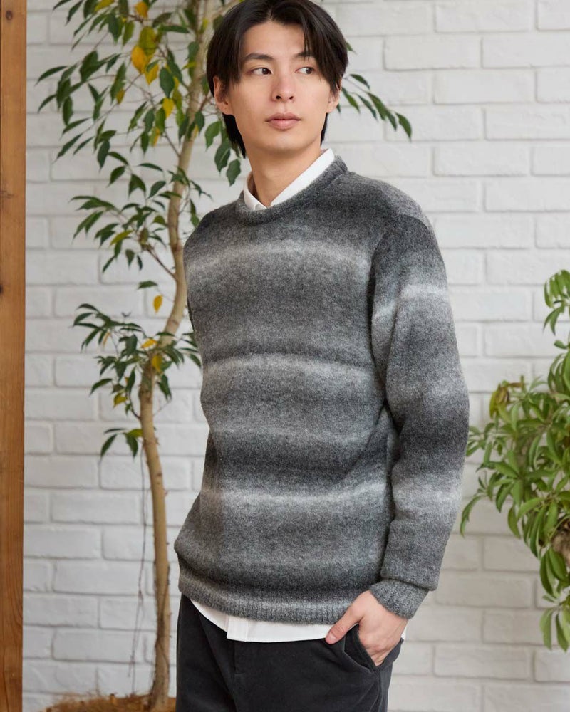 リラックスシルエットのボーダークルーネックニットです。1本の糸をグラデーションカラーで染め分けした、かすり染めの糸を使用しています。一枚ずつ色の出方や表情が異なります。もっちりとした弾力性のある触感で柔らかく、着心地のよさが特徴です。ご家庭での手洗い洗濯が可能です。 モデル身長: 180 cm 着用サイズ: L サイズ Golden Bear MEN ニット (MEN) 【着用アイテム】314RC230 オックスシャツ 314RE225 ストライプBDシャツ 314RE721 ストレッチコーデュロイパンツ 314RE722 ストレッチスリムイージーパンツ