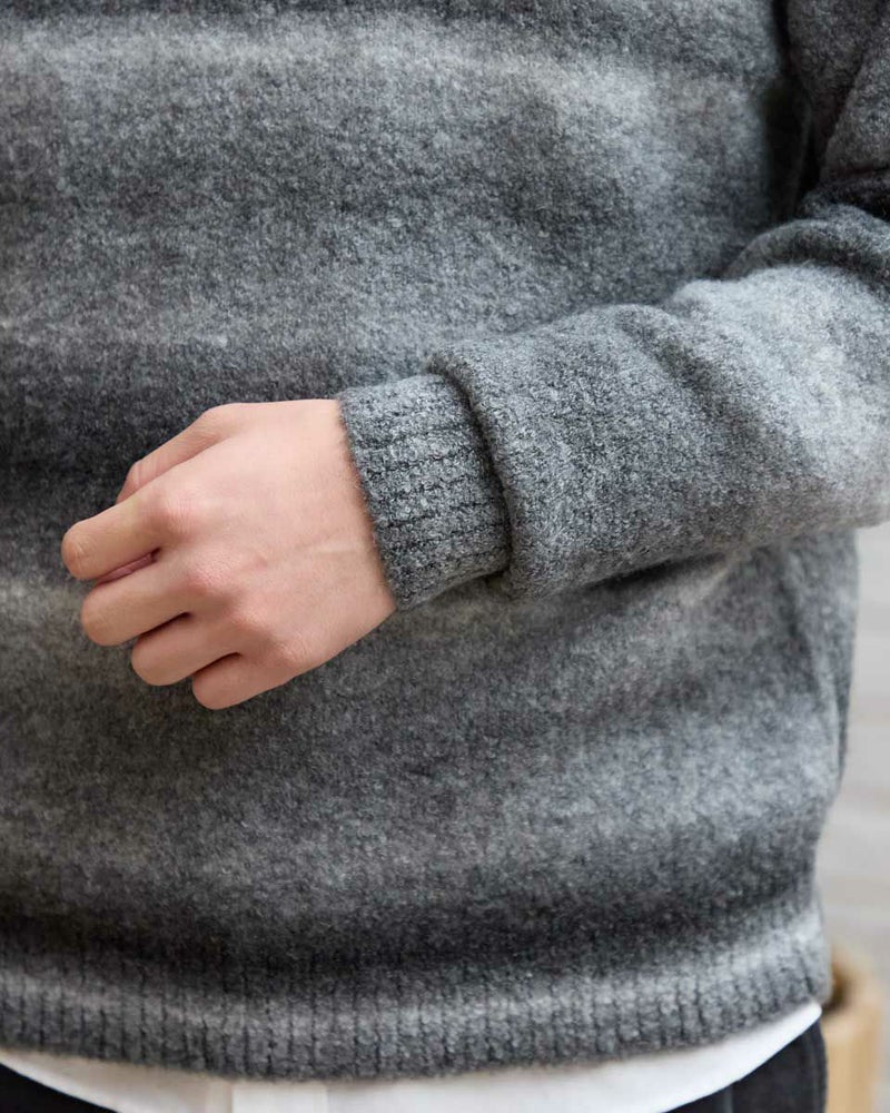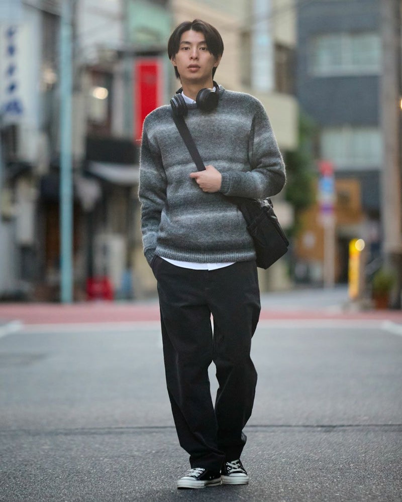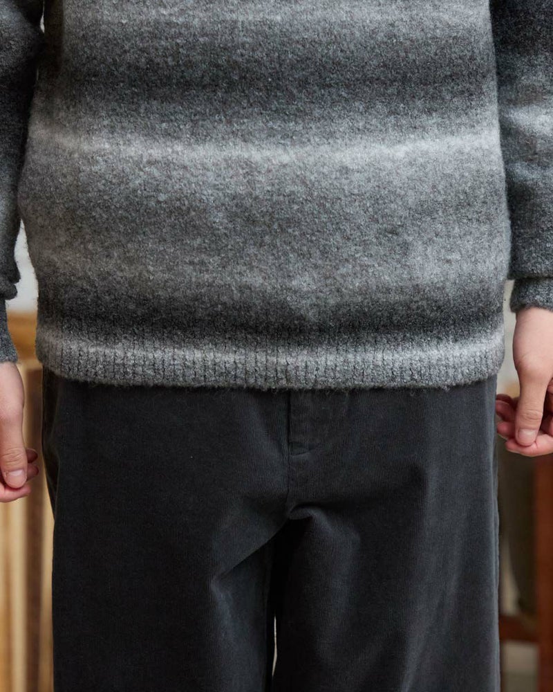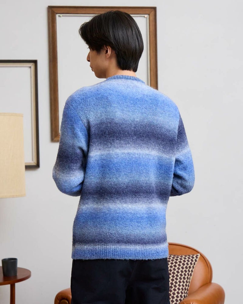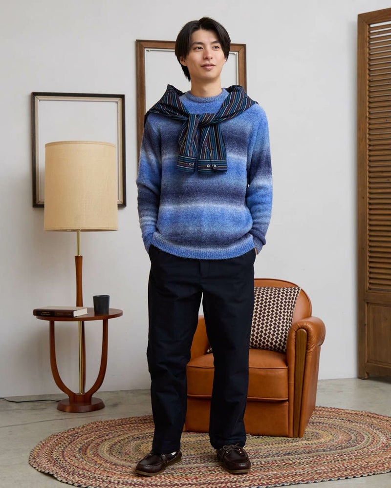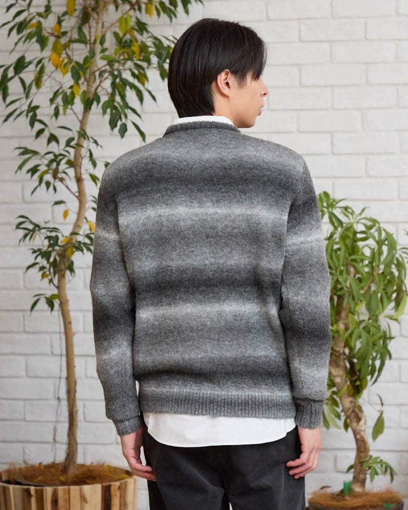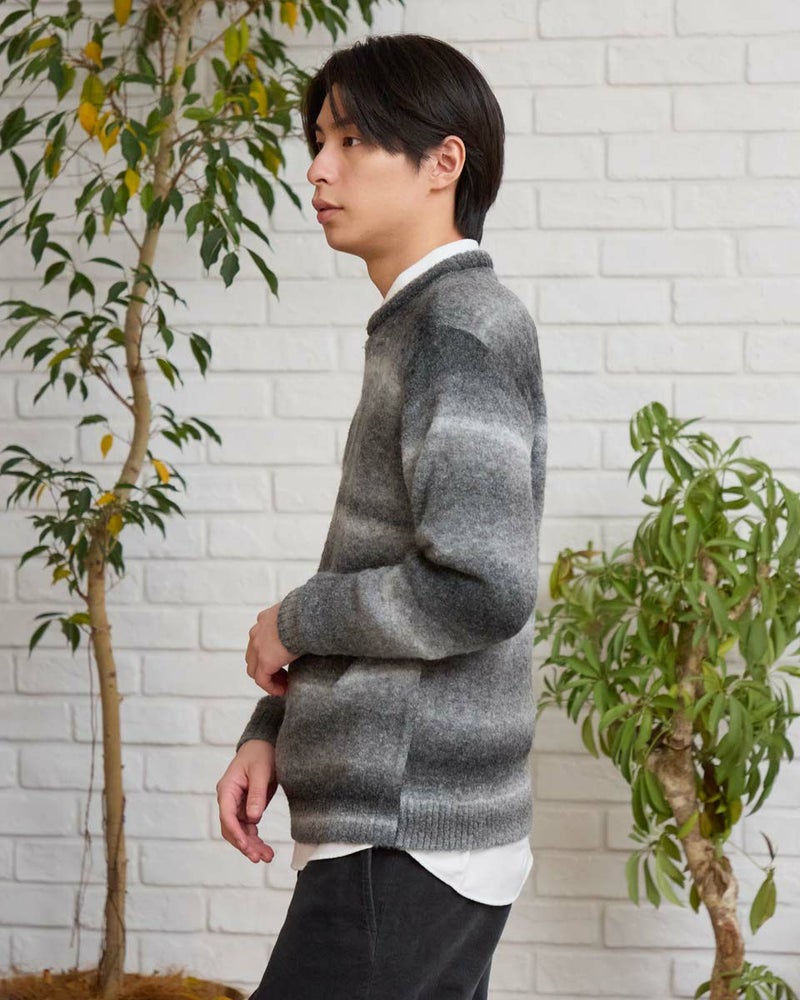 リラックスシルエットのボーダークルーネックニットです。1本の糸をグラデーションカラーで染め分けした、かすり染めの糸を使用しています。一枚ずつ色の出方や表情が異なります。もっちりとした弾力性のある触感で柔らかく、着心地のよさが特徴です。ご家庭での手洗い洗濯が可能です。 モデル身長: 180 cm 着用サイズ: L サイズ Golden Bear MEN ニット (MEN) 【着用アイテム】314RC230 オックスシャツ 314RE225 ストライプBDシャツ 314RE721 ストレッチコーデュロイパンツ 314RE722 ストレッチスリムイージーパンツ