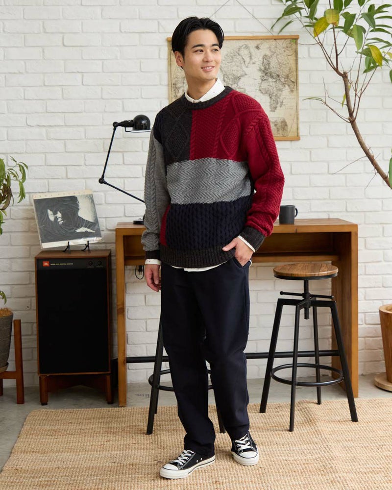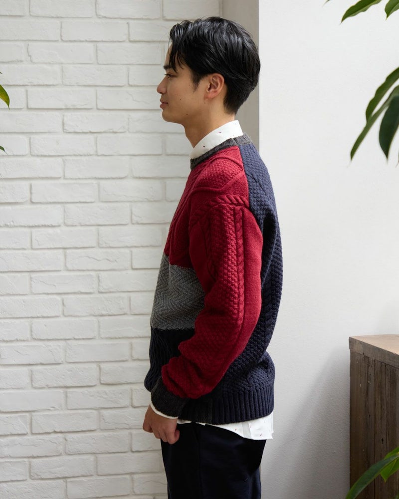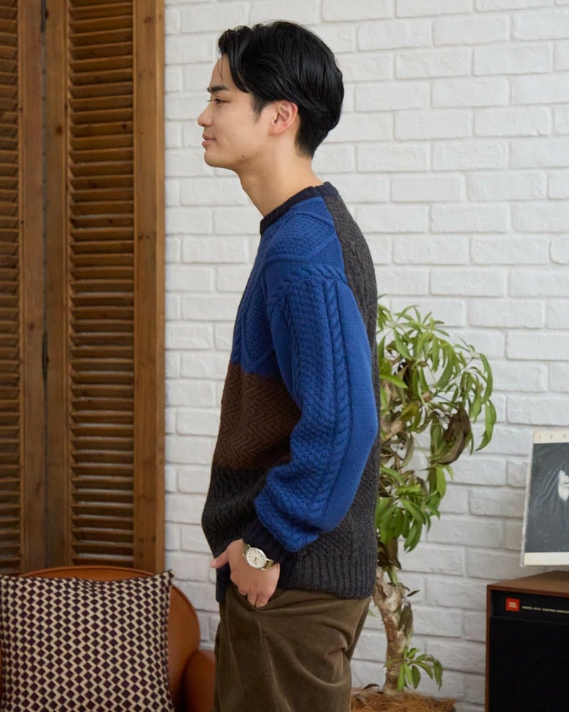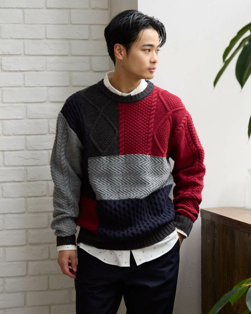 異なる編み柄とカラーをパッチワーク風に切り替えたクルーネックニットです。5ゲージで編みたてボリューム感があり、抜群の暖かさが特徴です。立体的な編み模様が魅力です。ご家庭での手洗い洗濯が可能です。 モデル身長: 176 cm 着用サイズ: L サイズ Golden Bear MEN ニット (MEN) 【着用アイテム】314RE224 プリントシャツ 314RE721 ストレッチコーデュロイパンツ 314RE722 ストレッチスリムイージーパンツ
