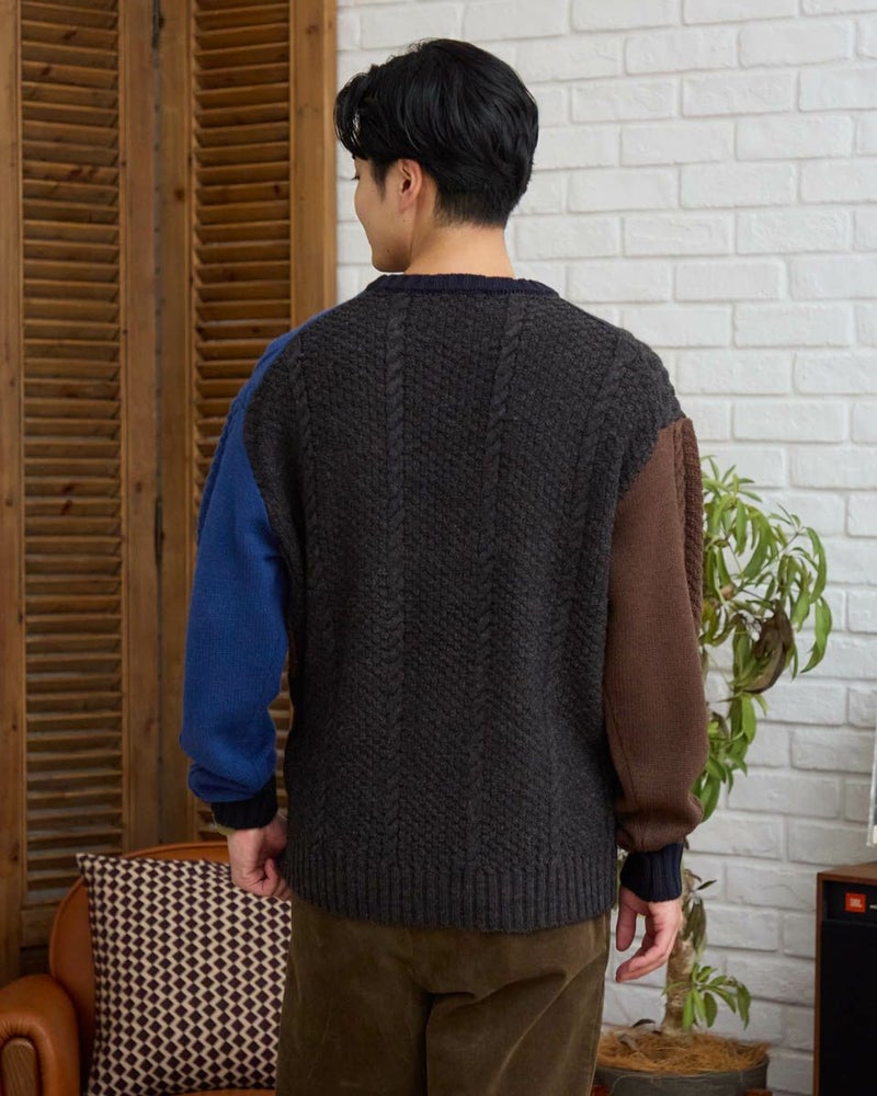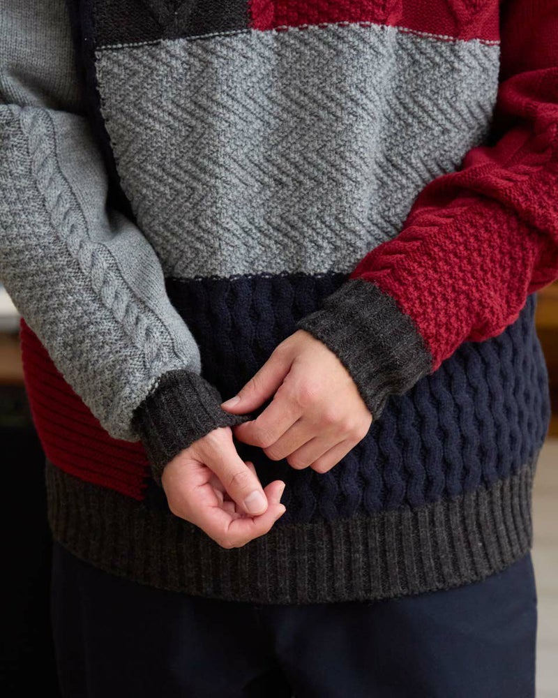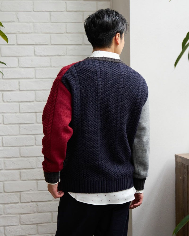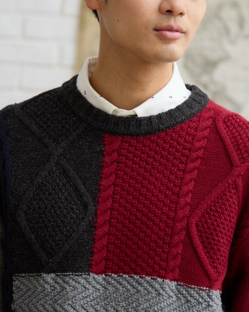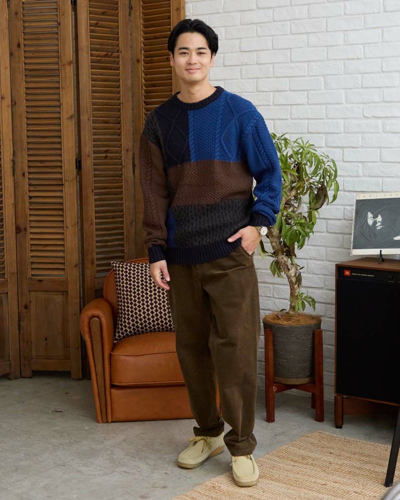 異なる編み柄とカラーをパッチワーク風に切り替えたクルーネックニットです。5ゲージで編みたてボリューム感があり、抜群の暖かさが特徴です。立体的な編み模様が魅力です。ご家庭での手洗い洗濯が可能です。 モデル身長: 176 cm 着用サイズ: L サイズ Golden Bear MEN ニット (MEN) 【着用アイテム】314RE224 プリントシャツ 314RE721 ストレッチコーデュロイパンツ 314RE722 ストレッチスリムイージーパンツ