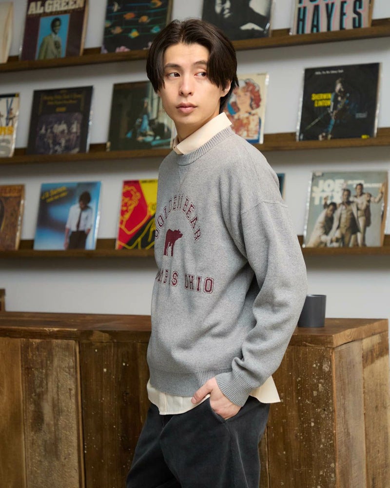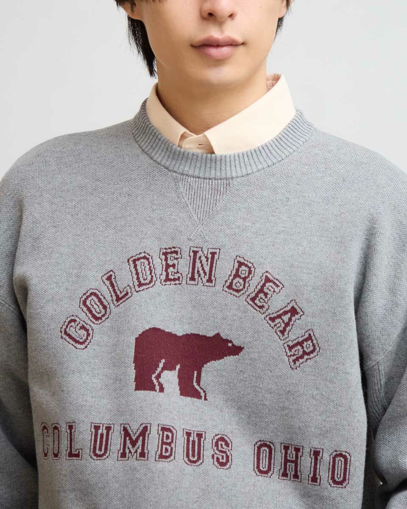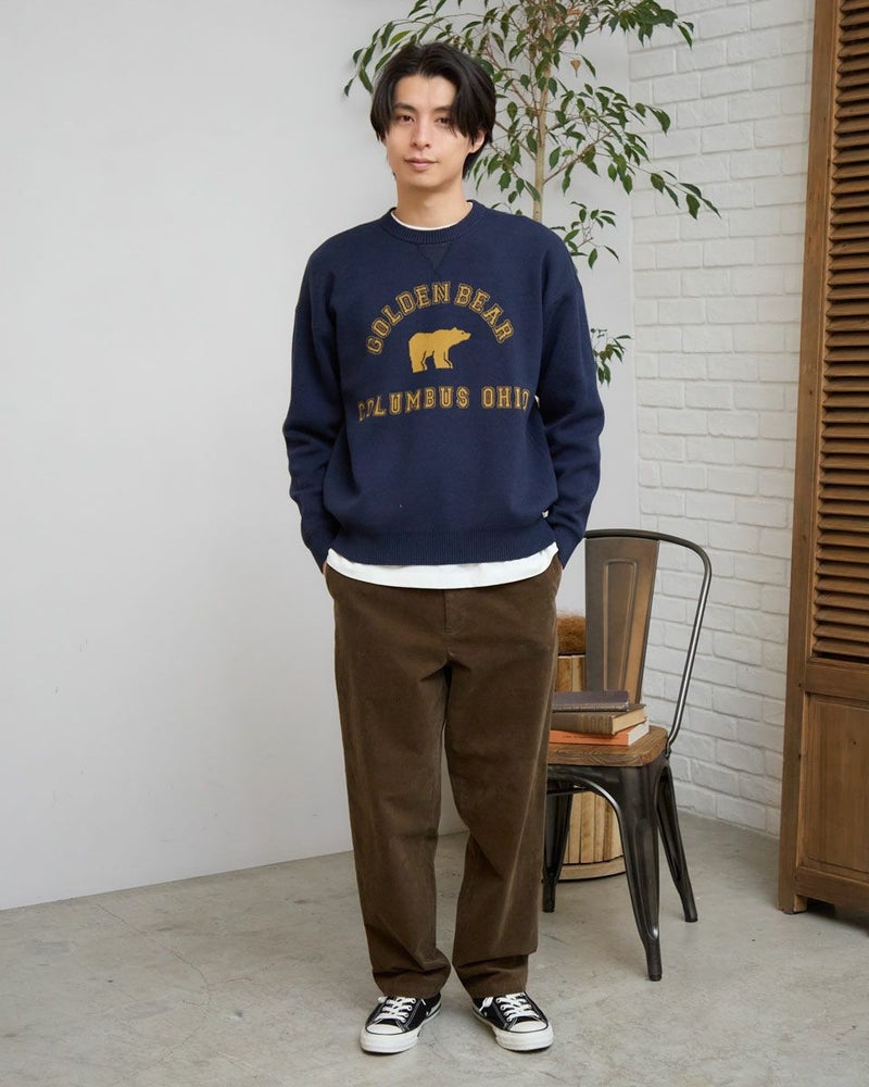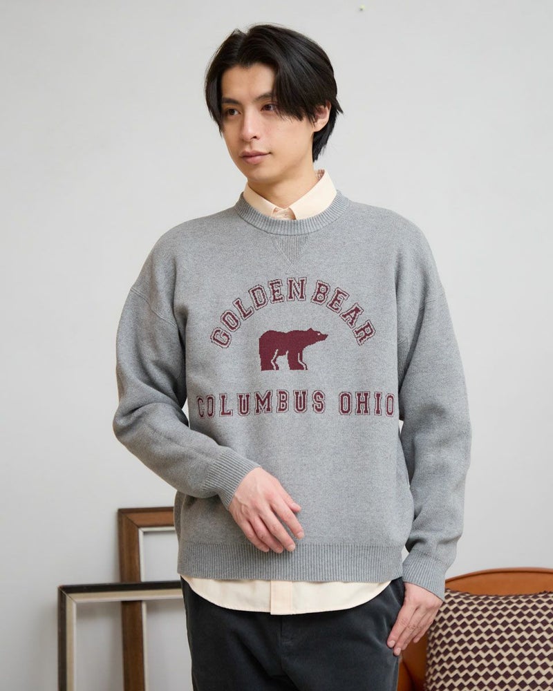 カレッジロゴスウェットをモチーフに、ロゴとアイコンのクマをニットで表現しました。王道のプレッピーコーデがおすすめです。ご家庭での手洗い洗濯が可能です。 モデル身長: 180 cm 着用サイズ: L サイズ Golden Bear MEN ニット (MEN) ウィメンズサイズはこちら 家族コーディネートアイテムはこちら 【着用アイテム】314RC230 オックスシャツ 314RE721 ストレッチコーデュロイパンツ