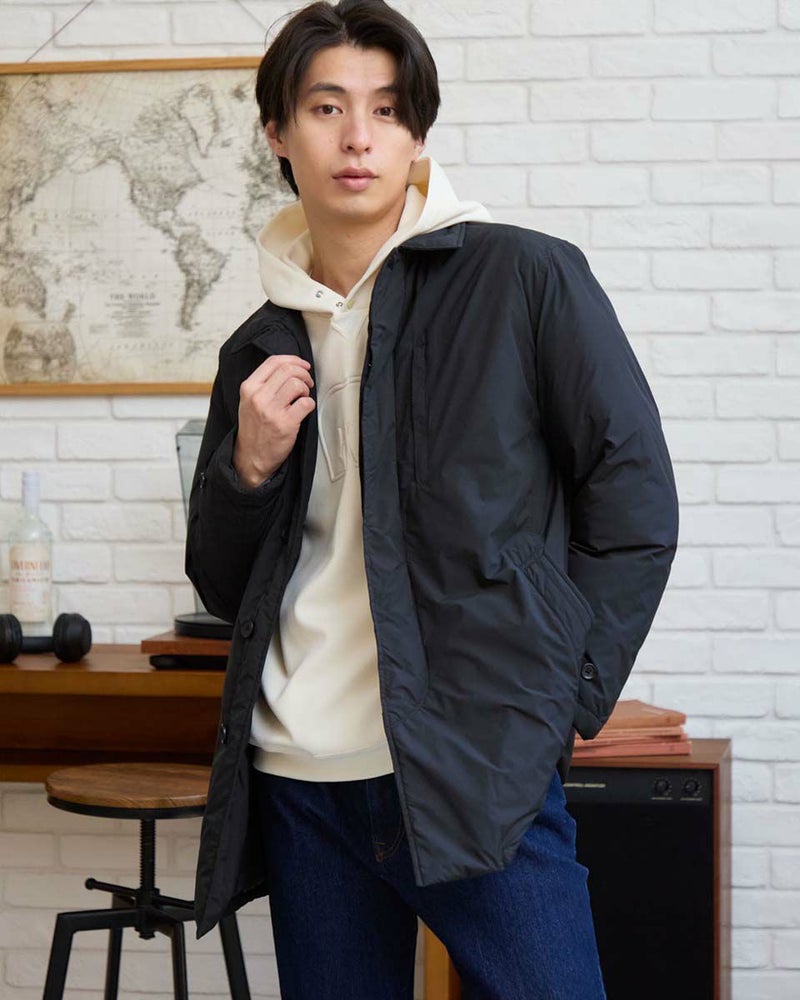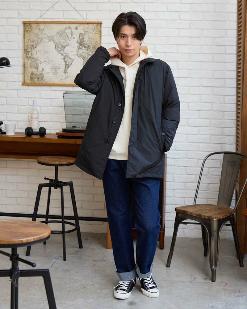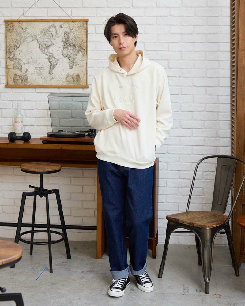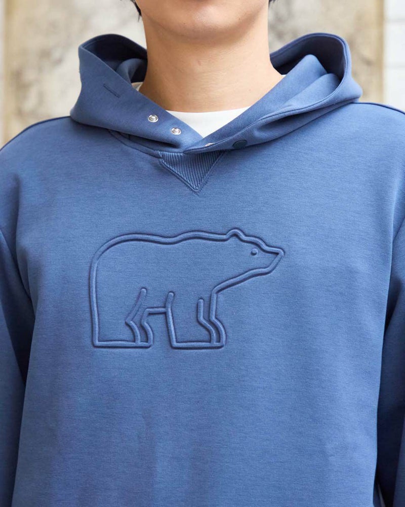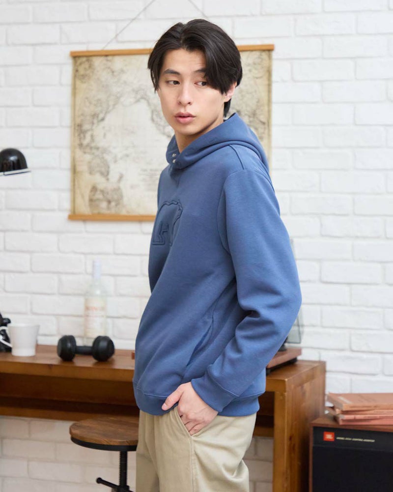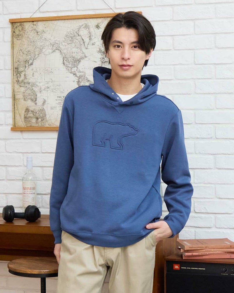 軽くてやわらかいダンボールニットのプルオーバーパーカです。ダンボールニット生地は空気をためやすく、薄手でも暖かみを感じやすいのが特徴です。アイコンのクマをエンボス加工で立体的に表現しました。コーディネートのアクセントになるスウェットです。 モデル身長: 180 cm 着用サイズ: L サイズ Golden Bear MEN カットソー (MEN) 【着用アイテム】314U1161 ダウンコート 314R8702 デニム 314RC700 ストレッチワイドチノ