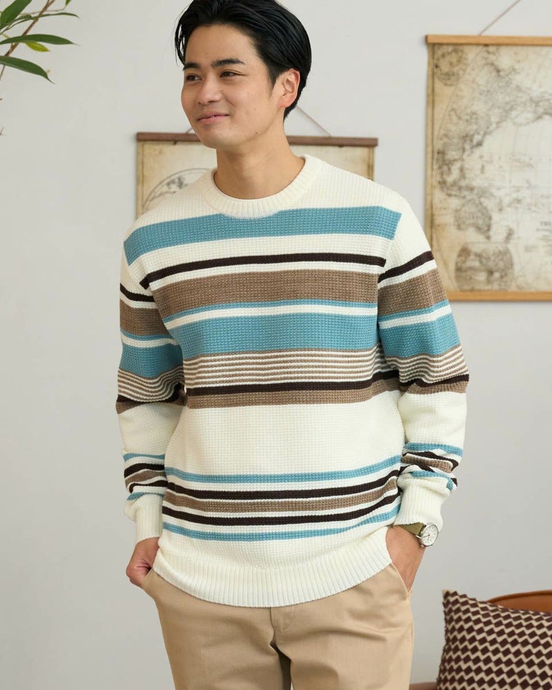 パネルボーダーのクルーニットです。格子状の凹凸が特徴的なワッフル組織で編み立てました。表情のあるワッフルは奥行きと深みがあり、コーディネートでボーダーの色柄が映えるニットです。