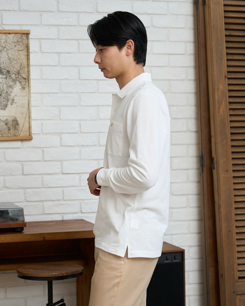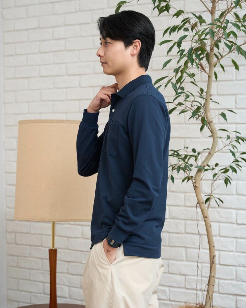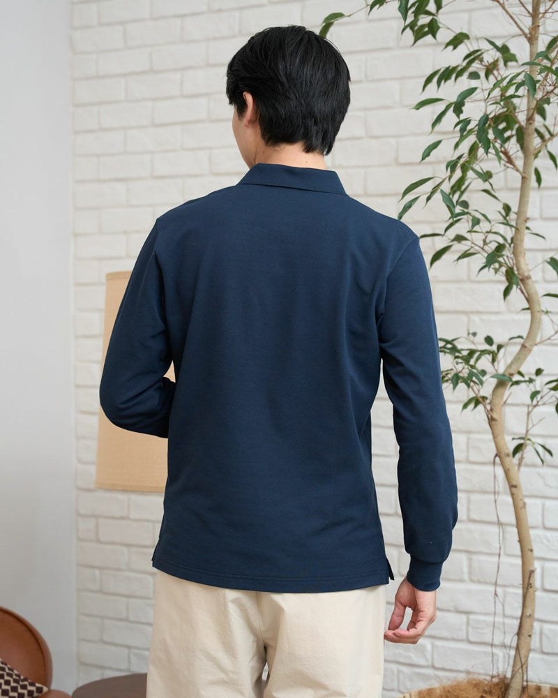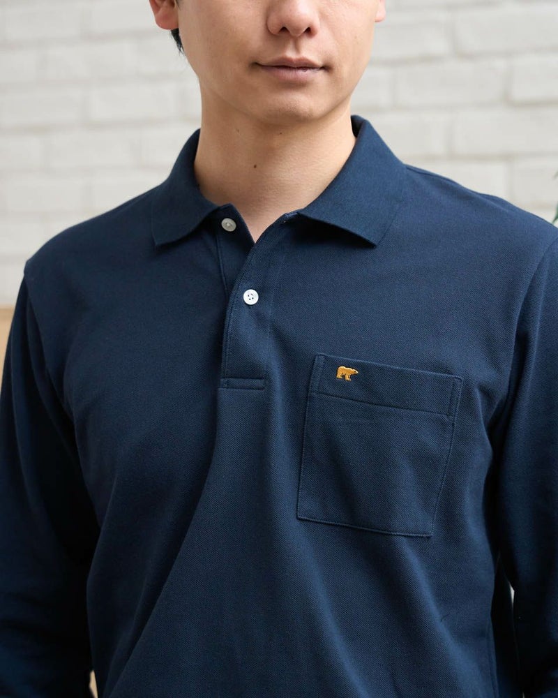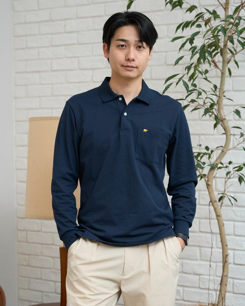 ゴールデンベアのシンボル、金熊の刺繍を胸元にあしらった、長く愛される定番長袖ポロシャツです。通気性と吸水速乾性に優れた鹿の子生地は、汗ばむ季節もサラリと快適。制菌加工をしているので、気になる汗や部屋干しの臭いも心配いりません。レギュラーシルエットで、どんなボトムスとも合わせやすい万能さも魅力。ダブルフェイスのリブ襟は、洗濯してもヨレにくい工夫が施されており、いつまでも美しい襟元をキープします。洗練された大人の定番。色褪せない品格ポロシャツです。