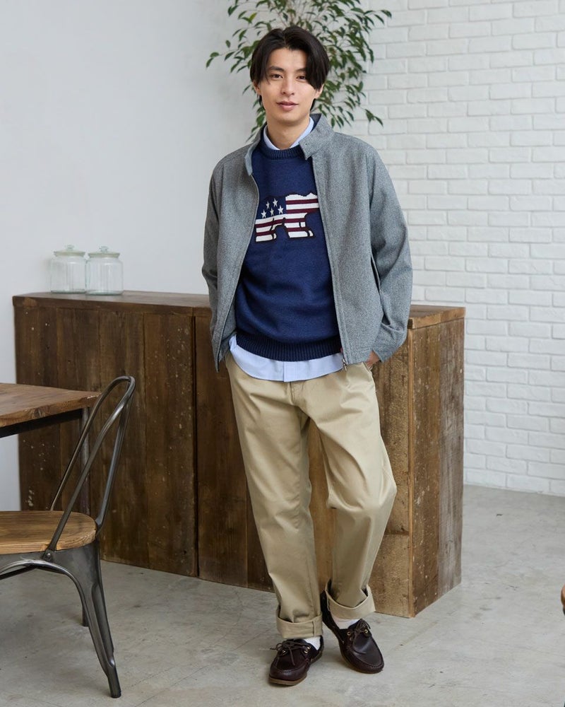 ツイードのような表情のジャージー素材でつくったハリントンジャケットです。見た目よりも軽く、伸縮性があり快適な着心地が特徴です。ご家庭での手洗い洗濯ができるのも嬉しいポイントです。 モデル身長: 180 cm 着用サイズ: L サイズ 同デザイン通常サイズはこちら Golden Bear KING SIZE(MEN 大きいサイズ) カットソー (MEN) 【着用アイテム】314RC230 オックスシャツ 315RC413 クルーネックスウェット 314RE424 クマロゴスウェット 314RC070 ボーダーニットタイ
