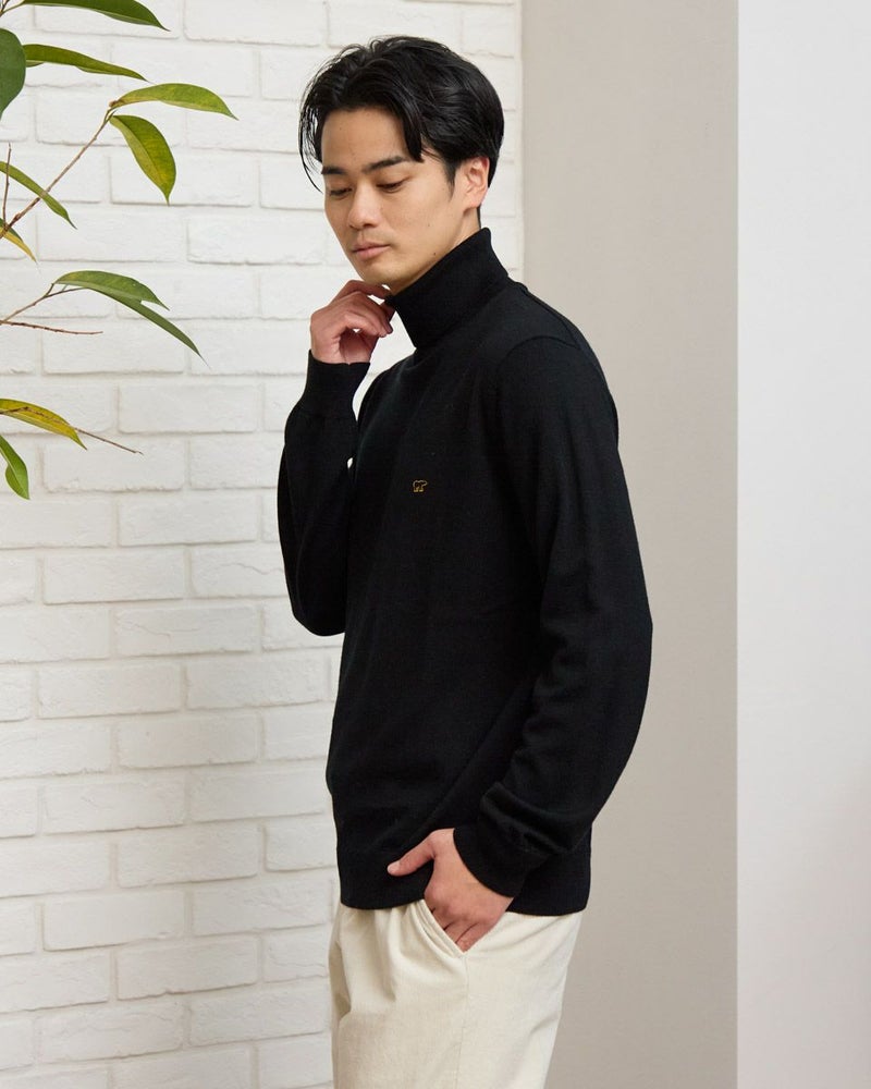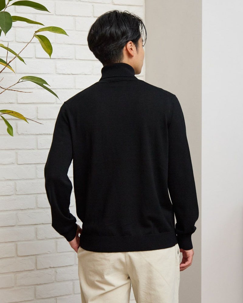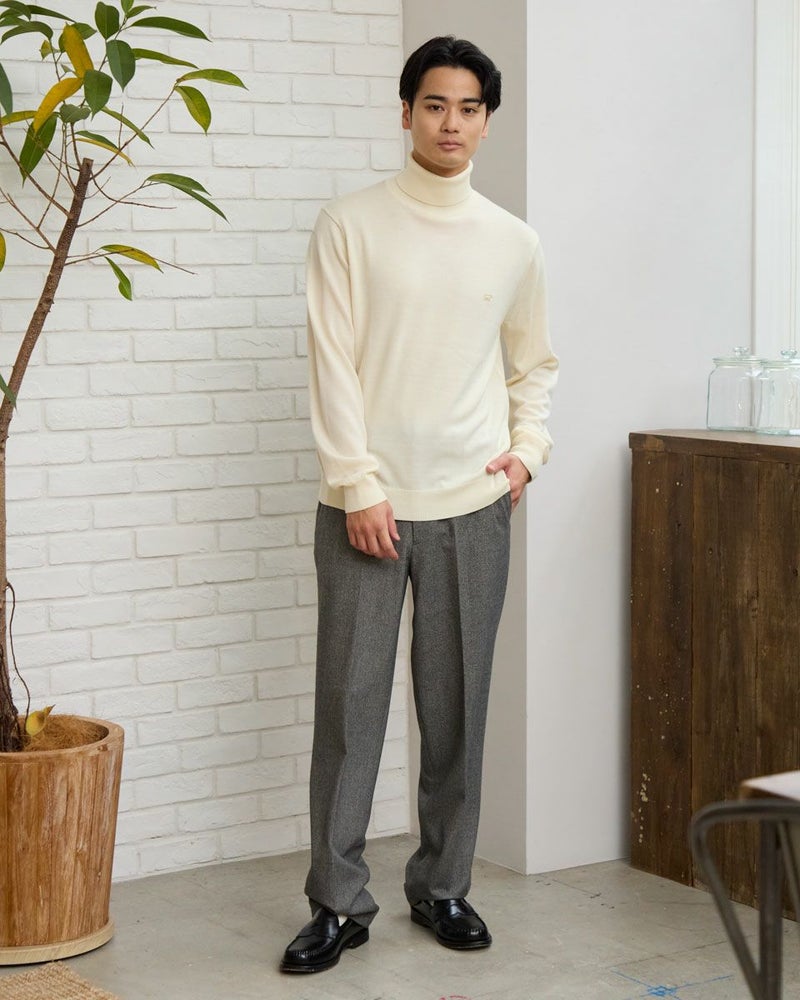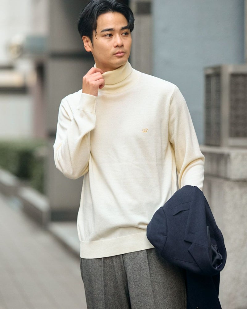 ウール100%の梳毛糸を使い14G天竺で編みたてたタートルネックニットです。家庭洗濯(手洗い)が可能で、毛玉のできにくさが特徴です。ジャケットに合うようサイズとシルエットにこだわりました。インナーとして一枚あると重宝するニットです。 モデル身長: 176 cm 着用サイズ: L サイズ Jack Nicklaus (MEN) ニット (MEN) 【着用アイテム】317RC102 ジャケット 317RD110 ジャケット 317RE130 Pコート 317RD710 イージースラックス 314RE721 ストレッチコーデュロイパンツ