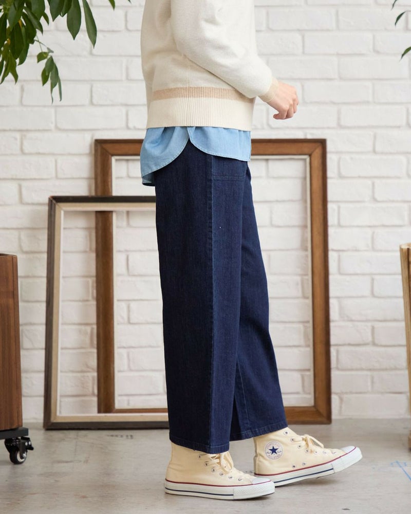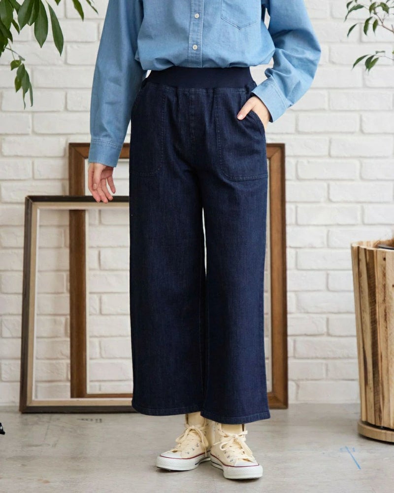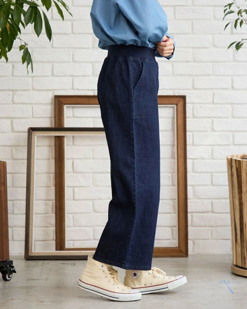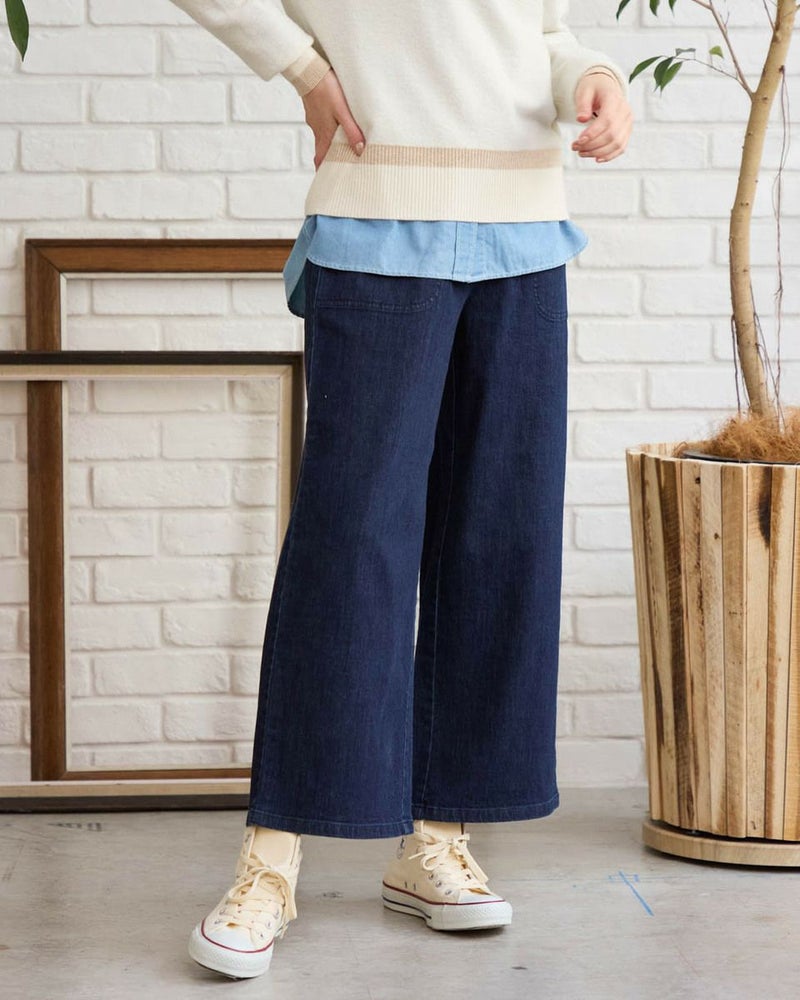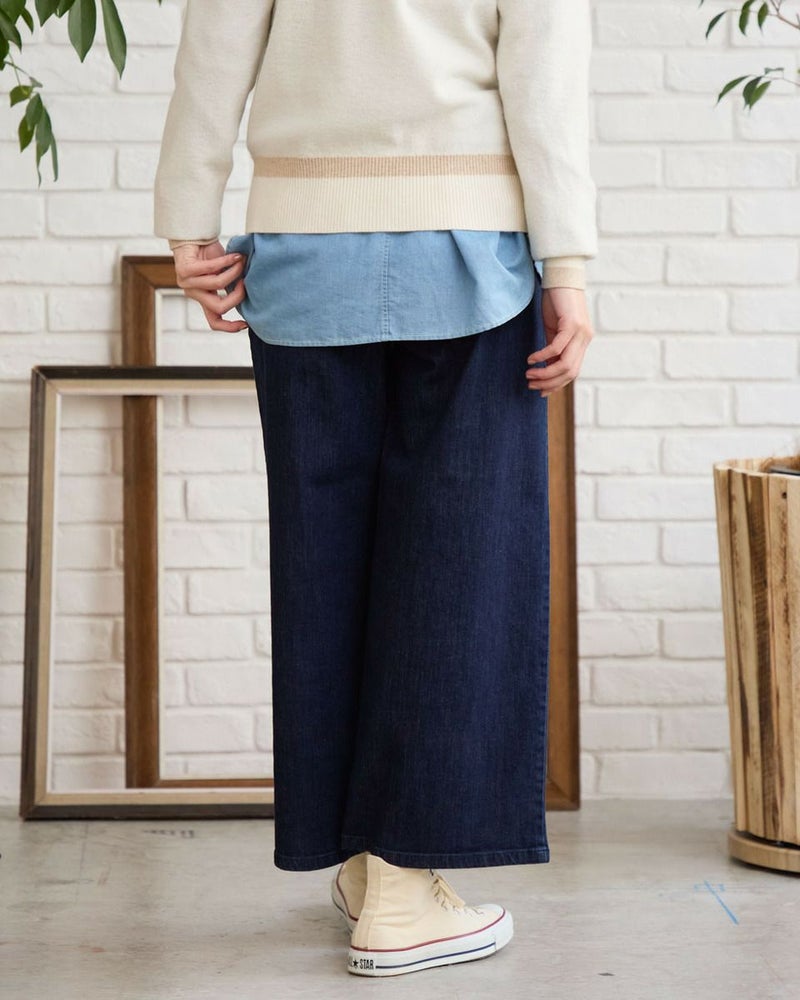467U1701 のデニムタイプです。8オンスの薄手デニムを使用しています。ウエスト部分は同様に開き無しでテレコ素材を使用していますが、ポケットの仕様は向布をステッチでたたきつける仕様に変わります。色は75のインディゴネイビー1色展開になります。 同デザイン・素材違いはこちら モデル身長: 166 cm 着用サイズ: S サイズ Golden Bear WOMEN ボトムス (WOMEN) 同デザイン大きい(3L,4Lサイズ)はこちら 【着用アイテム】471RD650 カシミヤプルオーバー