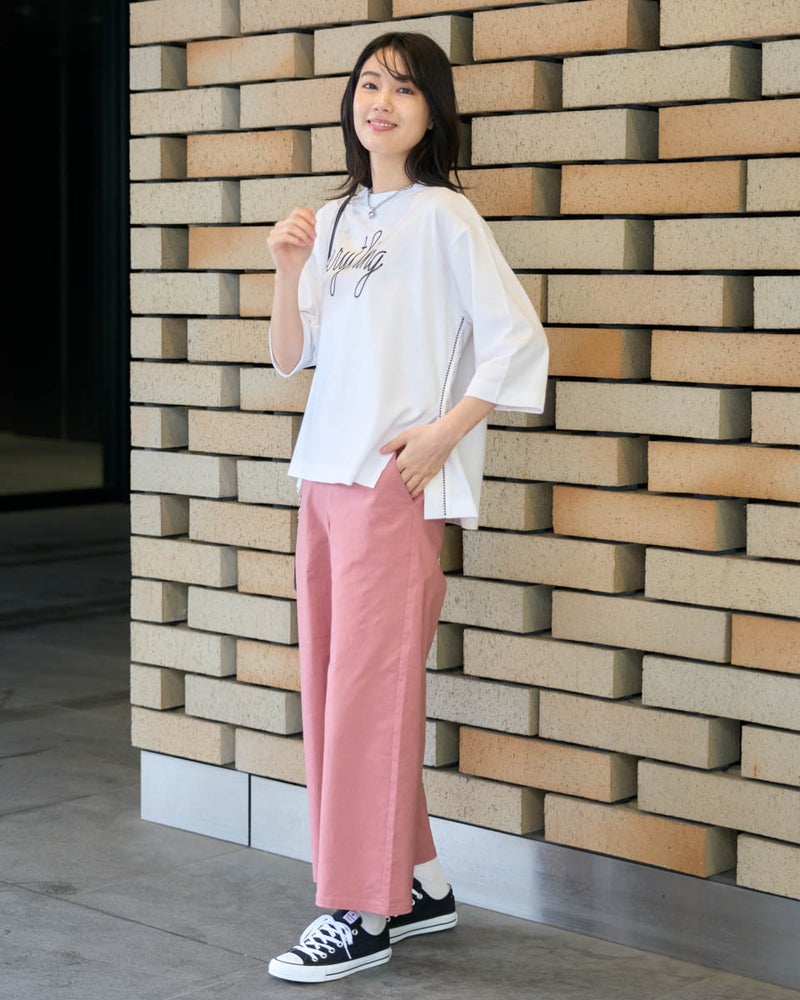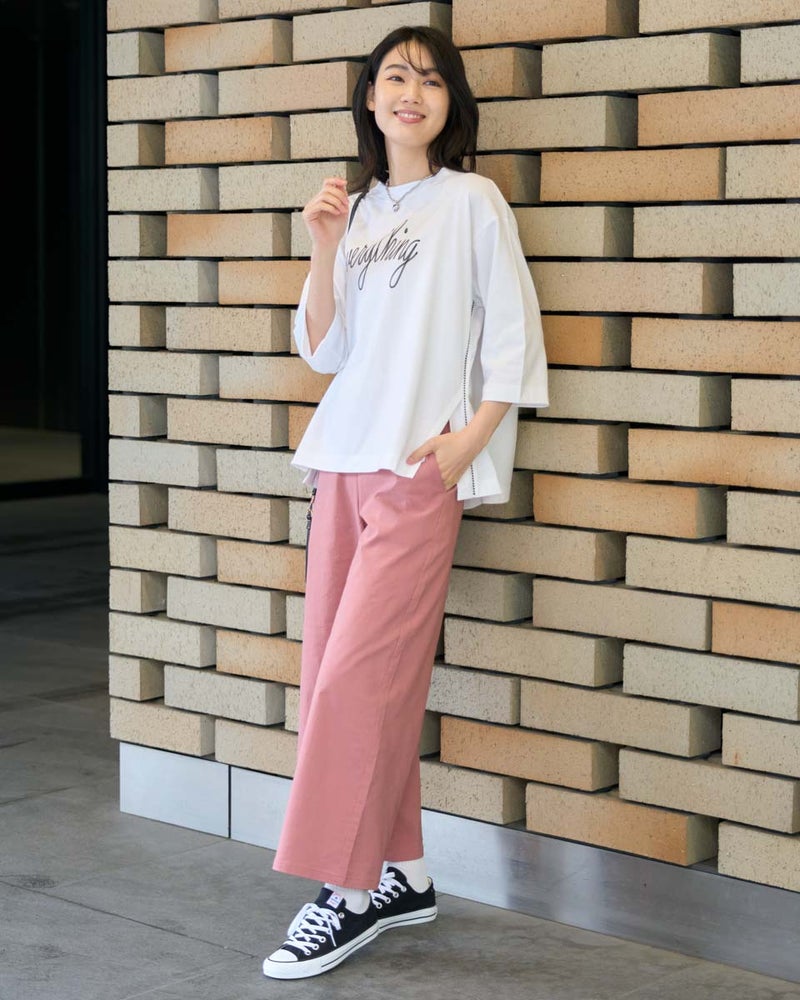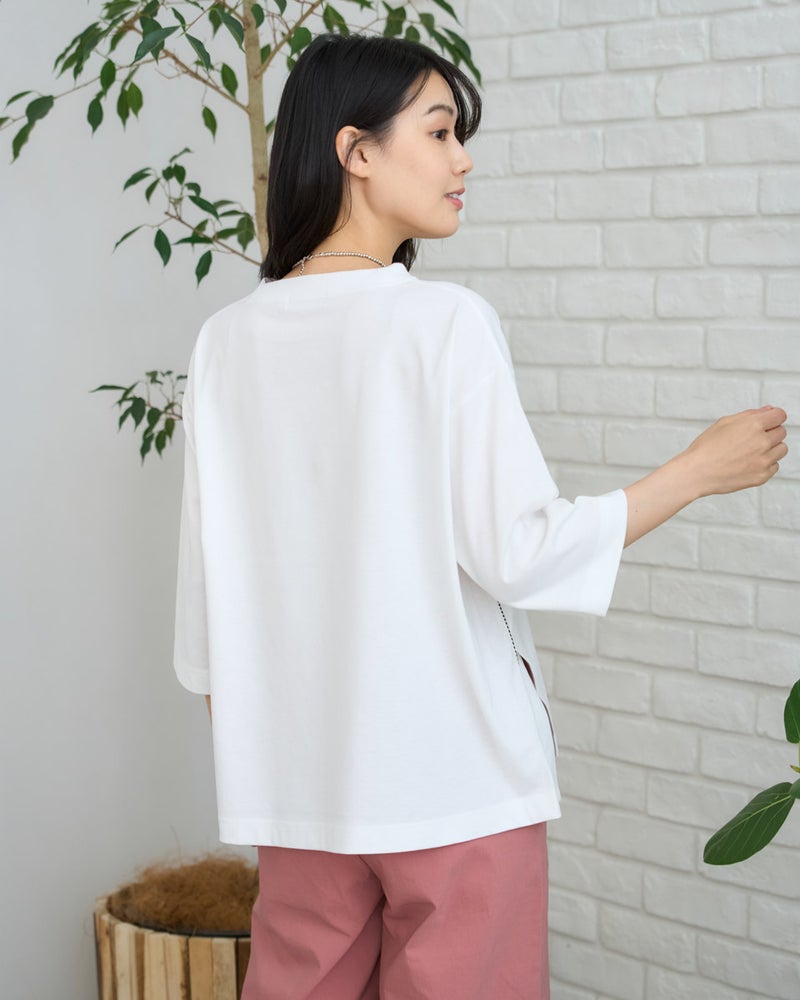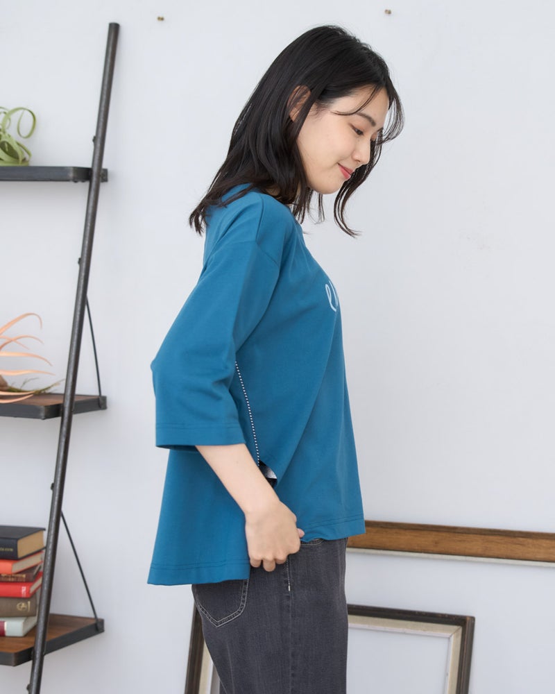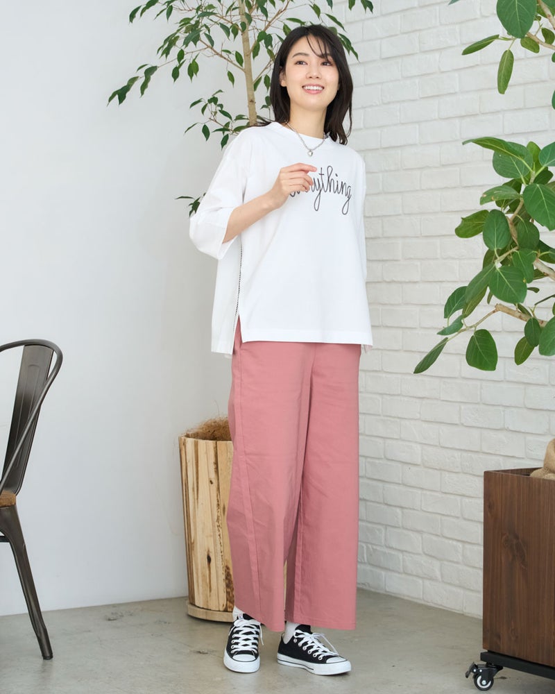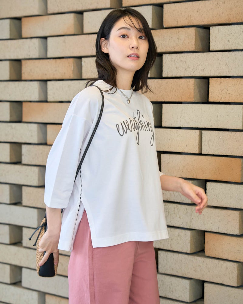 裾のヘムデザインにこだわったビッグTシャツ。サイドにあしらった飾りテープがアクセントになっています。ロープモチーフのレタードプリントもポイント。5分袖で腕まわりをさりげなくカバーし、リラックス感のある着心地です。