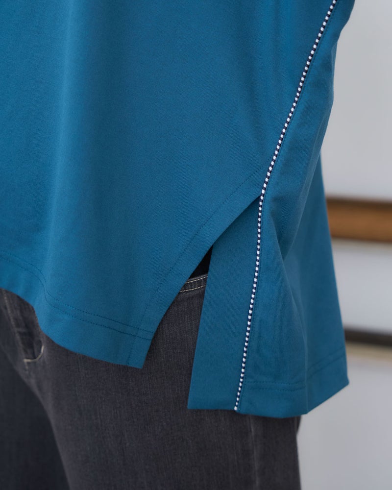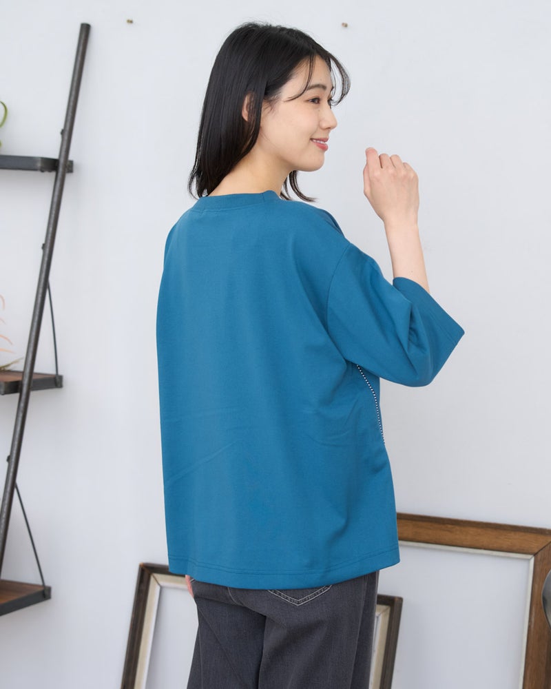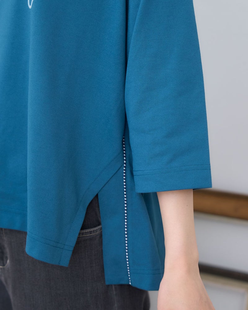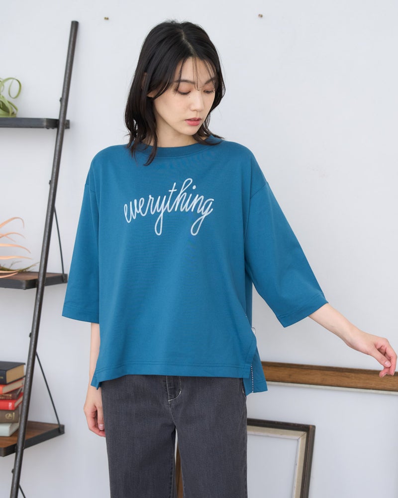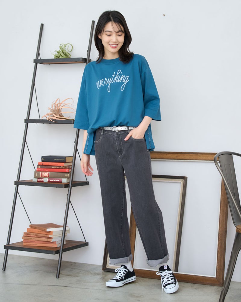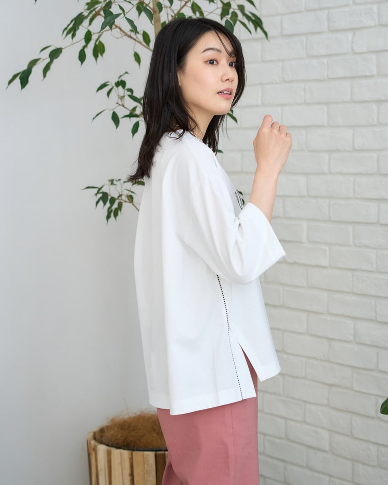 裾のヘムデザインにこだわったビッグTシャツ。サイドにあしらった飾りテープがアクセントになっています。ロープモチーフのレタードプリントもポイント。5分袖で腕まわりをさりげなくカバーし、リラックス感のある着心地です。